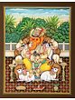 Ganesha sits here on his royal throne playing with his rats, by feeding them with motichoor laddoos. The painter has used a unique blend of colors while painting this art, as the bright yellow, green and pink colored attires of Ganesha aptly complement with his multicolored jewelled Rajasthani turban, focussing on the beautiful and colorful Rajasthani culture.