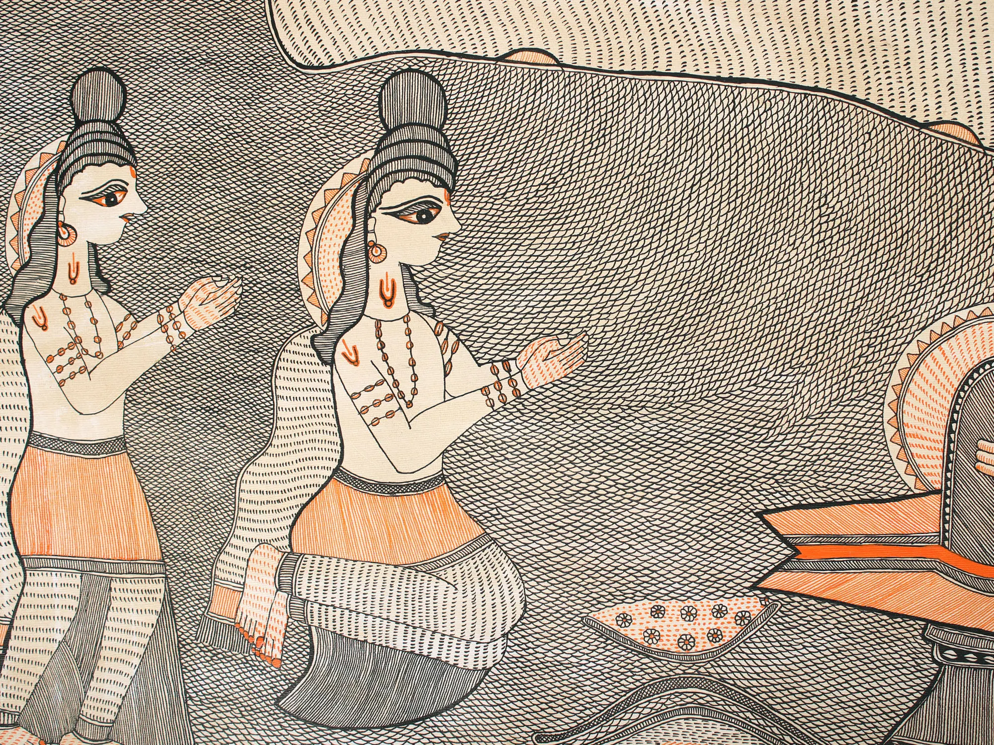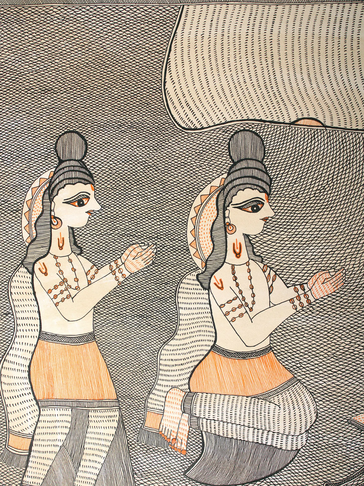 Madhubani painting is also known as Mithila art as it is practiced in the Mithila region of India and Nepal. It has specifically originated from the Madhubani district of the state of Bihar. Traditionally, the women of this region created these paintings and in recent years, it has become a widely practiced art and has now become renowned throughout the world. This art expresses the creativity and culture of the people of Mithila and is passed from one generation to another. In this way, the heritage of Madhubani art has been preserved for many decades. The subjects of these paintings are usually religion, love, and fertility. Sometimes, social events like festivals, weddings, and royal court are also depicted in the paintings. The most commonly painted designs and themes are the forms of Hindu Gods and Goddesses such as Ganesha, Shiva, Saraswati, Lakshmi, Krishna, and Ram. The characteristic features of Madhubani paintings are their vibrant colors and eye-catching geometrical patterns. The empty spaces are filled with traditional motifs such as floral and foliate patterns, animals, birds, geometrical structures, and other designs. The local artists create these paintings using a variety of items such as matchsticks, twigs, brushes, pens, or even their own fingers. The paints are usually made with natural dyes and pigments.