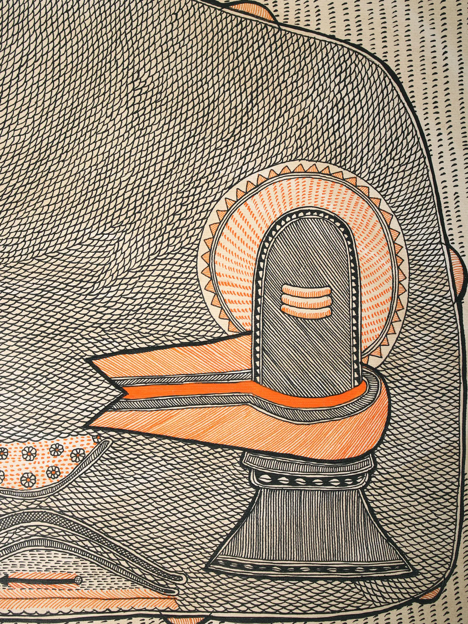Each stroke of watercolor on the handmade paper speaks to a tradition of artistic mastery. The artist meticulously delineates figures and forms, utilizing fine lines and a distinctive hatching technique that imbues the scene with texture and depth. The pigments, chosen with care, lend a subtle vibrancy to this narrative, celebrating the rich heritage of Indian folk art. You'll appreciate the delicate rendering of adornments and the expressive posture of the divine figures.