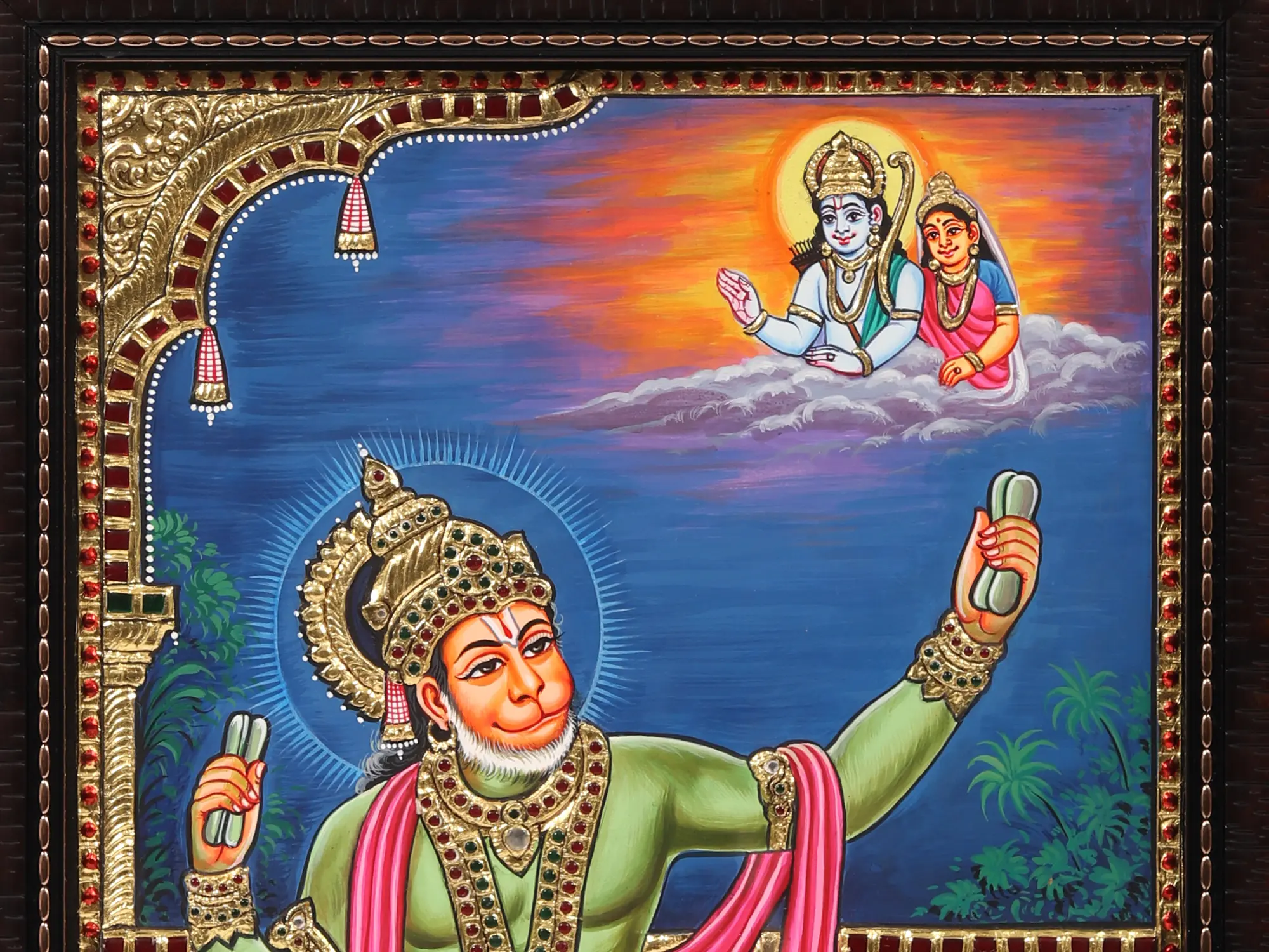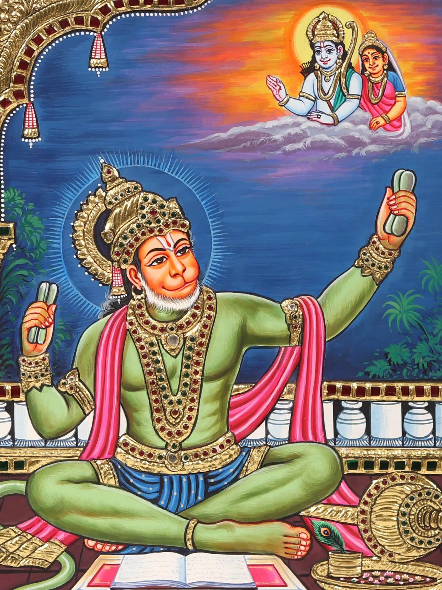 Brought to you in this fine Tanjore - witness Ram Bhakt Hanuman immersed in the ecstasy of Japa, a powerful depiction of devotion and meditation. His reverential posture, playing kartal and focused remembrance of his swami serve as an inspiration to seek spiritual enlightenment through unwavering dedication, reminding us of the transformative power of faith.