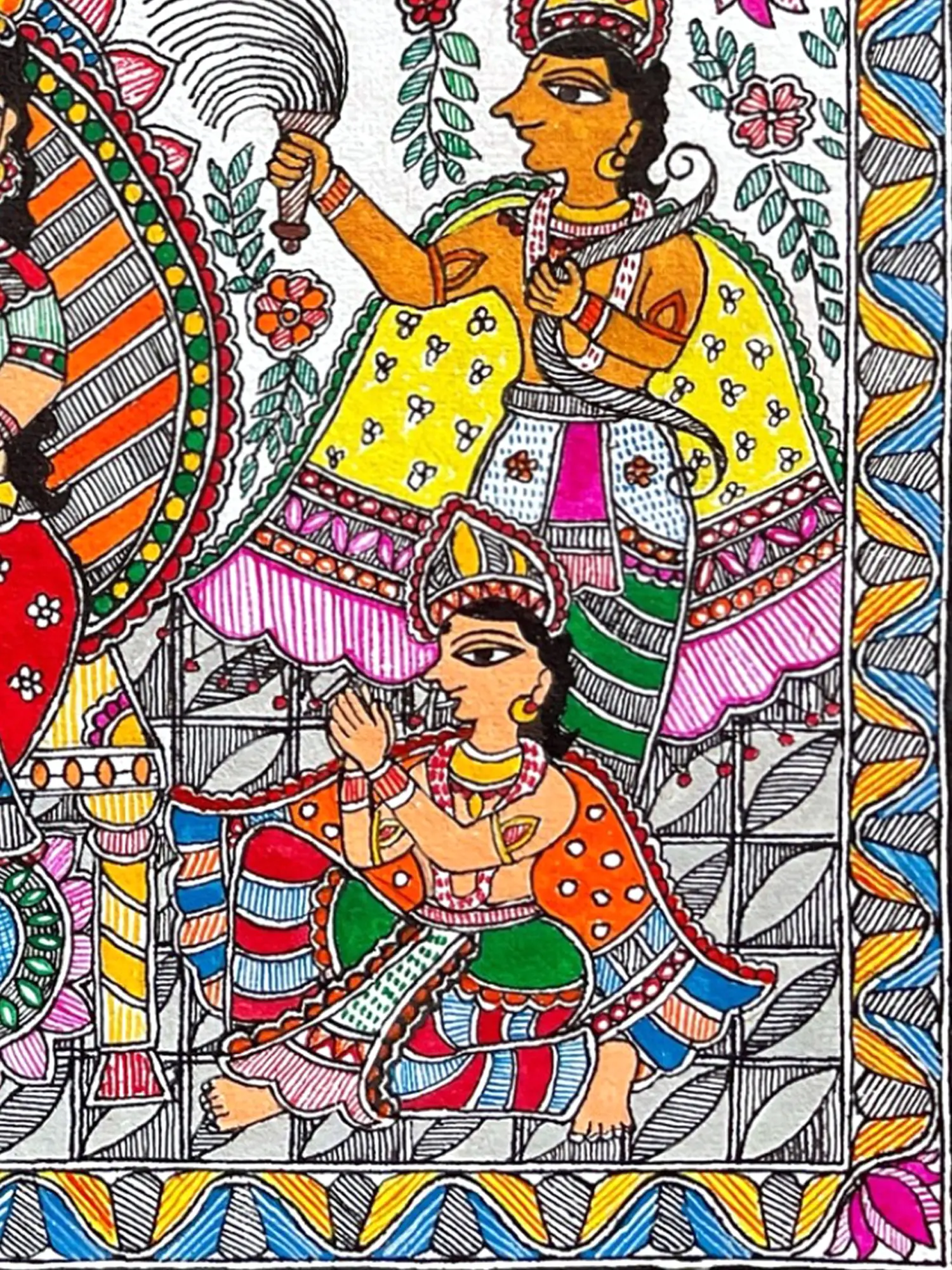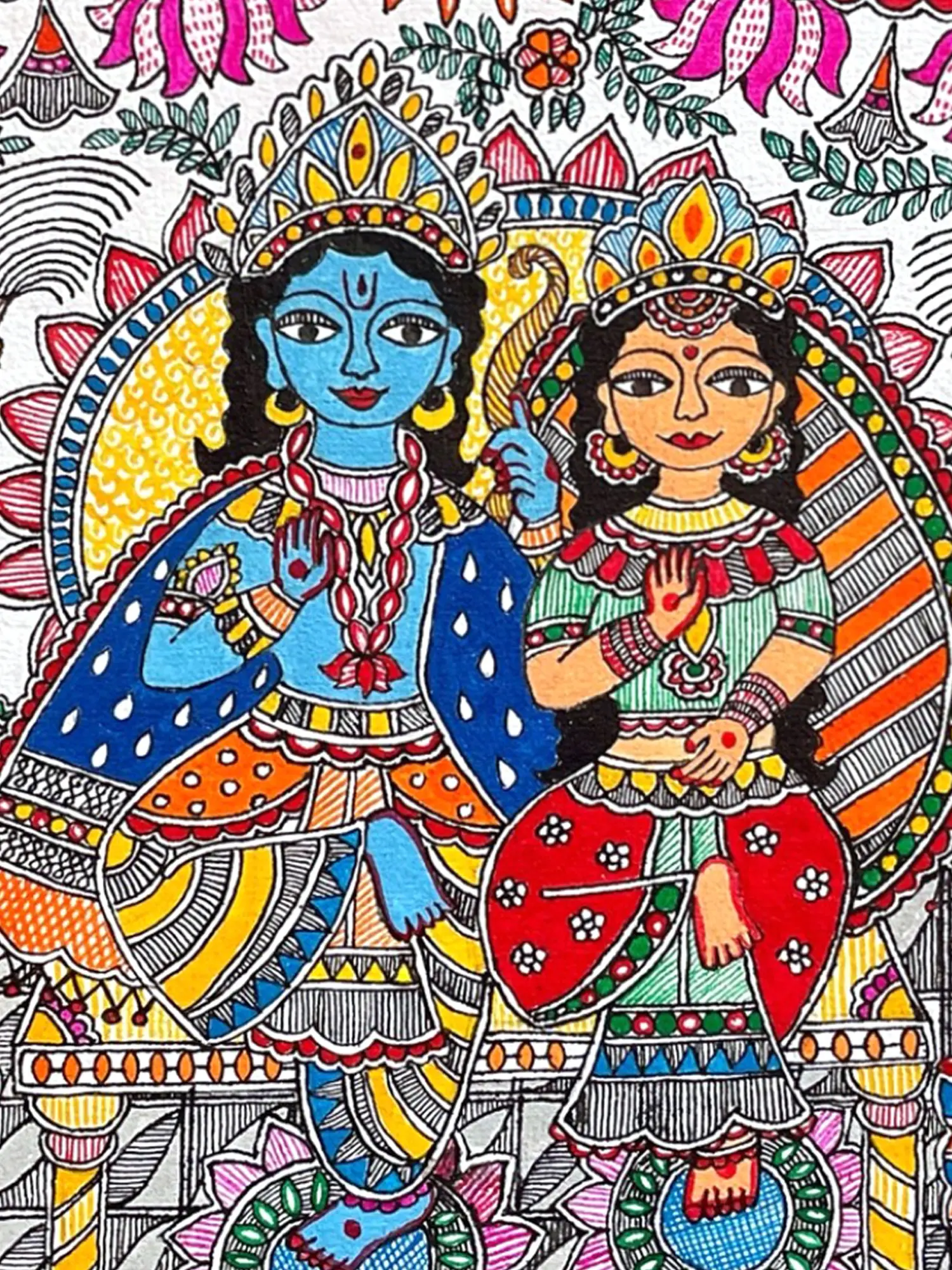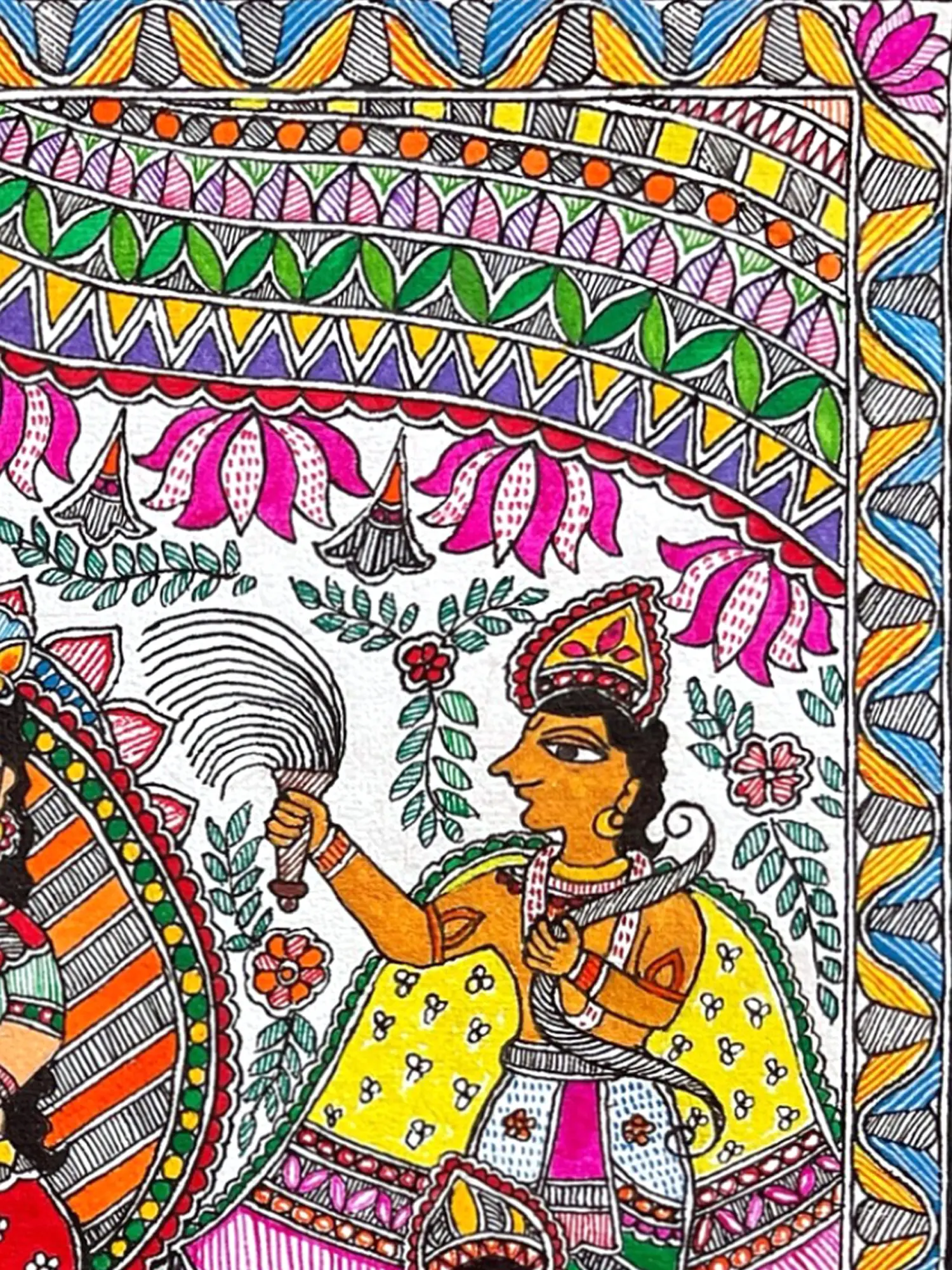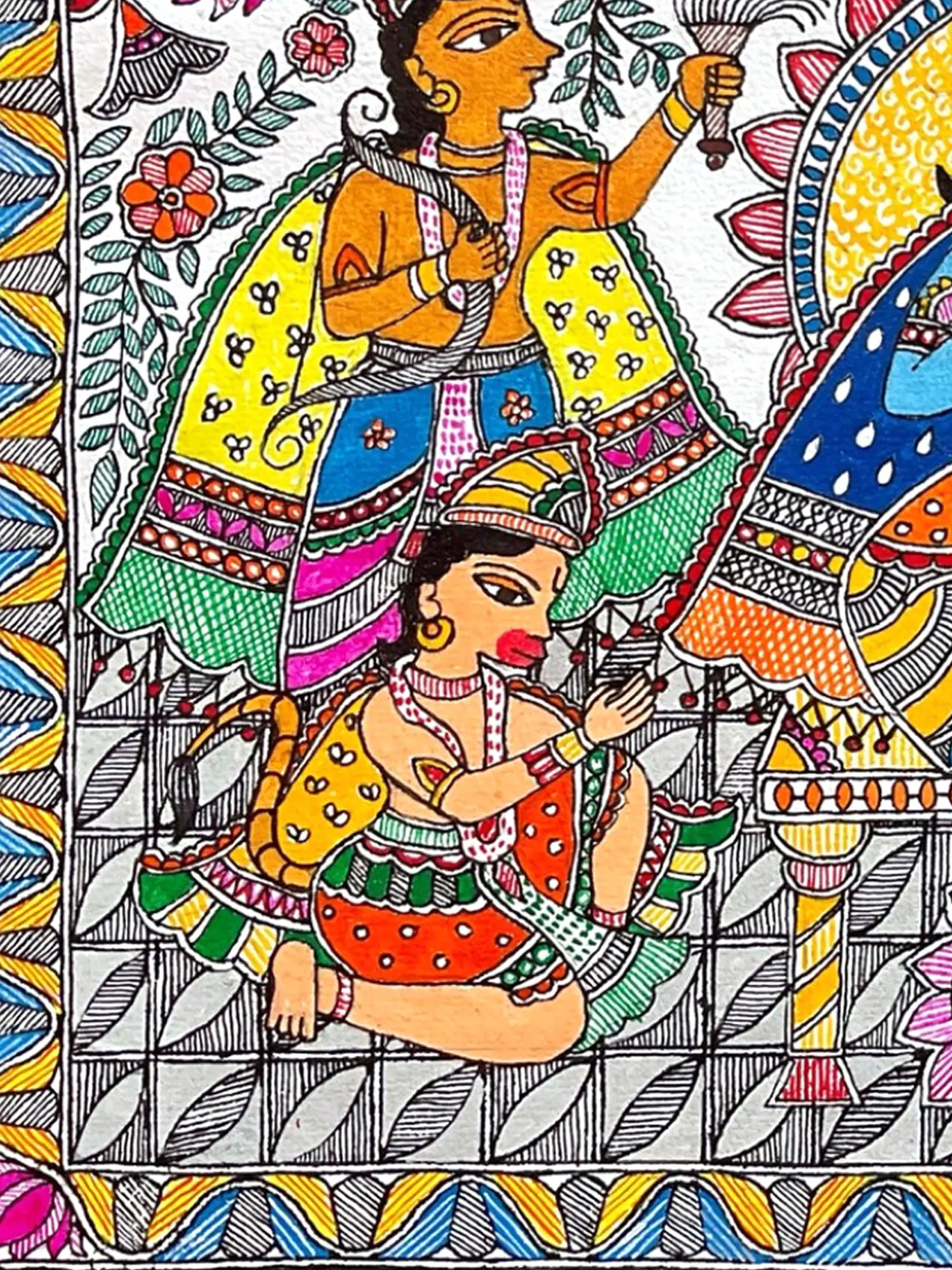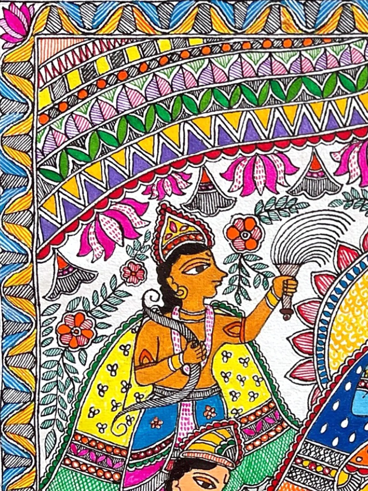 Crafted with meticulous care by the acclaimed artist Urwashi Nirala, this piece embodies the vibrant spirit of Madhubani folk art. It is rendered using premium Fevicryl acrylics on a beautifully textured handmade sheet, ensuring a tactile and visually rich experience. Each stroke is a deliberate dance, showcasing a dedication to preserving traditional techniques and breathing new life into ancient stories.
