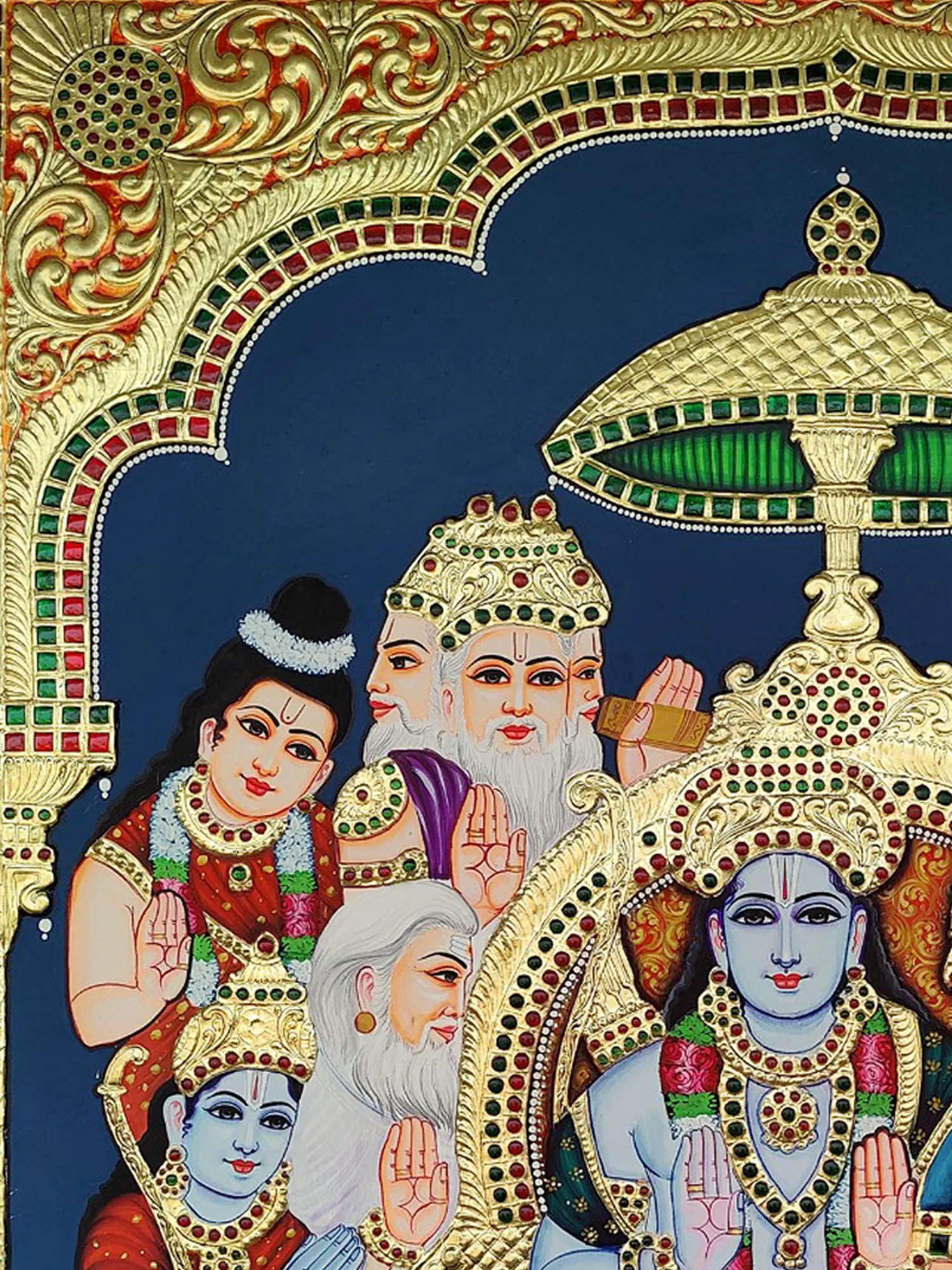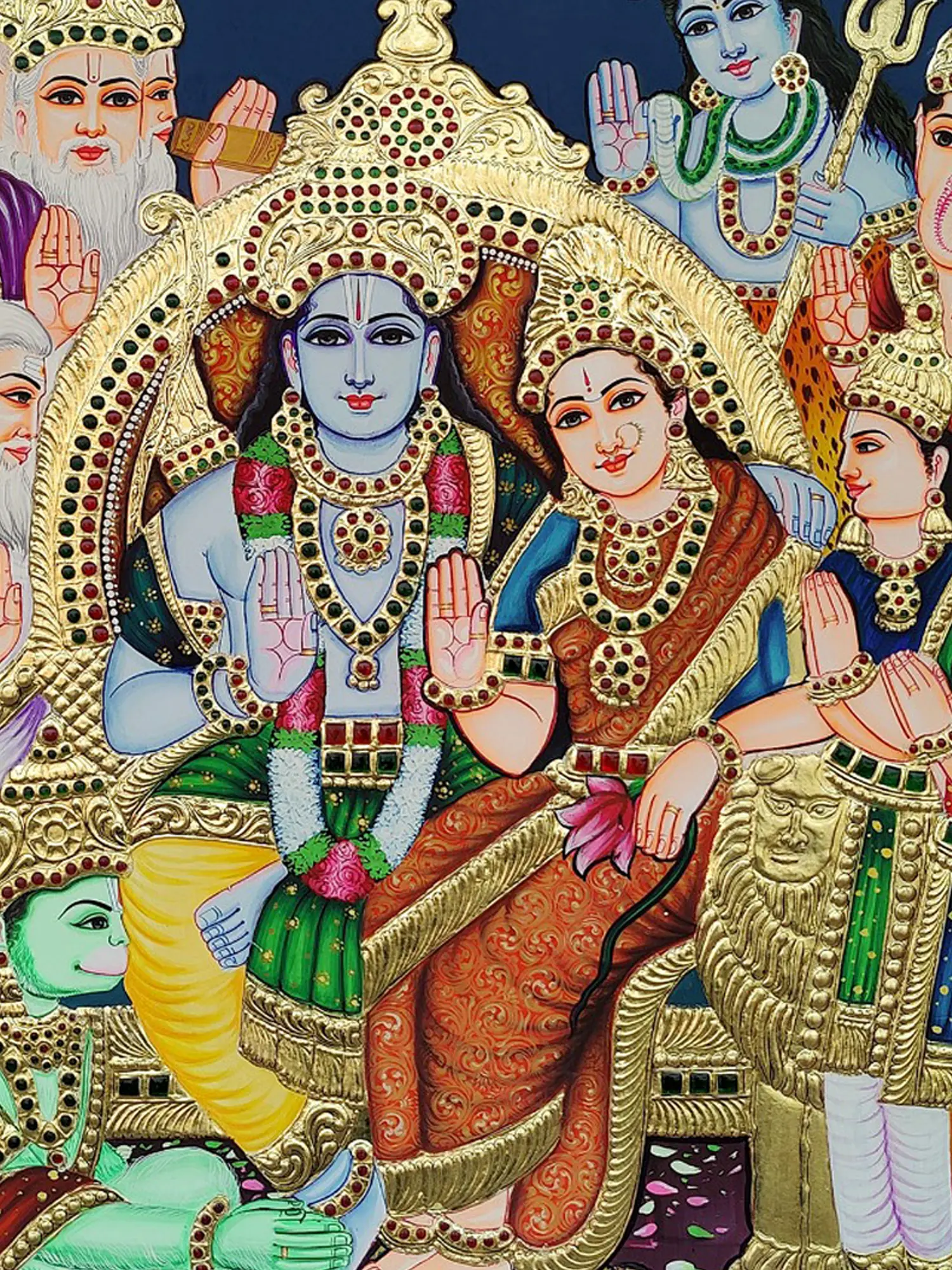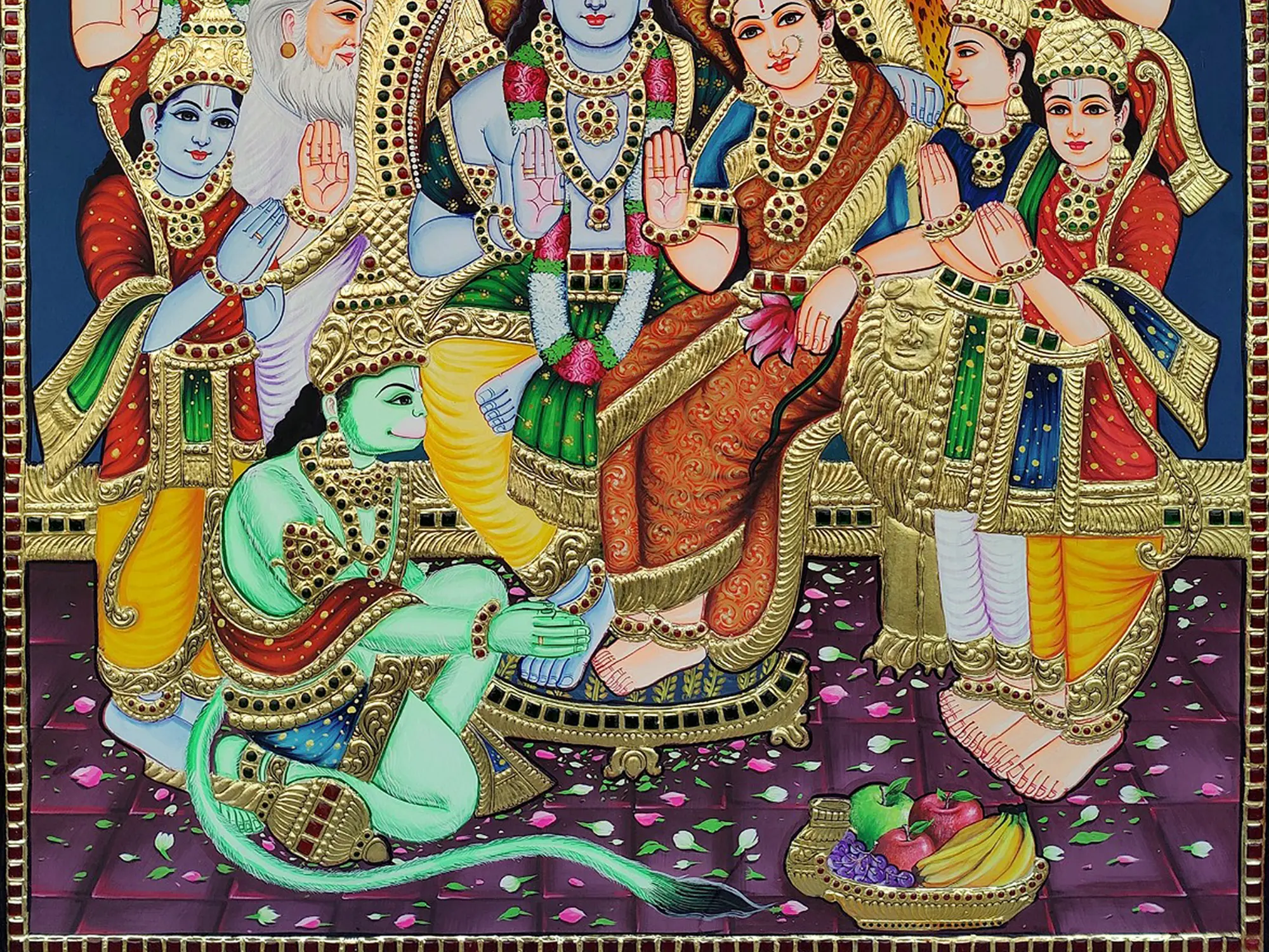 The Ram Darbar Tanjore is also referred to as the Rama Pattabhishekam. This painting serves as a reminder of good's victory over evil. It commemorates Lord Rama's coronation upon his return to Ayodhya after slaying Ravana. This "Ram Darbar" Tanjore Painting by My Angadi is an opulent masterpiece that transcends artistic boundaries. Crafted with exquisite gold plating and intricate embossing, this work of art radiates divine splendor. The judicious use of colorful stones further elevates its celestial allure, creating a captivating visual tapestry.
