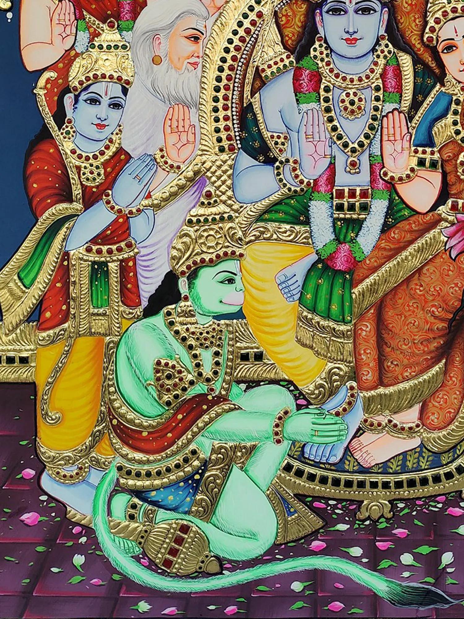 At the heart of the composition, Lord Rama and Goddess Sita grace the artwork with serene expressions, surrounded by a divine assembly. To the left, the devoted Lord Hanuman sits at Lord Rama's feet, symbolizing unwavering loyalty and devotion. The meticulously detailed figures of Lord Lakshman, Rishi Vaishisht, Lord Narada, and Lord Brahma stand in harmonious alignment, each contributing to the divine tableau.
