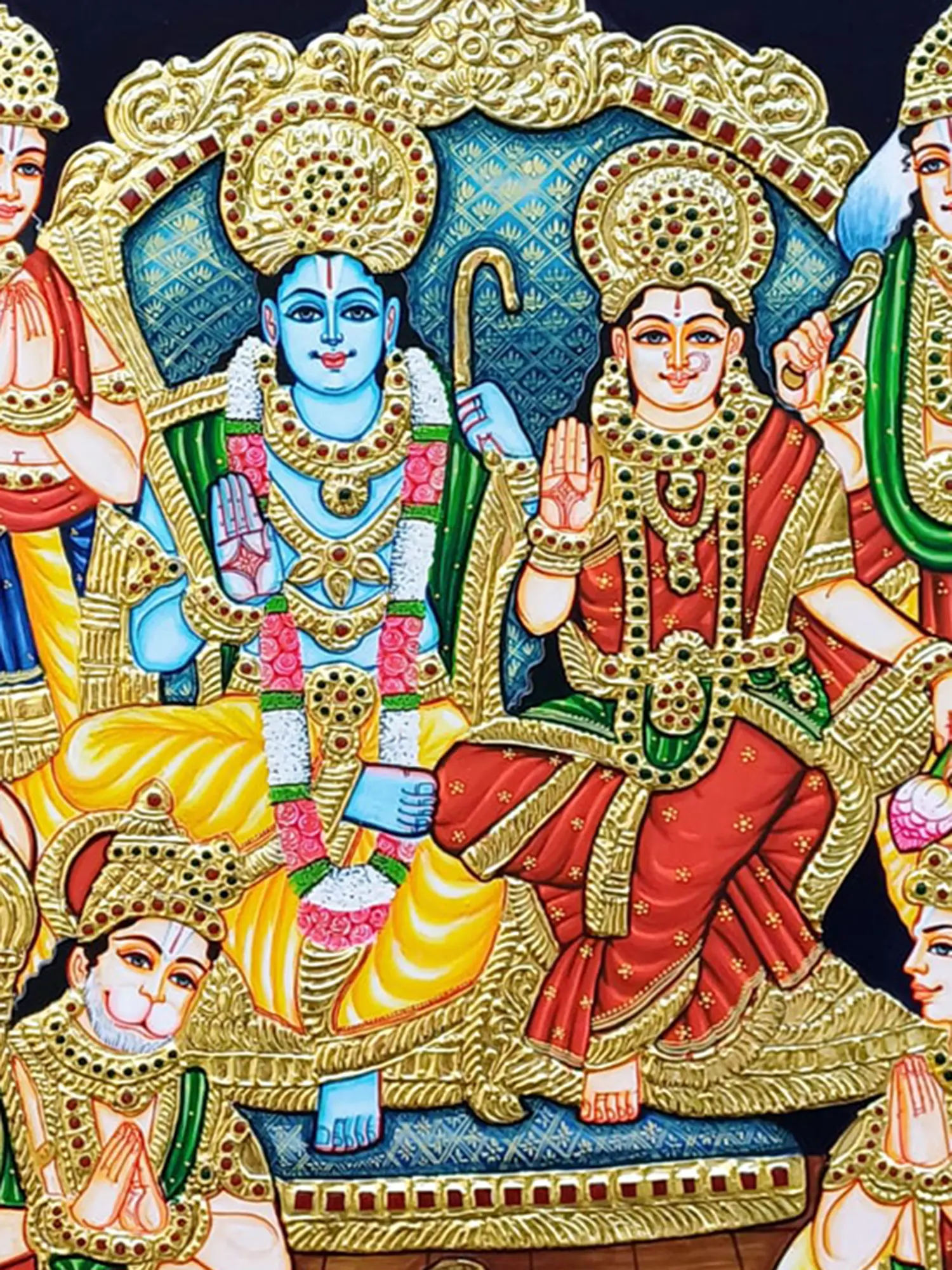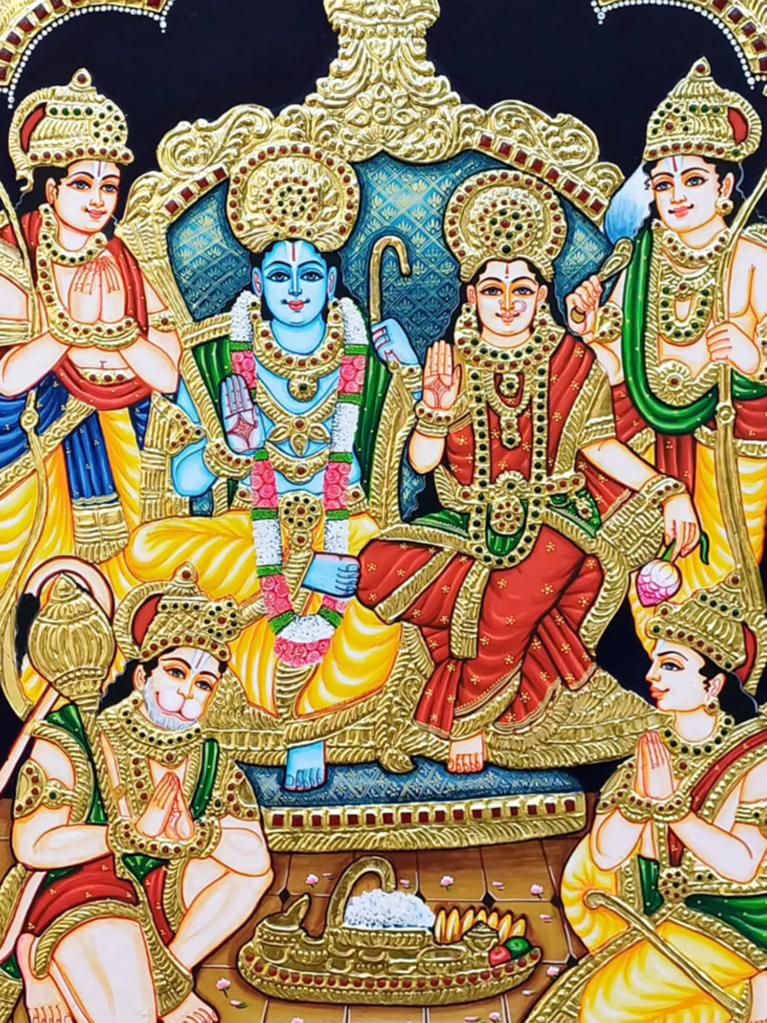 This Ram Darbar Tanjore painting captures the grandeur of Sri Rama’s court in a symphony of traditional colors and gold work.
