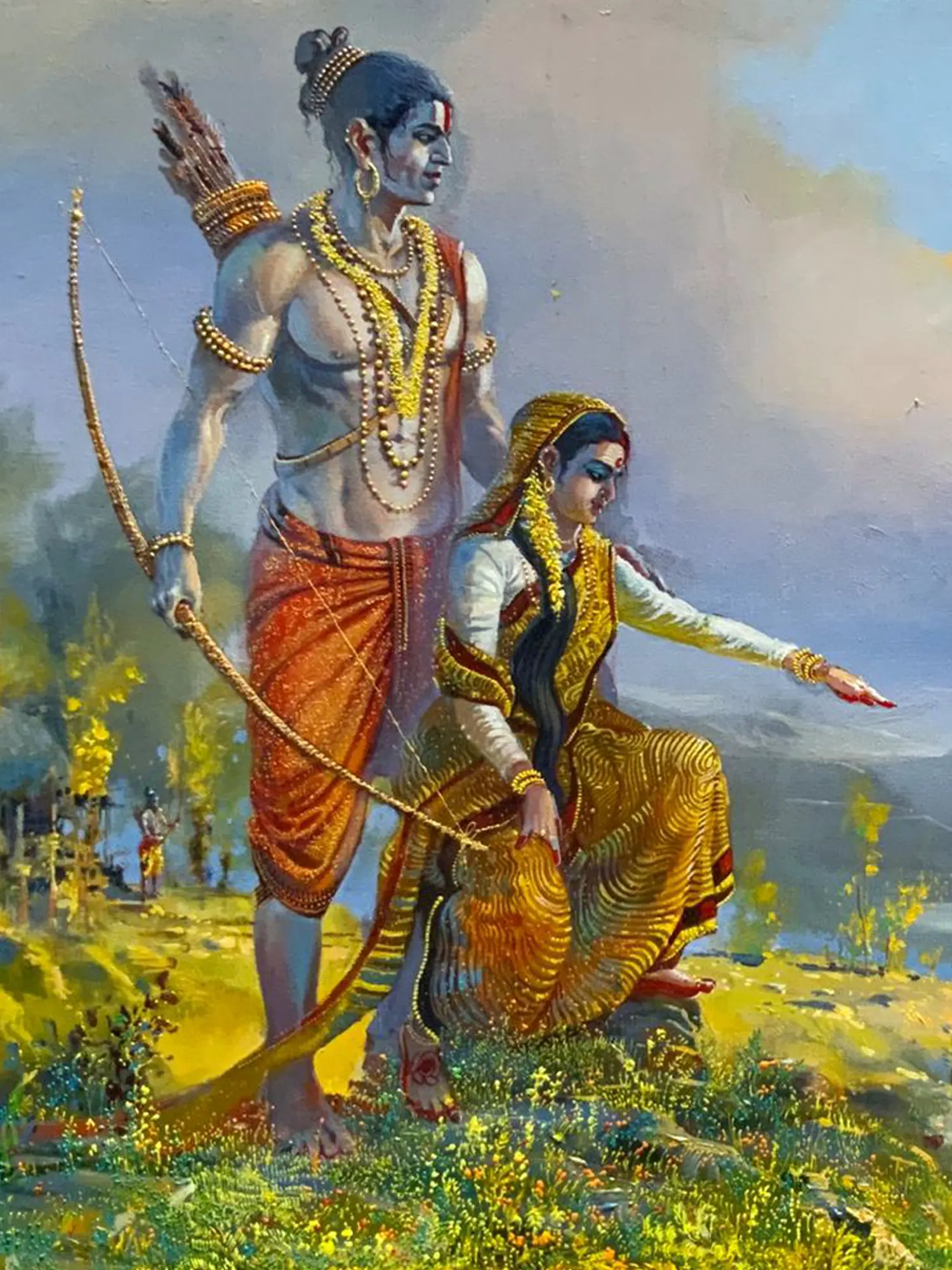 This depiction draws inspiration from the epic Ramayana, a cornerstone of Indian literature and philosophy. It captures a poignant episode of Rama and Sita's exile to the forest, a period signifying their unwavering righteousness and resilience amidst adversity. The scene evokes a sense of spiritual journey and the profound bond between divine beings, inviting you to connect with these ancient narratives and their enduring wisdom.