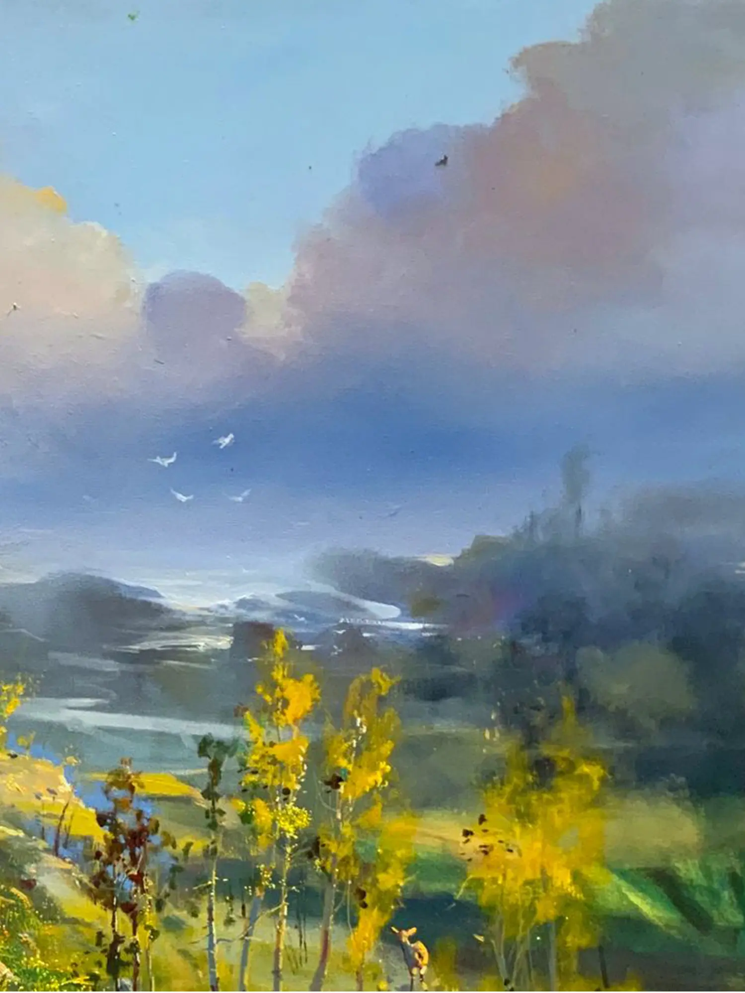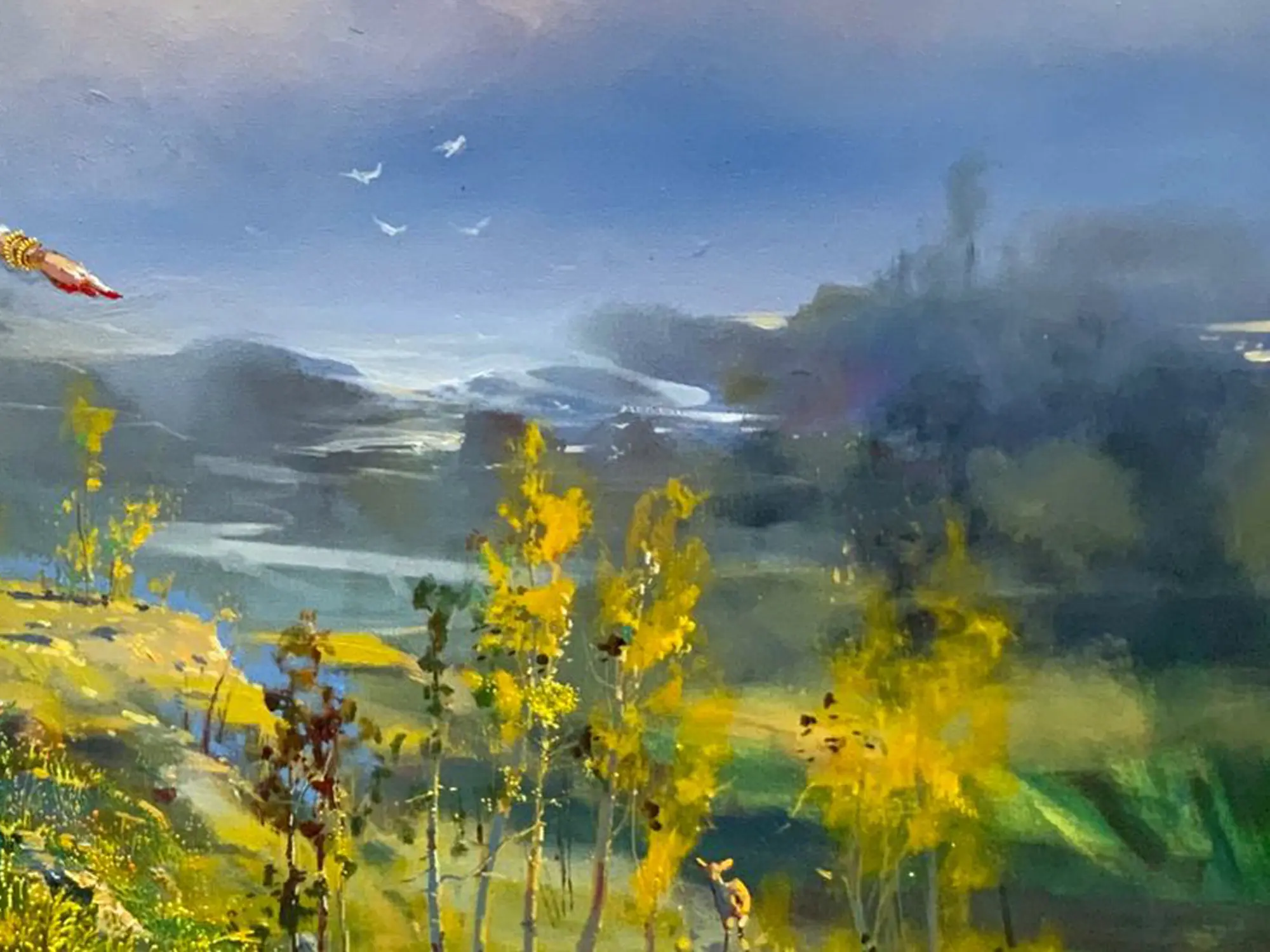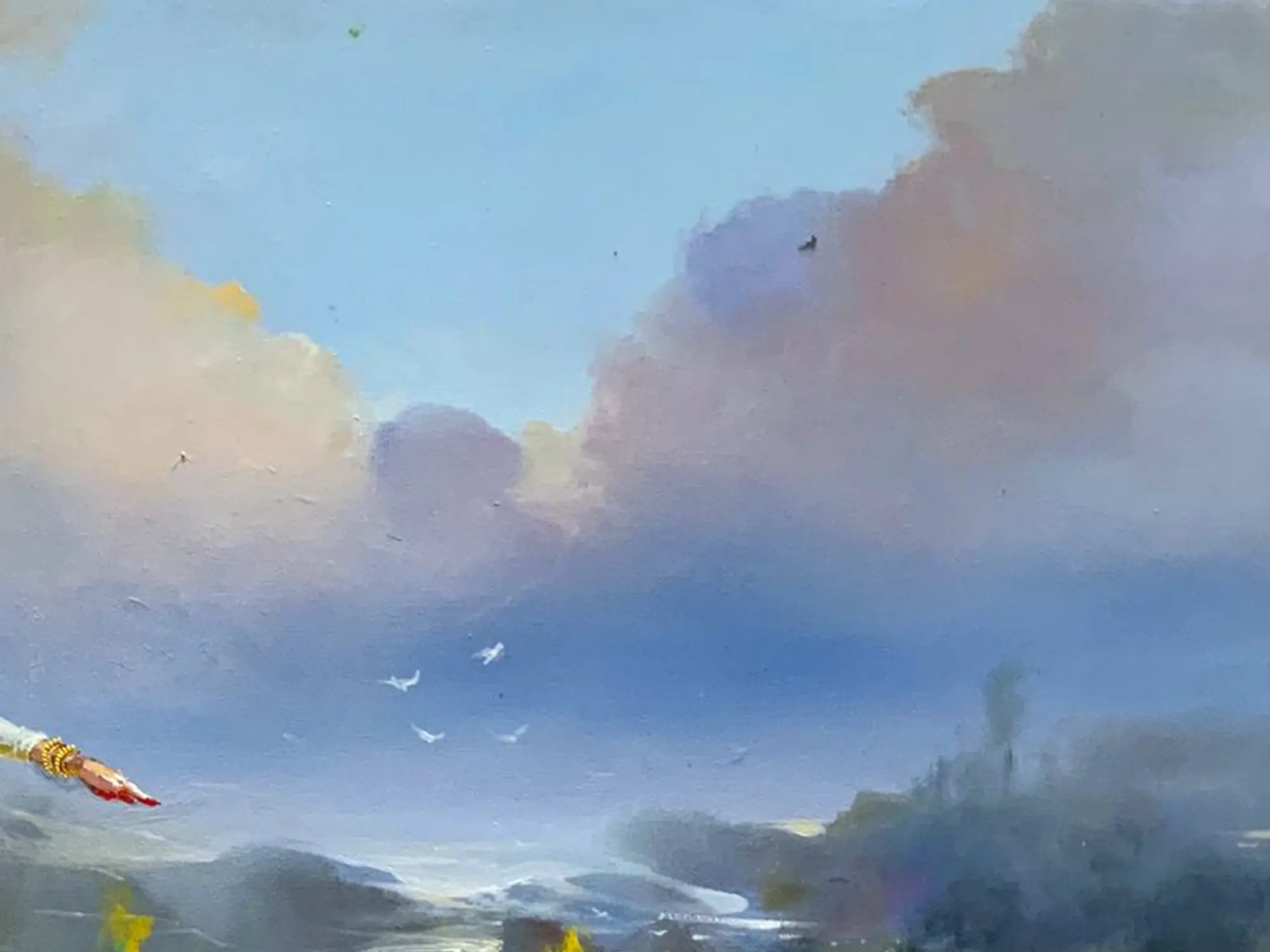The expansive 30 by 50-inch canvas unfolds a breathtaking panorama, where vibrant hues and nuanced light breathe life into the portrayal. You'll appreciate the striking contrast between the figures' detailed adornments and the softly rendered, expansive sky, creating a dynamic visual experience. The artist’s skillful composition guides your eye through the gentle undulations of the land and the delicate dance of clouds, imbuing the artwork with a sense of both vastness and intimacy.