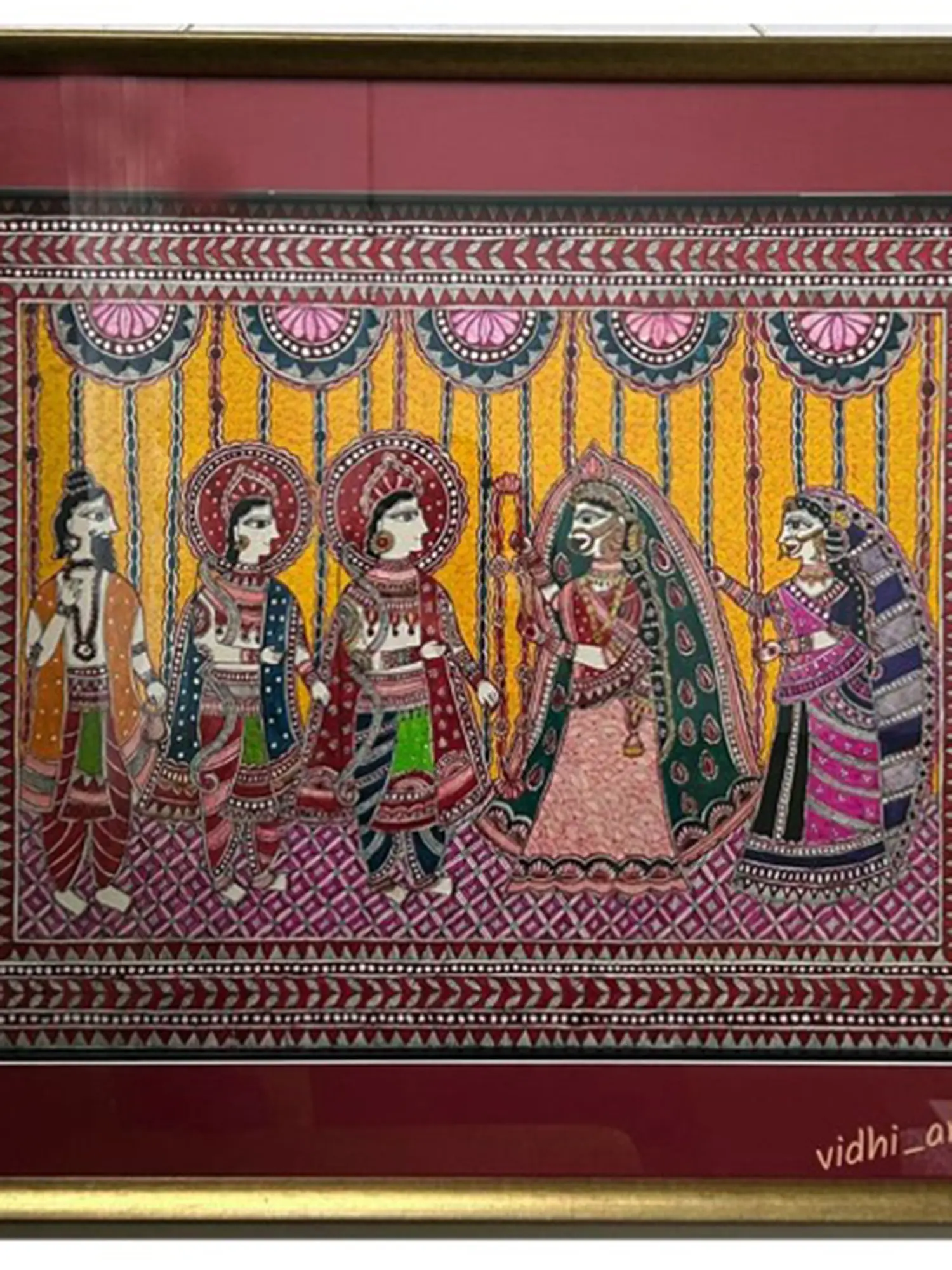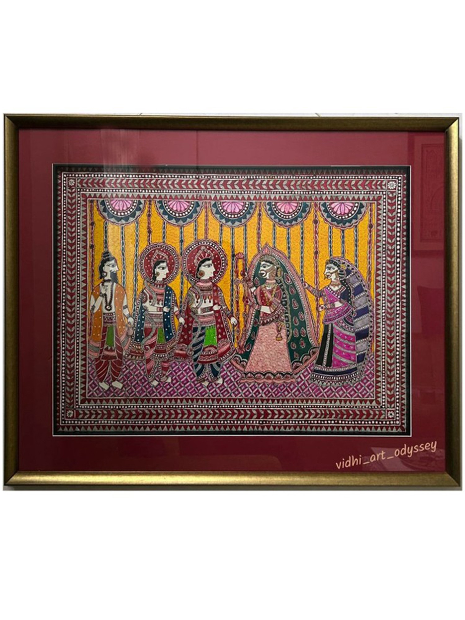 This exquisite artwork brings to life one of the most revered unions in Hindu mythology, the marriage of Lord Rama and Princess Sita. Rendered in the distinctive Mithila art style, the painting is a vibrant celebration of this auspicious occasion, steeped in tradition and cultural significance. Mithila art, also known as Madhubani painting, originates from the Mithila region of India and Nepal and is traditionally created by women using natural dyes and pigments on cloth, paper, or walls. This contemporary interpretation by Vidhi Joshi, executed on canvas with acrylics, honors the rich heritage of this folk art while imbuing it with a modern sensibility. The composition depicts the sacred ceremony with meticulous detail. Lord Rama, the embodiment of righteousness and virtue, stands with his celestial bride, Sita, who symbolizes purity, devotion, and strength. They are flanked by divine and human figures, likely representing family members and deities witnessing the union. Each character is adorned in ornate traditional attire, characterized by bold outlines and intricate patterns that are hallmarks of Mithila art. The use of earthy tones punctuated by splashes of vibrant color creates a visually captivating scene that resonates with the joyful spirit of a wedding celebration. The artist’s skillful hand is evident in the delicate lines, the symmetrical arrangements, and the overall harmonious balance of the artwork. ––––––––––