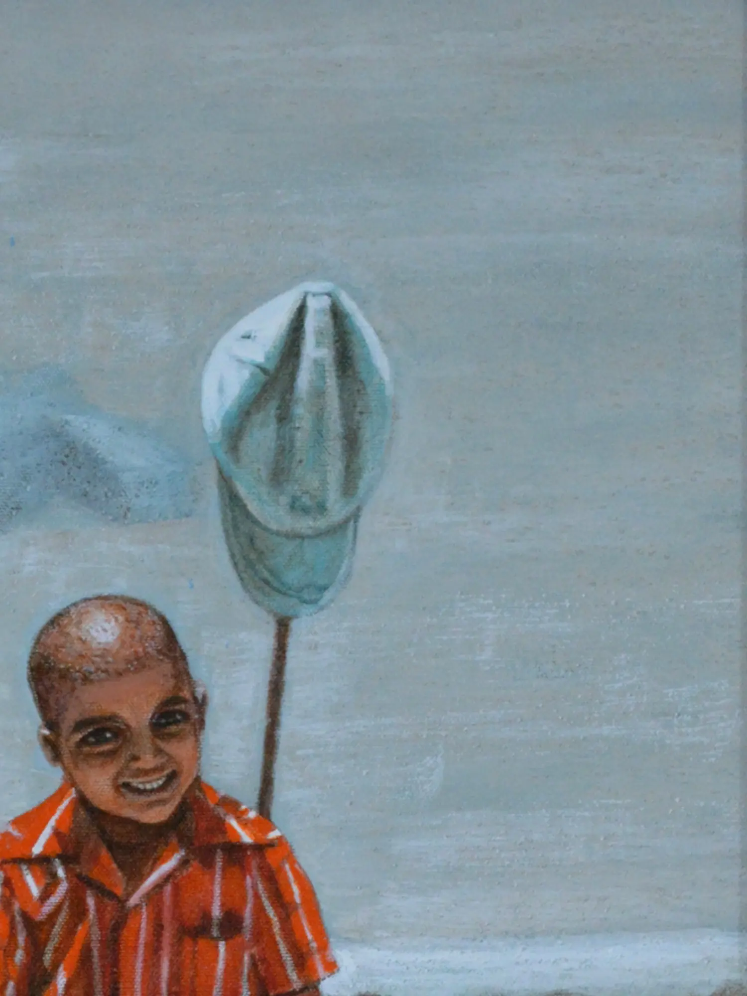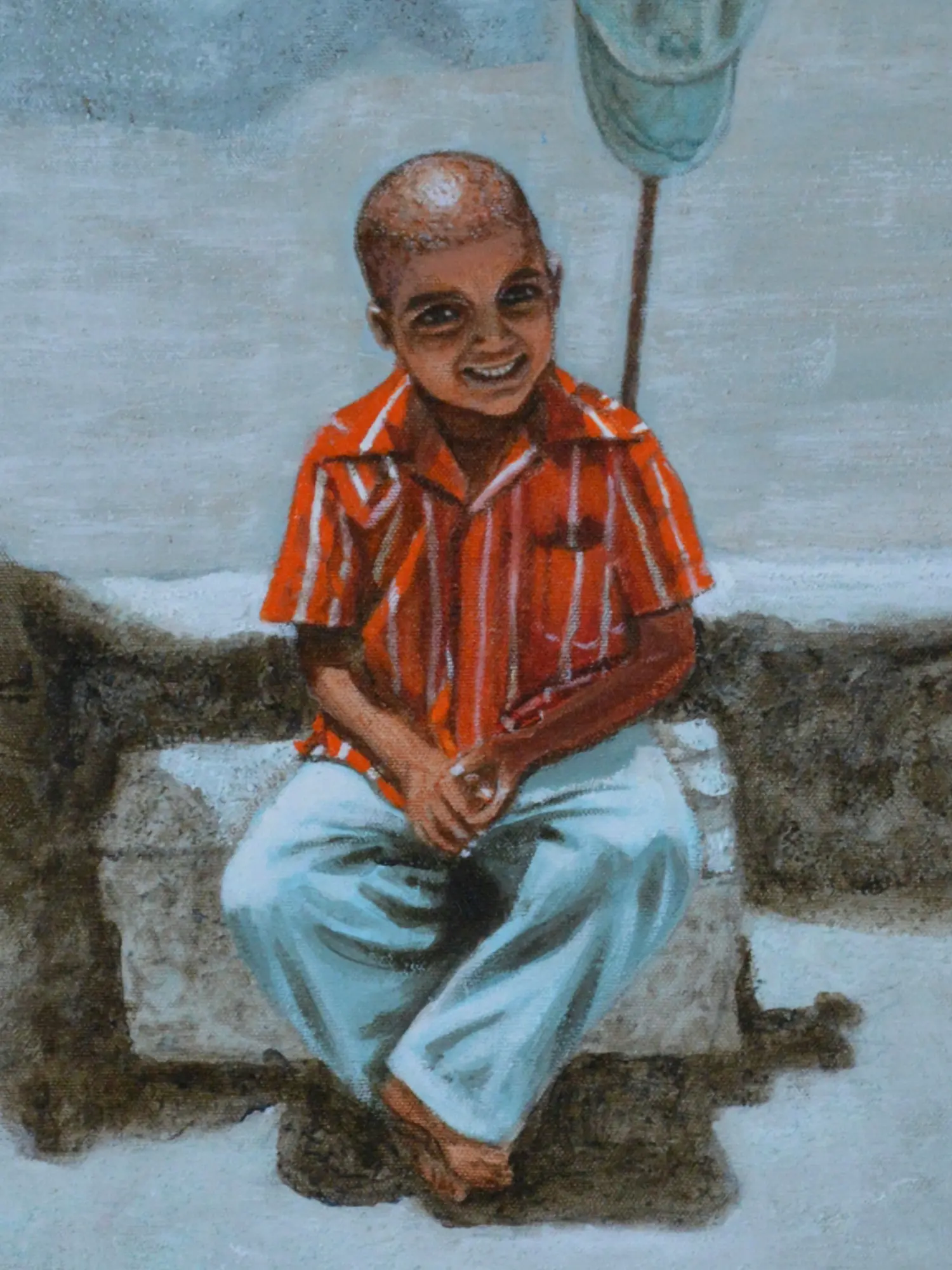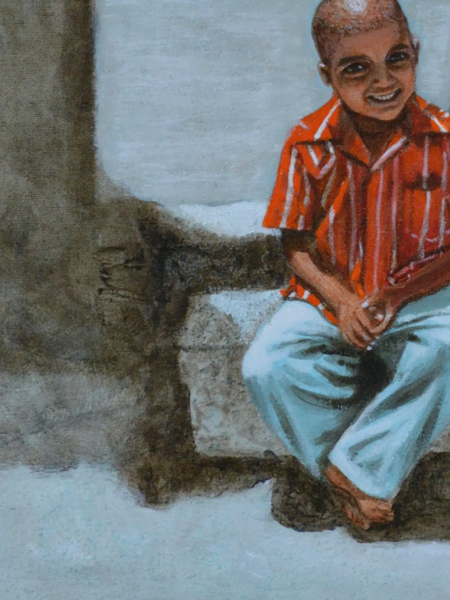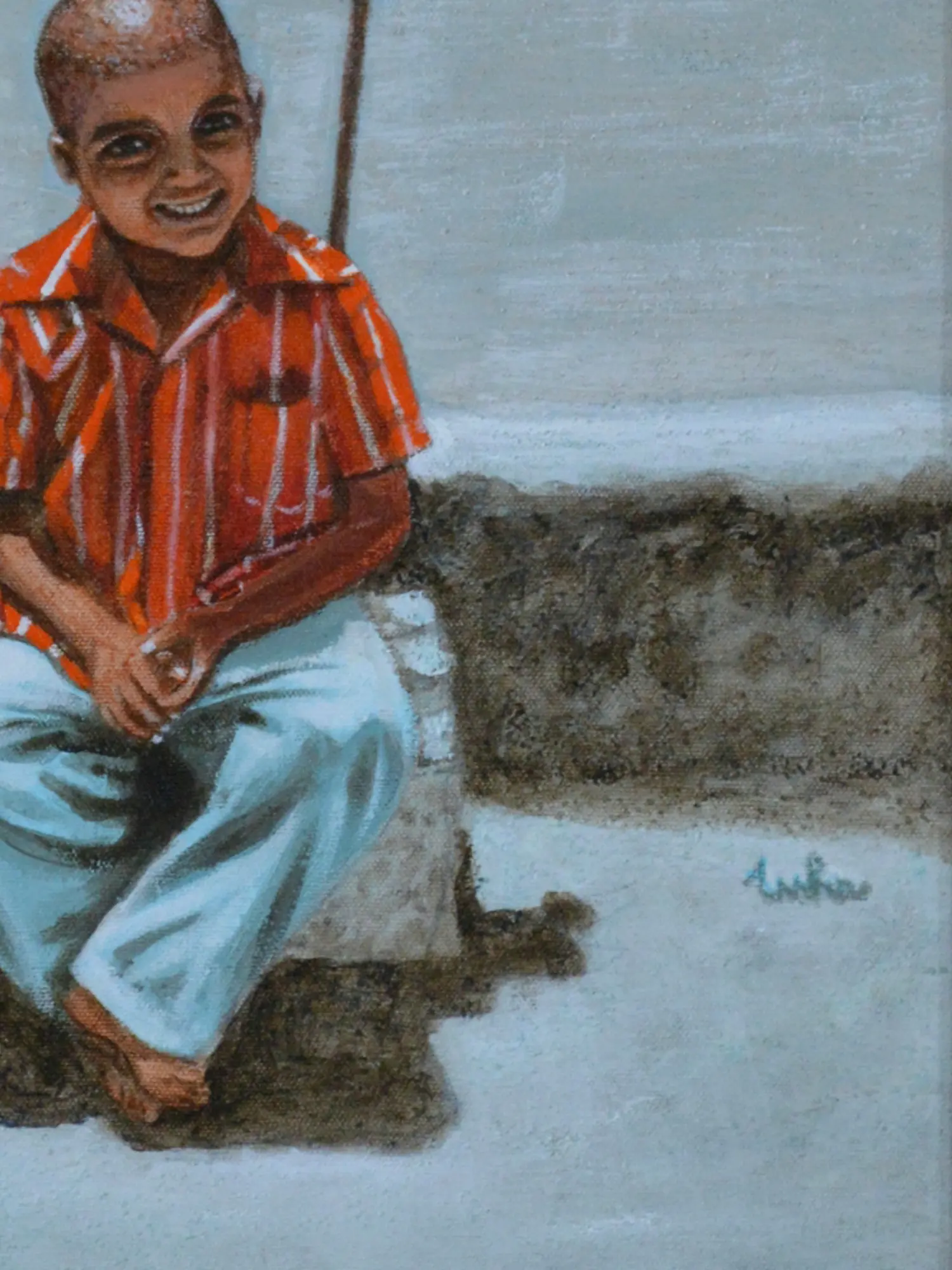 The subject is presented in a thoughtful composition, with the warm tones of their attire creating a striking contrast against the serene, cooler background. Subtle yet masterful brushwork defines the contours of the face and the playful drape of clothing, drawing your eye to the luminous spark of their expression. Measuring 20 inches in height and 16 inches in width, this artwork possesses an intimate scale, making it an accessible yet impactful addition to any collection. The detail of the hanging cap, rendered with a soft, almost ethereal quality, adds a layer of poignant detail that invites contemplation.