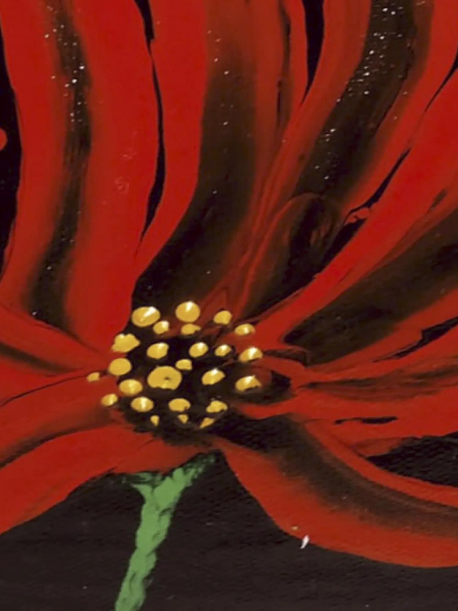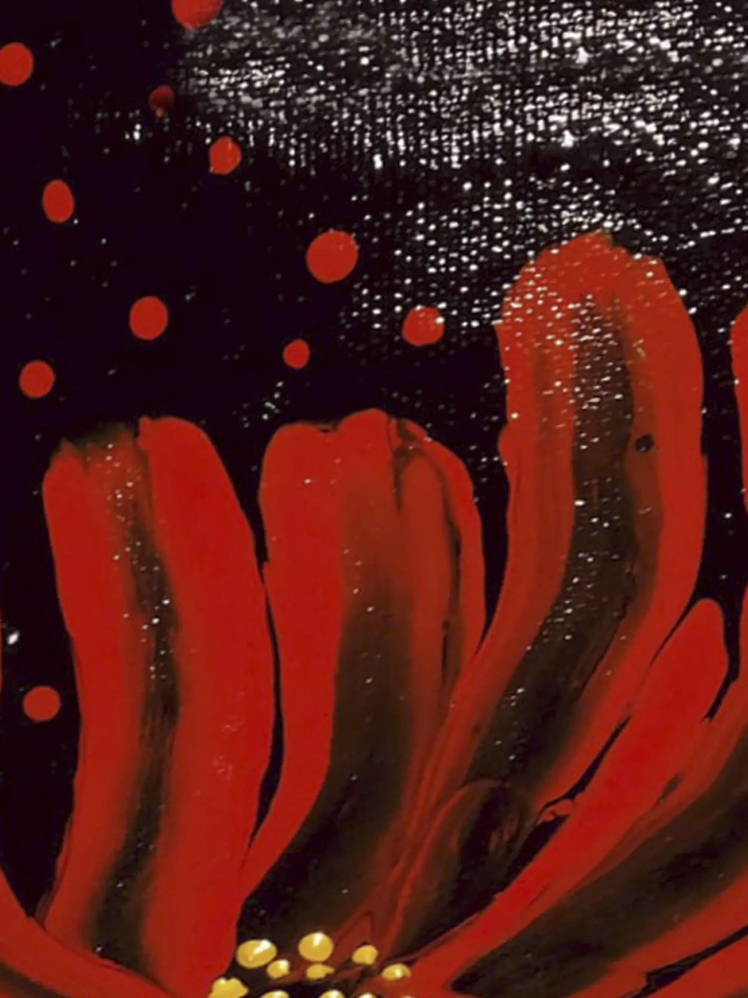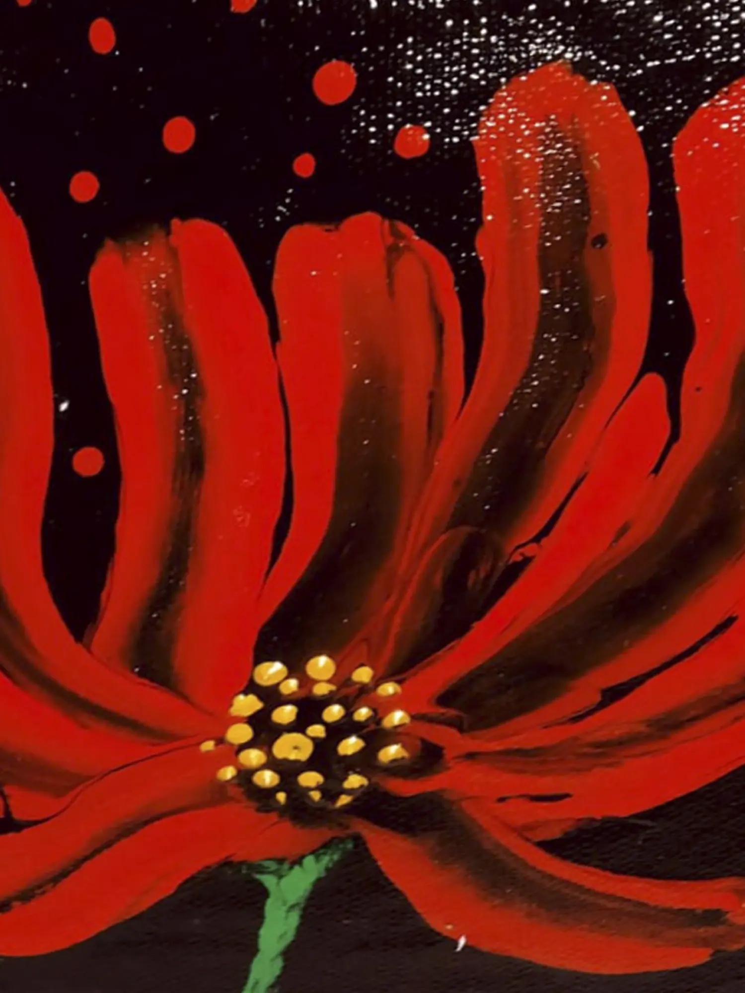 You'll be captivated by the arresting contrast of the vivid scarlet petals against the deep, enigmatic black background. The petals themselves exhibit a graceful, almost lyrical flow, outlined with darker tones that lend them a sculptural quality. Delicate flecks of gold scattered throughout the composition evoke the shimmer of dew or distant stars, adding a touch of celestial wonder. The focal point is a cluster of golden stamen, rendered with a lively texture that brings the heart of the flower to life.