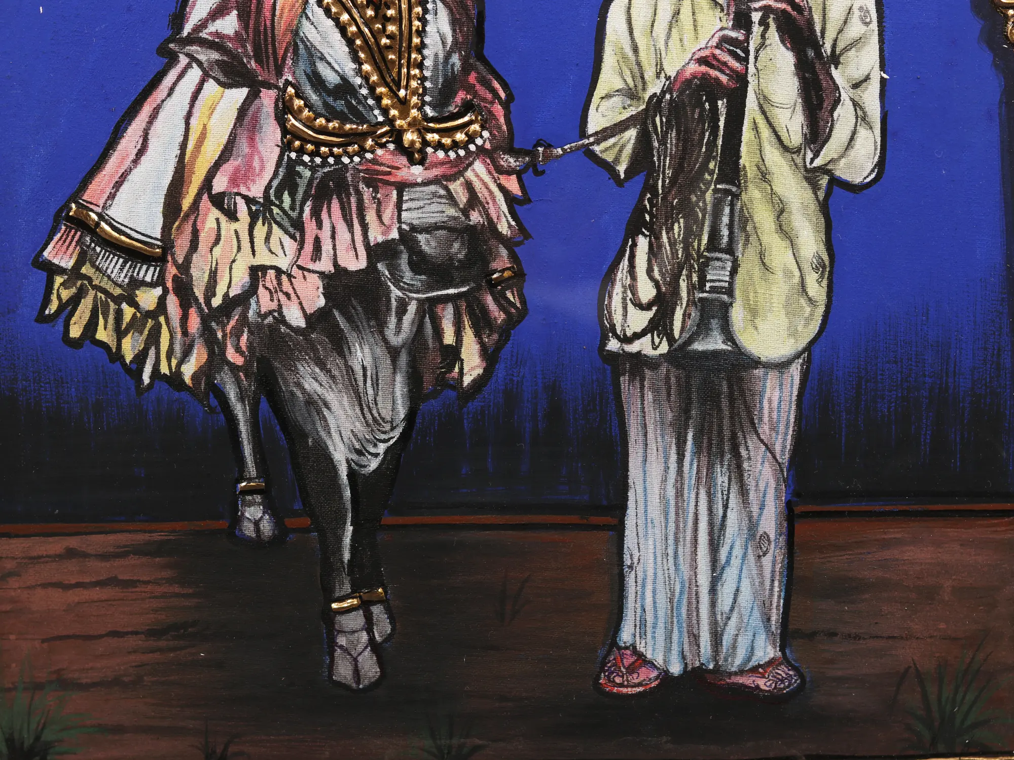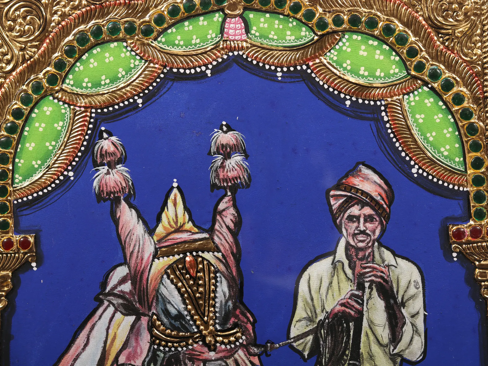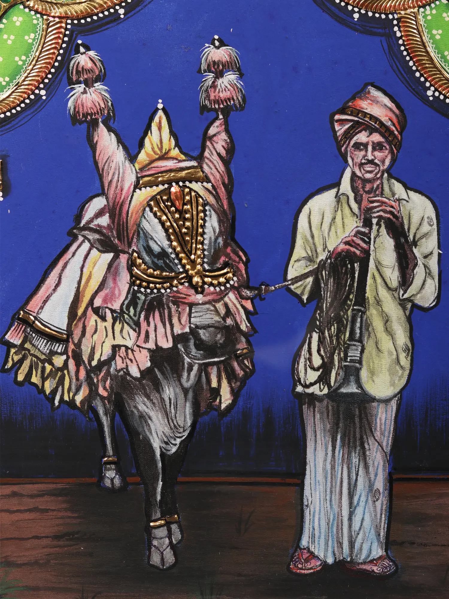 This gorgeous artwork explores the enigmatic connection between man and beast, portraying a Man with a Decorated Bull, typically related to the Southern Indian festival of Jallikattu. This Tanjore artwork represents the harmonious coexistence of humanity and nature, where tradition, reverence, and symbiosis converge, presenting your space with a piece of it all.