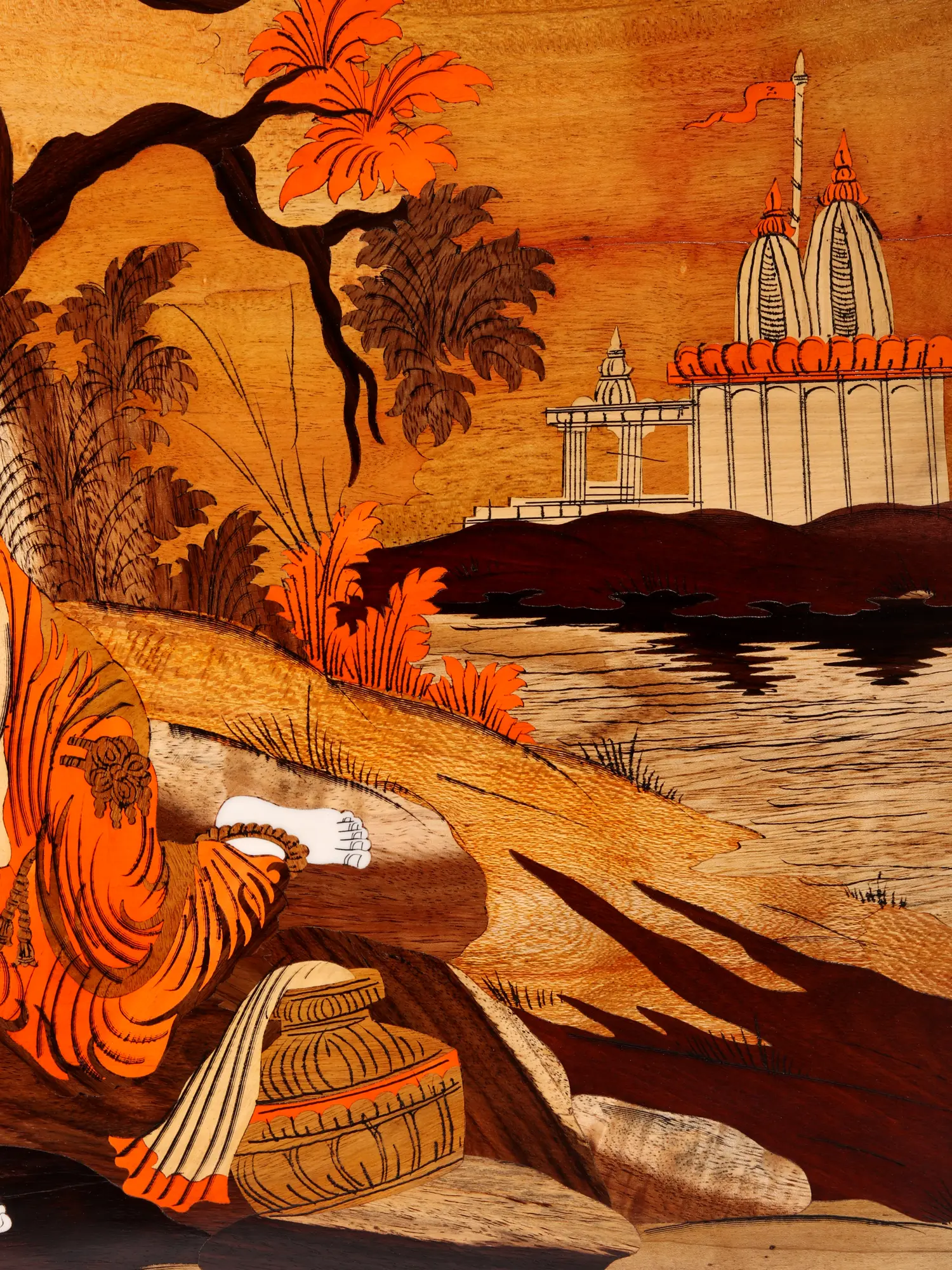 Witness the pinnacle of traditional craftsmanship, brought to life through the meticulous art of wood inlay. Skilled artisans have painstakingly selected and shaped countless pieces of fine wood, their grains and hues forming a natural palette. The result is a richly textured tableau, where each element, from the flowing drapery to the subtle expressions, is rendered with breathtaking detail.