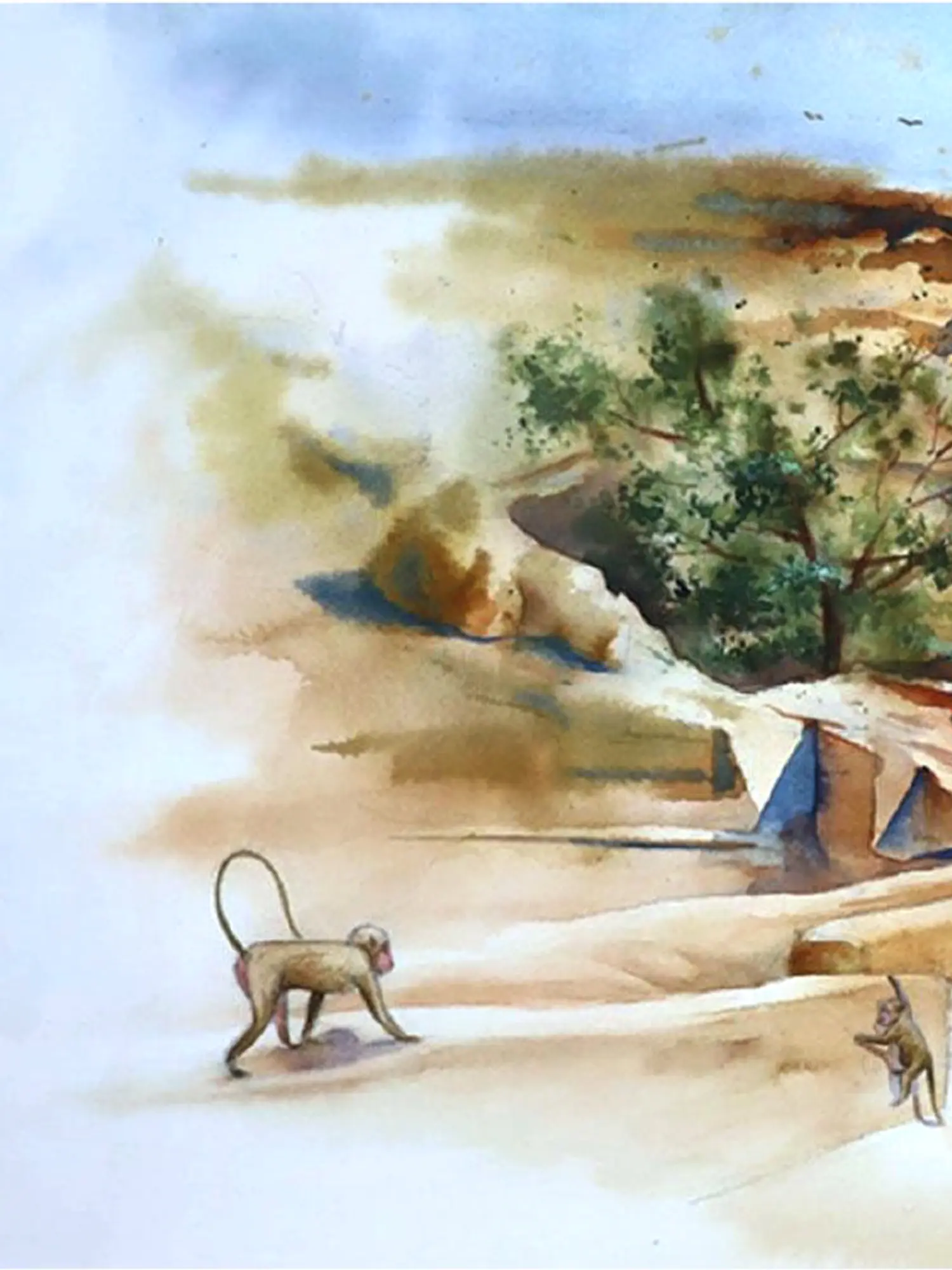 The 12 by 18 inch format provides a generous canvas for this scene, allowing the interplay of natural light and shadow to unfold with dramatic effect. Observe how the warm, earthy tones of the rocks and earth are juxtaposed against the cool, inviting blues of the sky and water. The subtle rendering of the foliage and the presence of the simian figures add a dynamic element, imbuing the scene with a sense of life and gentle movement.