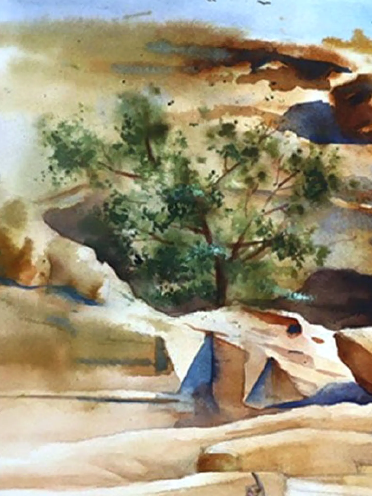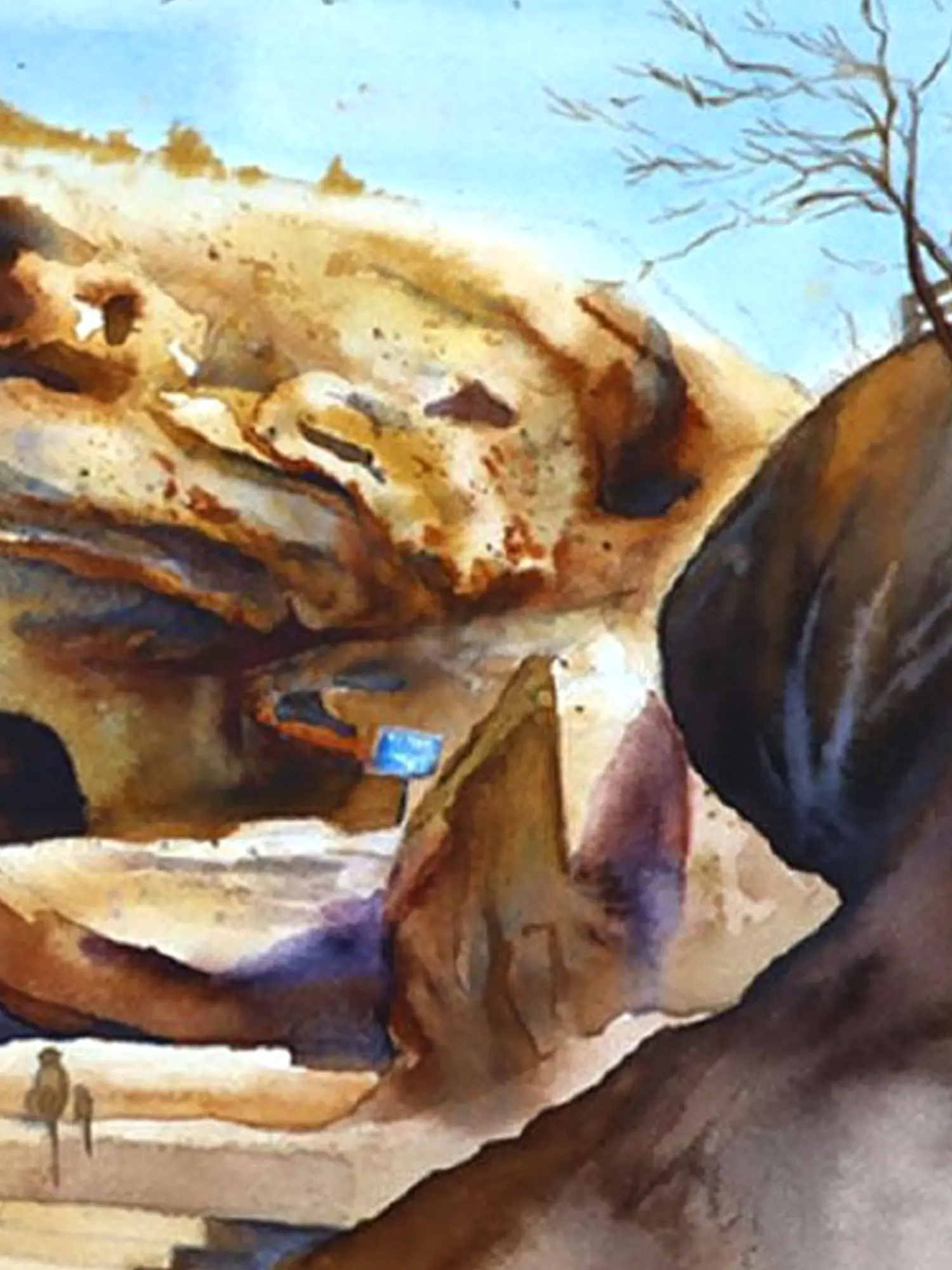 Step into a world captured in translucent washes of color, where light and shadow dance across an ancient landscape. This evocative piece invites you to pause and contemplate the raw, untamed beauty of nature, observed through the artist's discerning eye. It offers a moment of quiet reflection, a portal to a serene yet vibrant scene.
