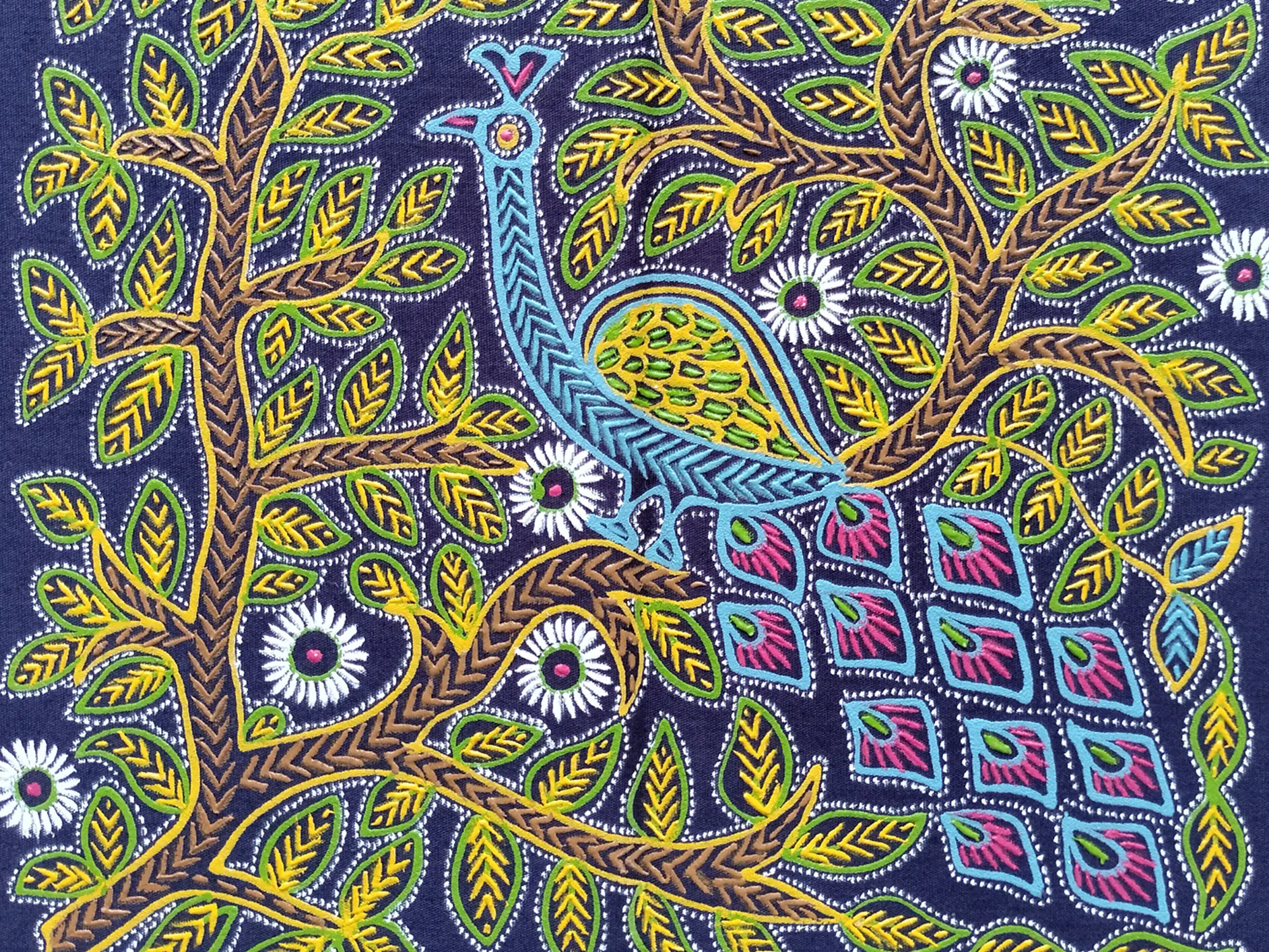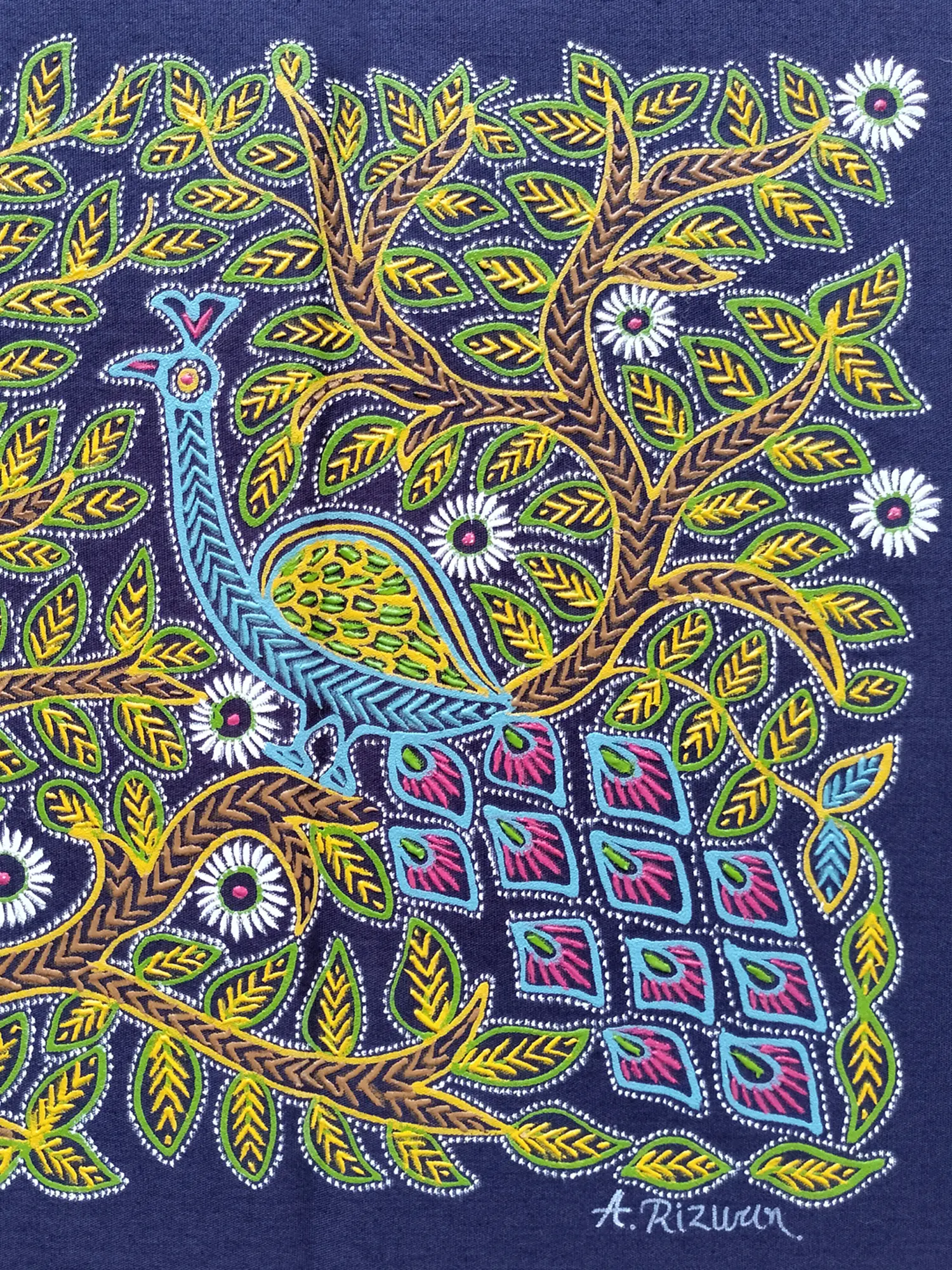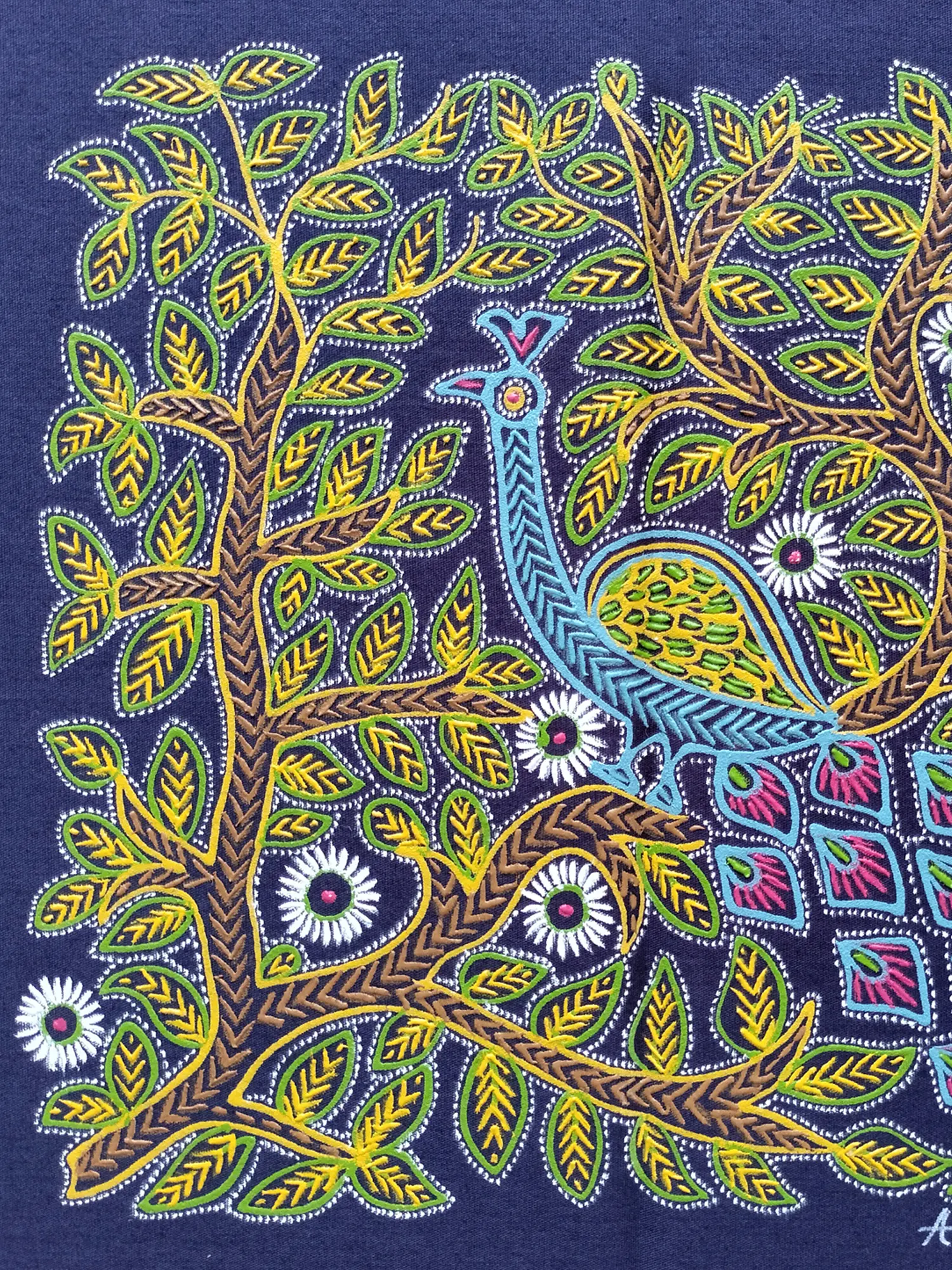 This spectacular creation by “Rizwan Khatri” transports you to an era where artistic talent coexists with the vivid hue of nature. A majestic peacock perched upon a tree branch, its iridescent feathers shimmering in the sunlight, evokes a sense of grace and tranquillity. Using natural pigments and mineral colours on soft cotton cloth, “Rizwan Khatri” transforms mere fabric into a canvas of enchantment.