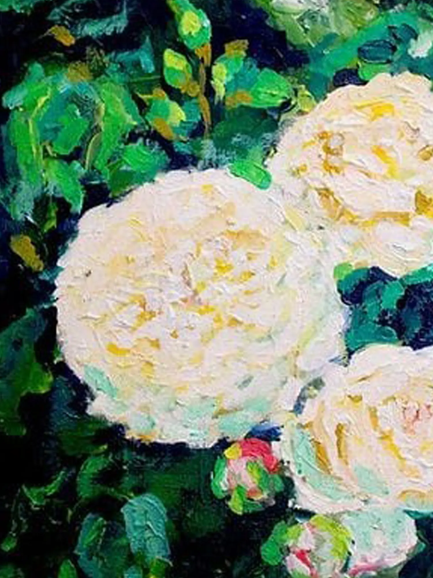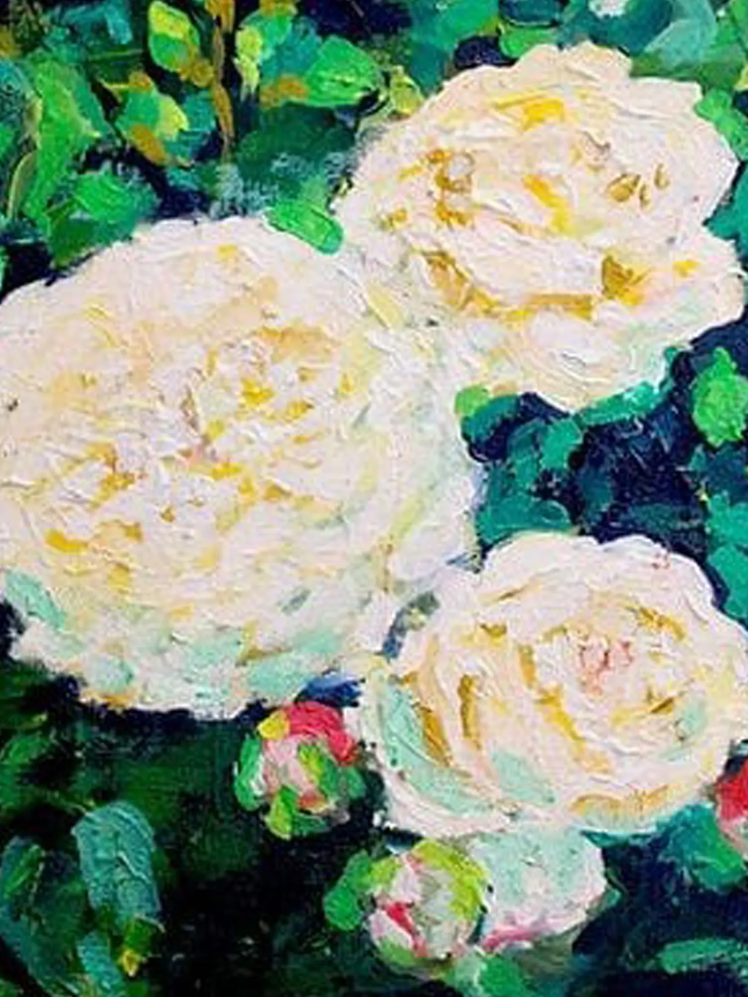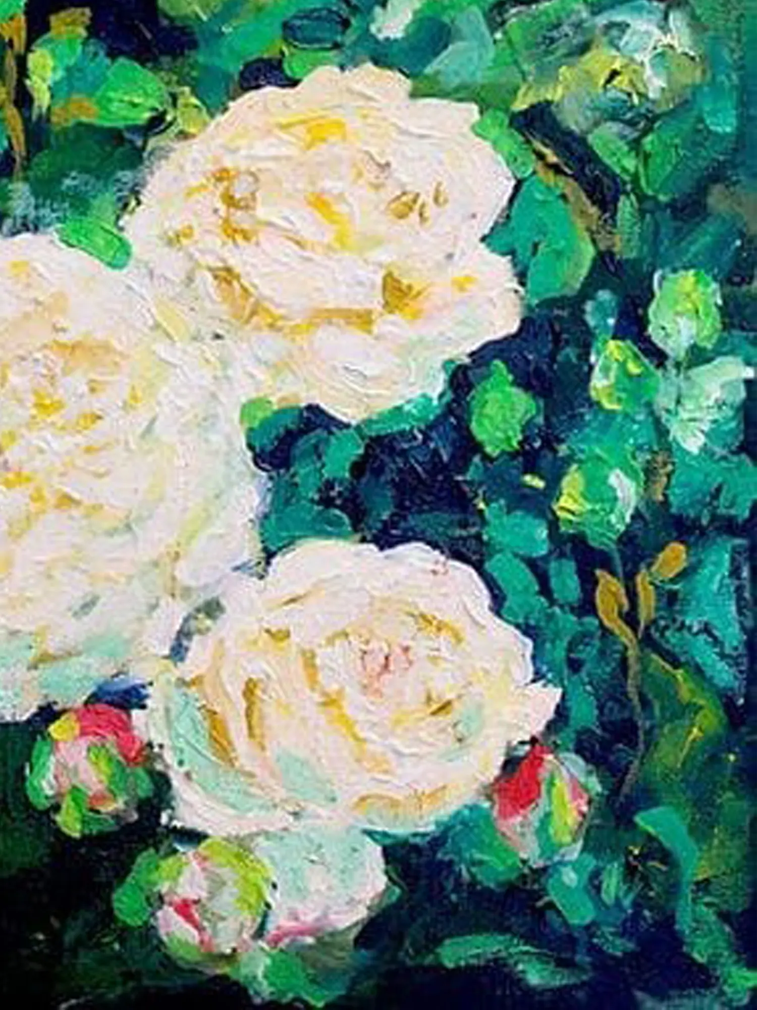 The interplay of light and shadow is rendered with a confident impasto technique, giving the surface a lively, almost sculptural quality. Creamy white roses, tinged with subtle hints of yellow, emerge from a backdrop of deep, lush greens. The generous application of paint allows the texture to become an integral part of the visual experience, inviting you to look closer and discover new nuances.