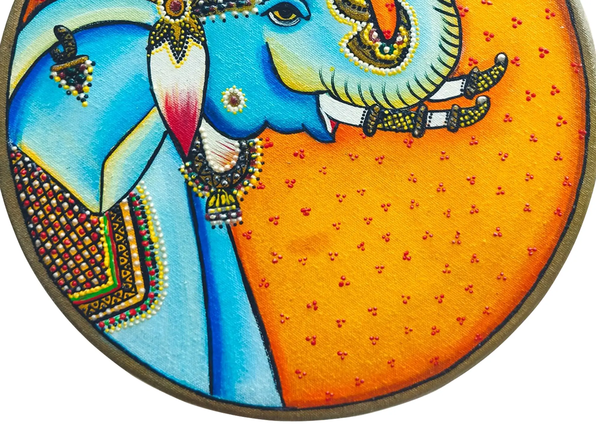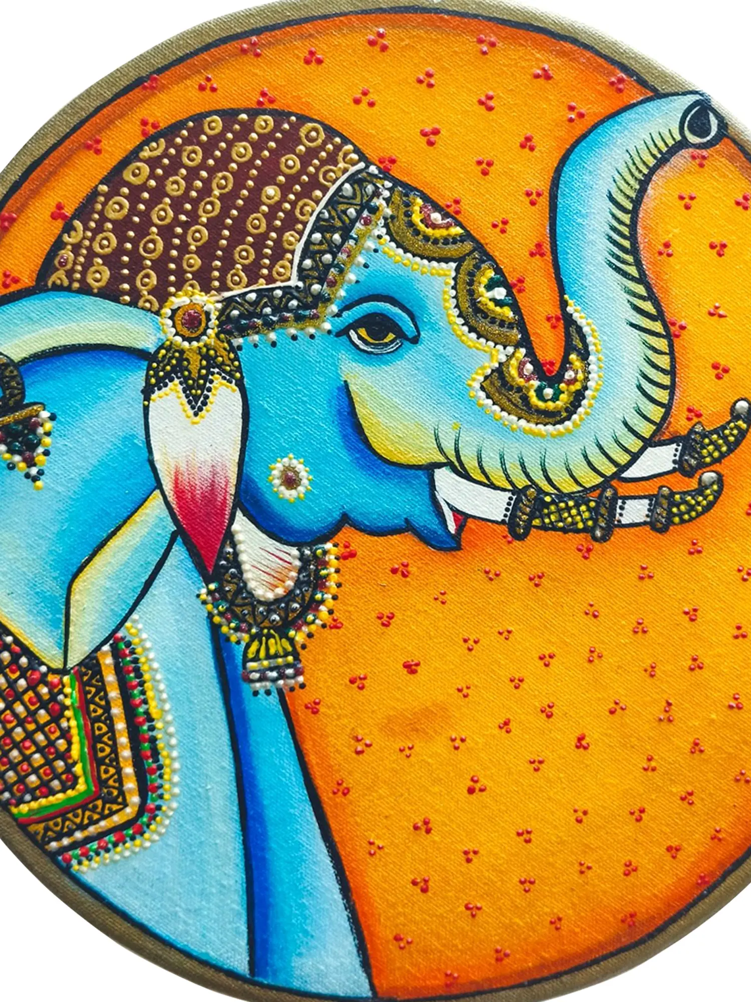 Let yourself feel the regal allure of this Pichwai piece featuring a "Royal Elephant." Crafted with precision using acrylic colours on canvas, the artist brings to life the majestic presence of the elephant, adorned with beautiful details of ornamentation. The Pichwai art style adds a touch of tradition, creating a harmonious blend of opulence and cultural richness. This artwork not only captures the grandeur of the elephant but also invites you to appreciate the symbolism associated with these magnificent creatures in Indian art.
