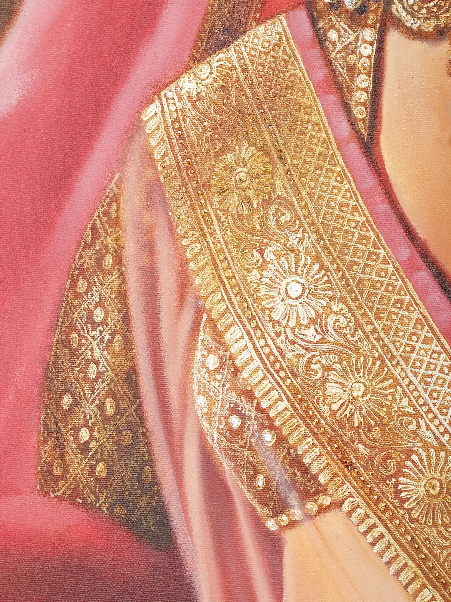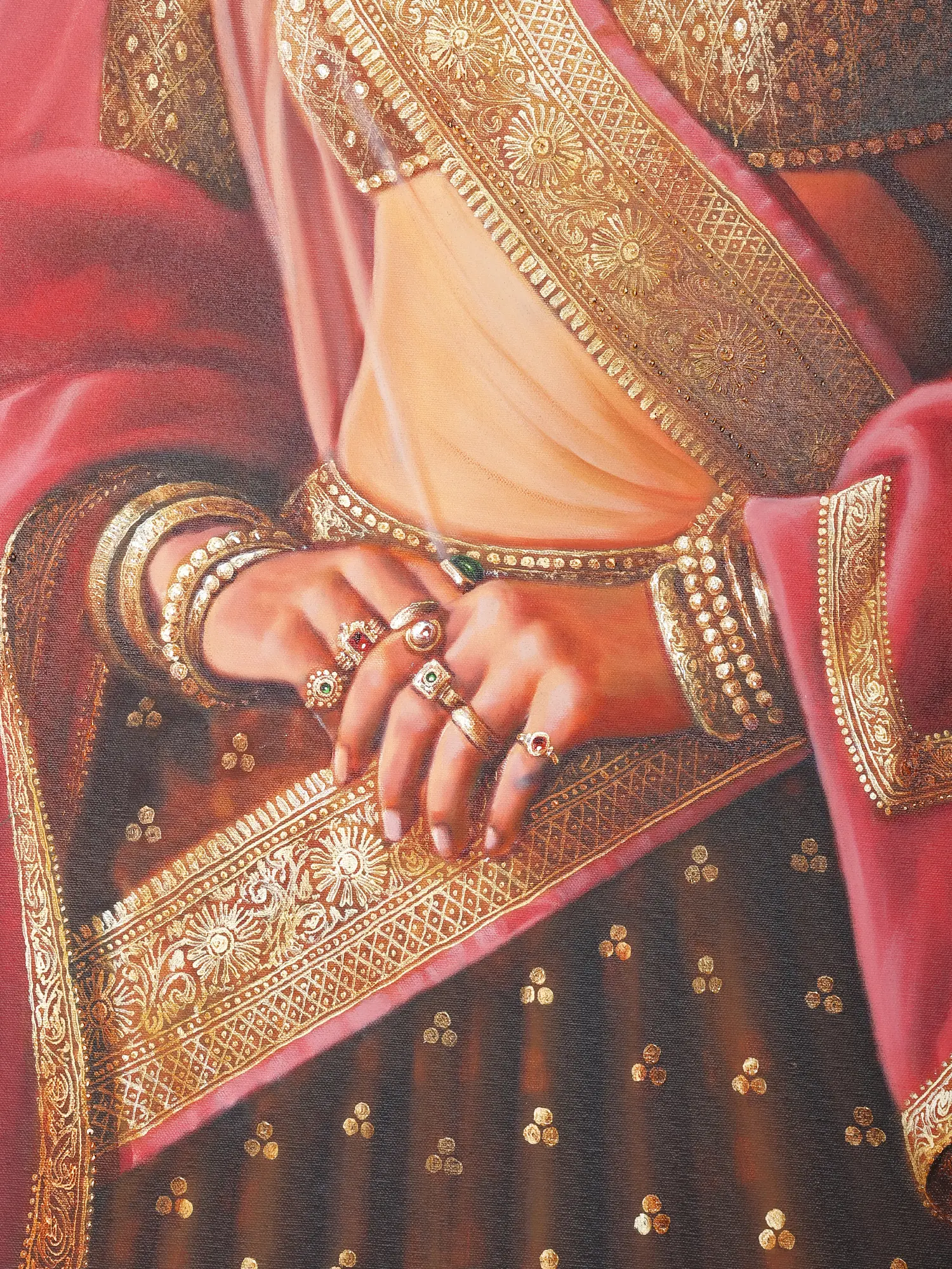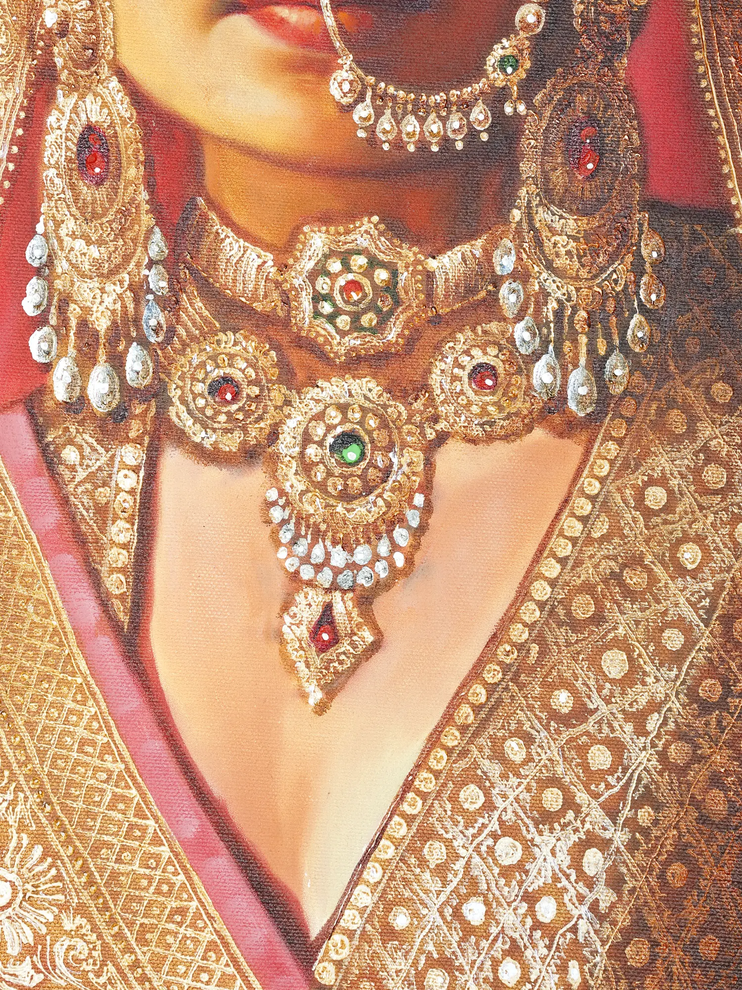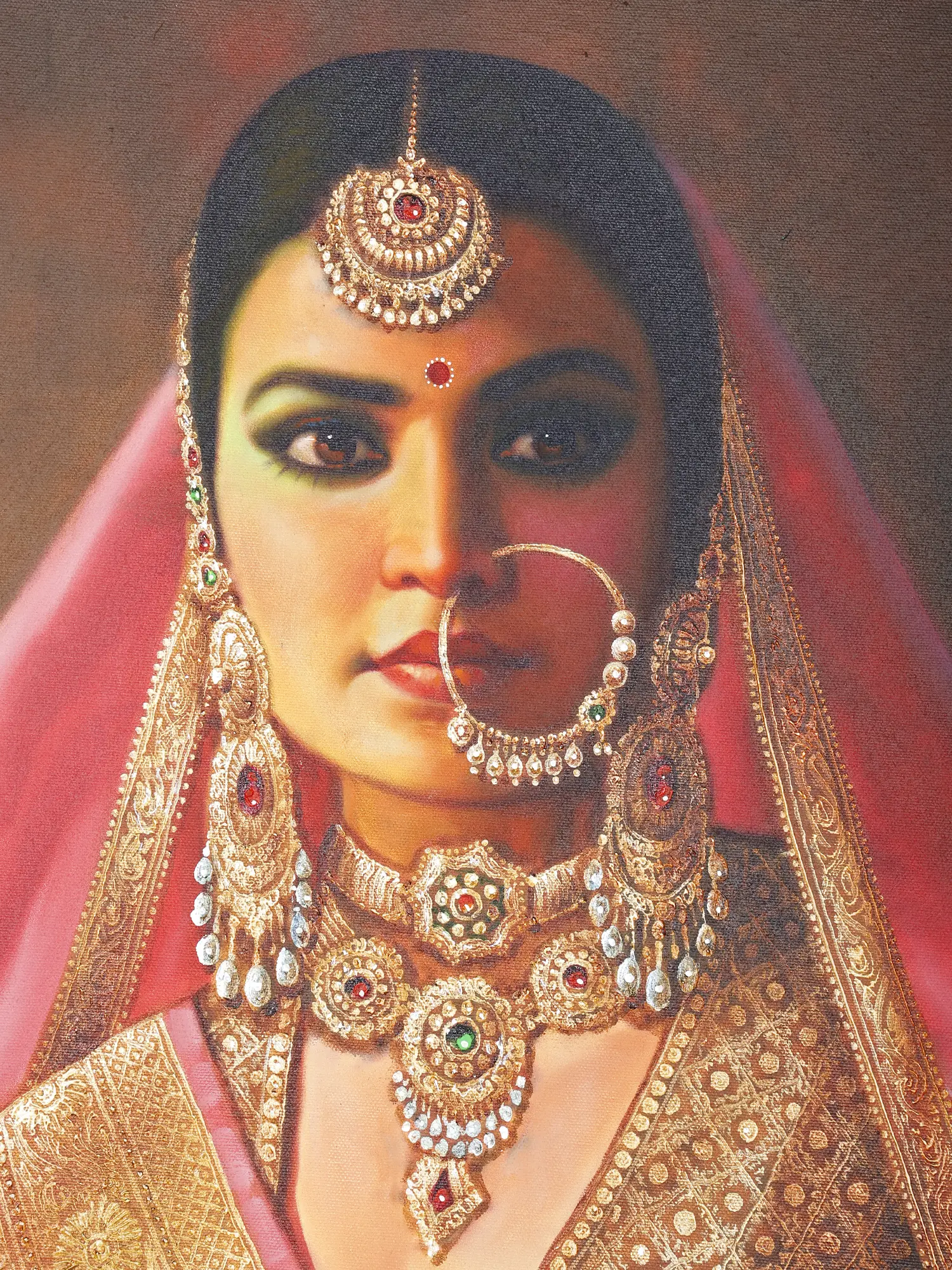 The subject of the painting is an exquisitely adorned, youthful Maharani, dressed in pink, maroon, and golden and ornate jewelry.