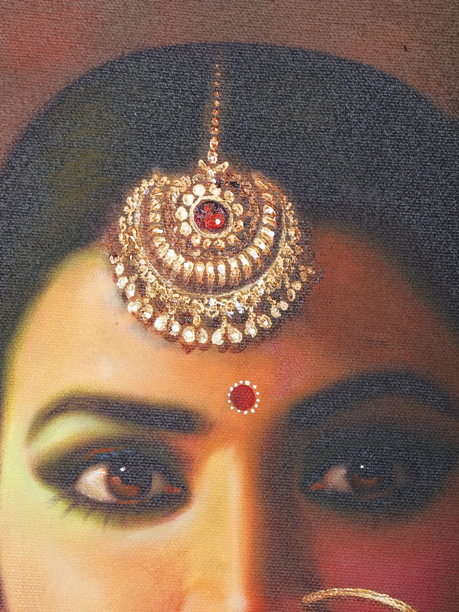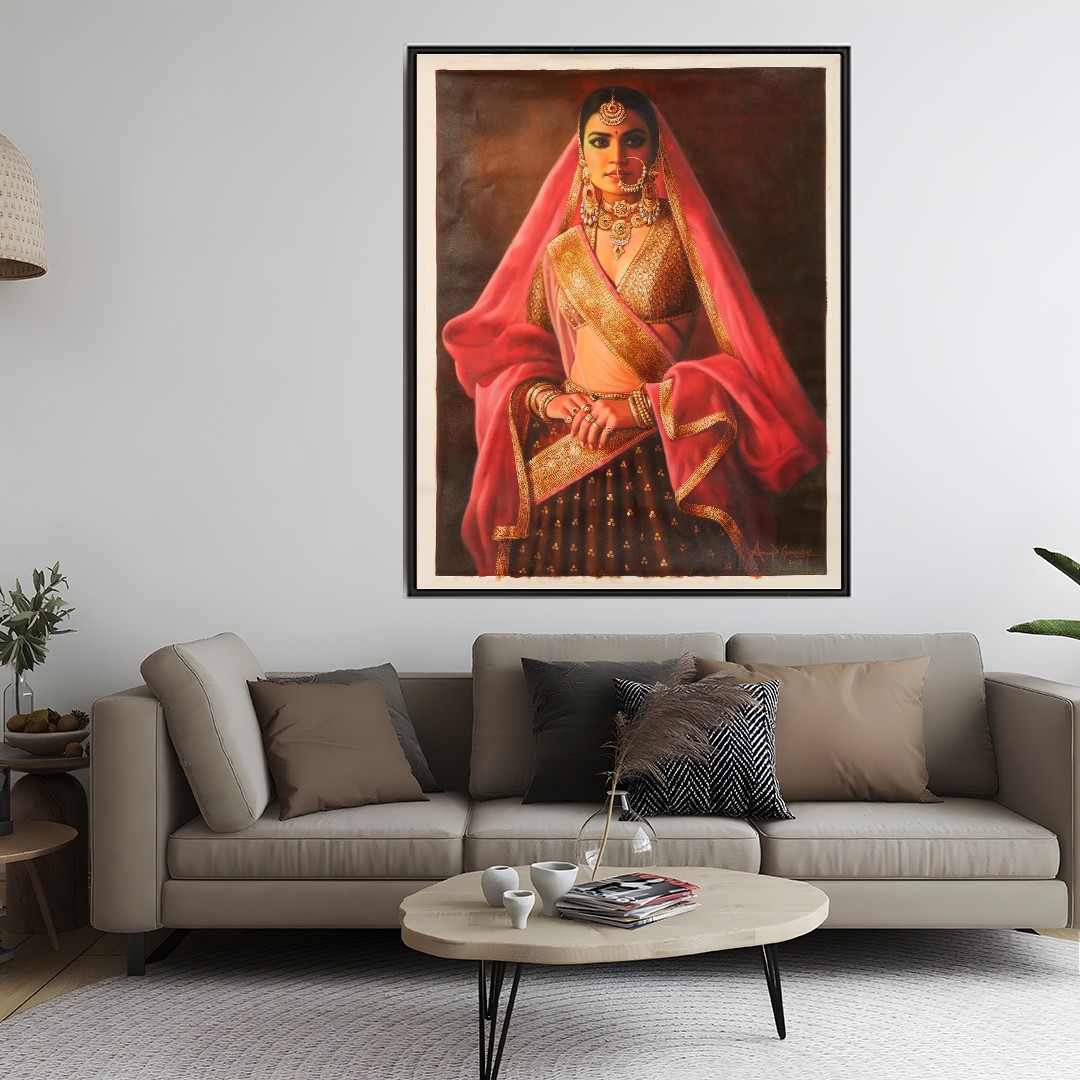 Exalting the might and beauty of an Indian queen, this oil on canvas painting by Anup Gomay adds to your space a touch of pristine royalty.