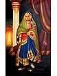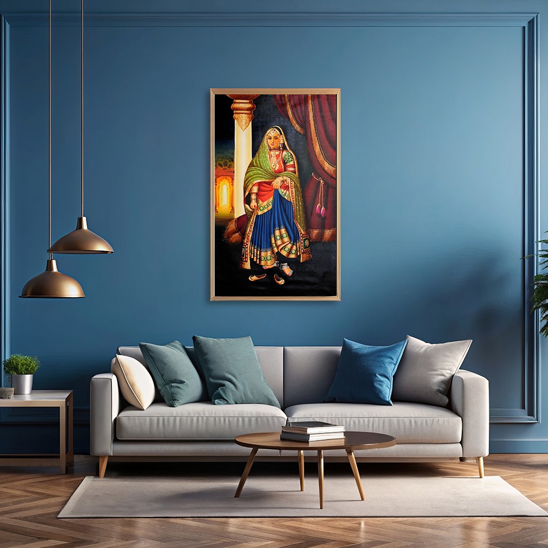 In a pillared hall which is decorated with luxurious drapes, stands a majestic royal lady. She wears silken brocaded clothes- lehenga, choli, and a green odhani. Traditional Indian ornaments of pure gold cover her from head to toe, marking her elite roots. On her feet are distinctive silver ornaments which she displays by taking her jutis (shoes) off. Probably standing for her portrait, the lady emanates refinement which is beyond words. Several Indian motifs, garments, and ornaments presented on one canvas make this an interesting source of traditional Indian fashion tastes.