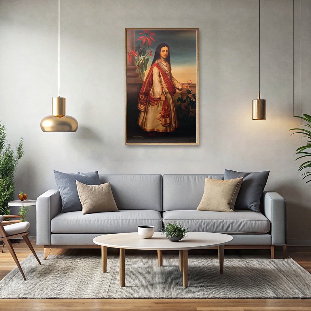 Commanding respect and appreciation for her formidable stance and exquisite form, the royal lady in this oil painting brings to your space an aura of pristine regalia.