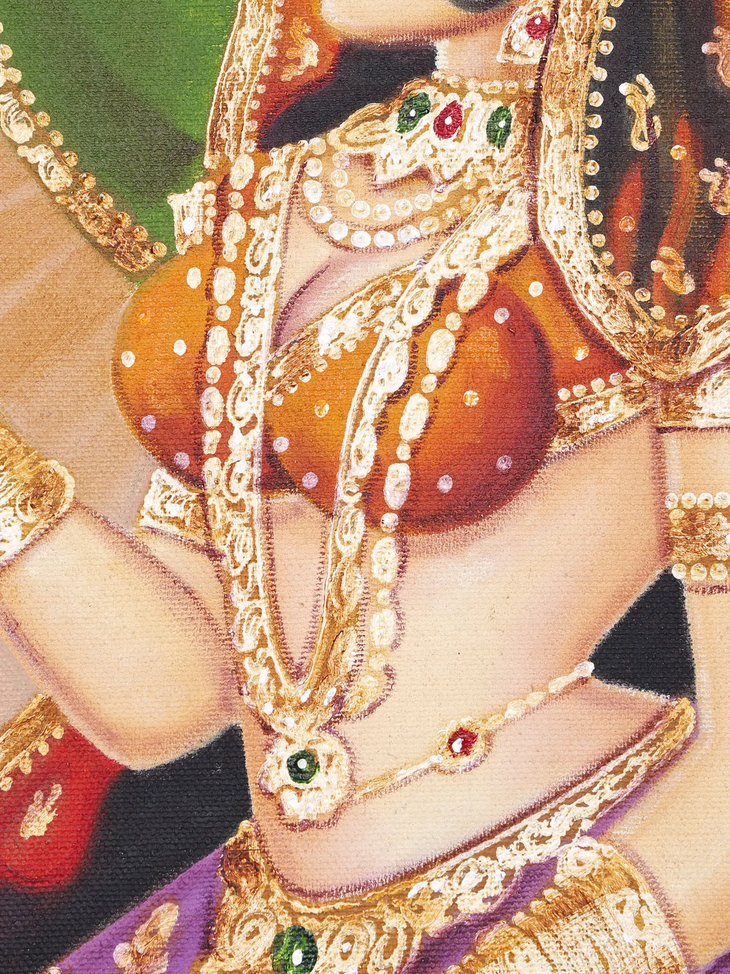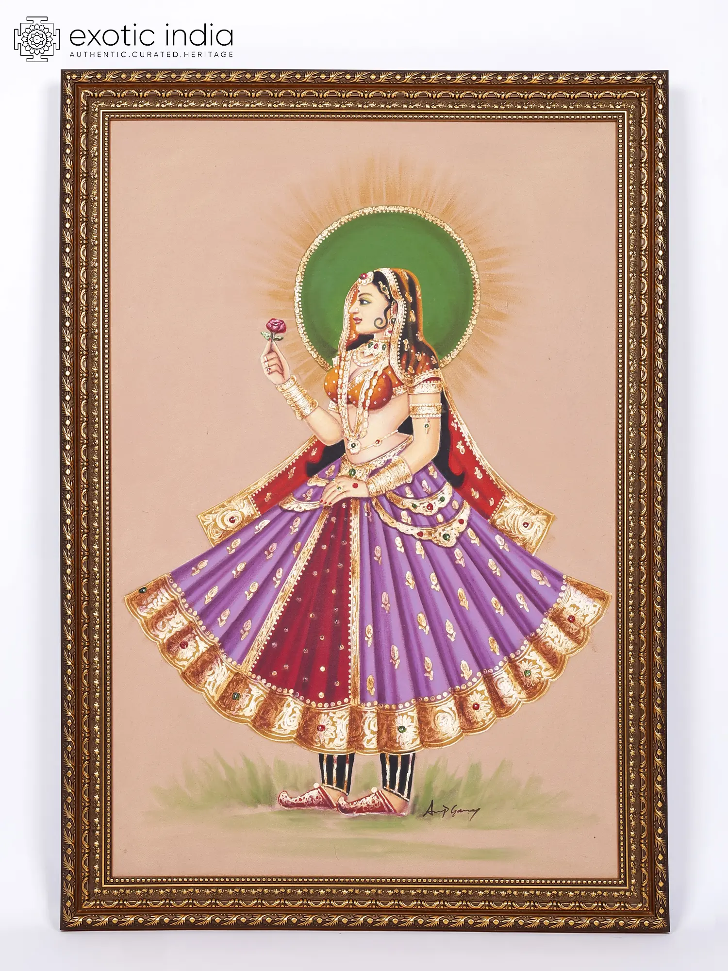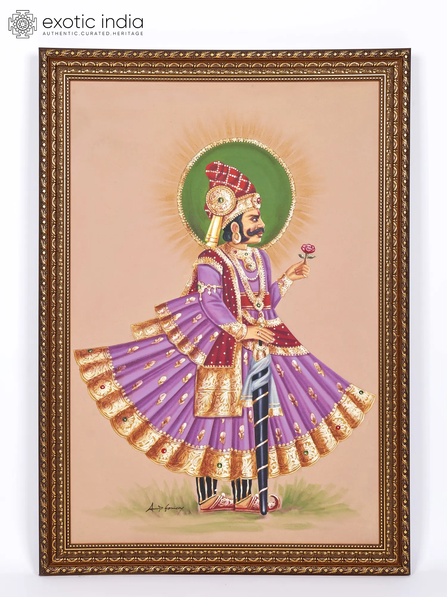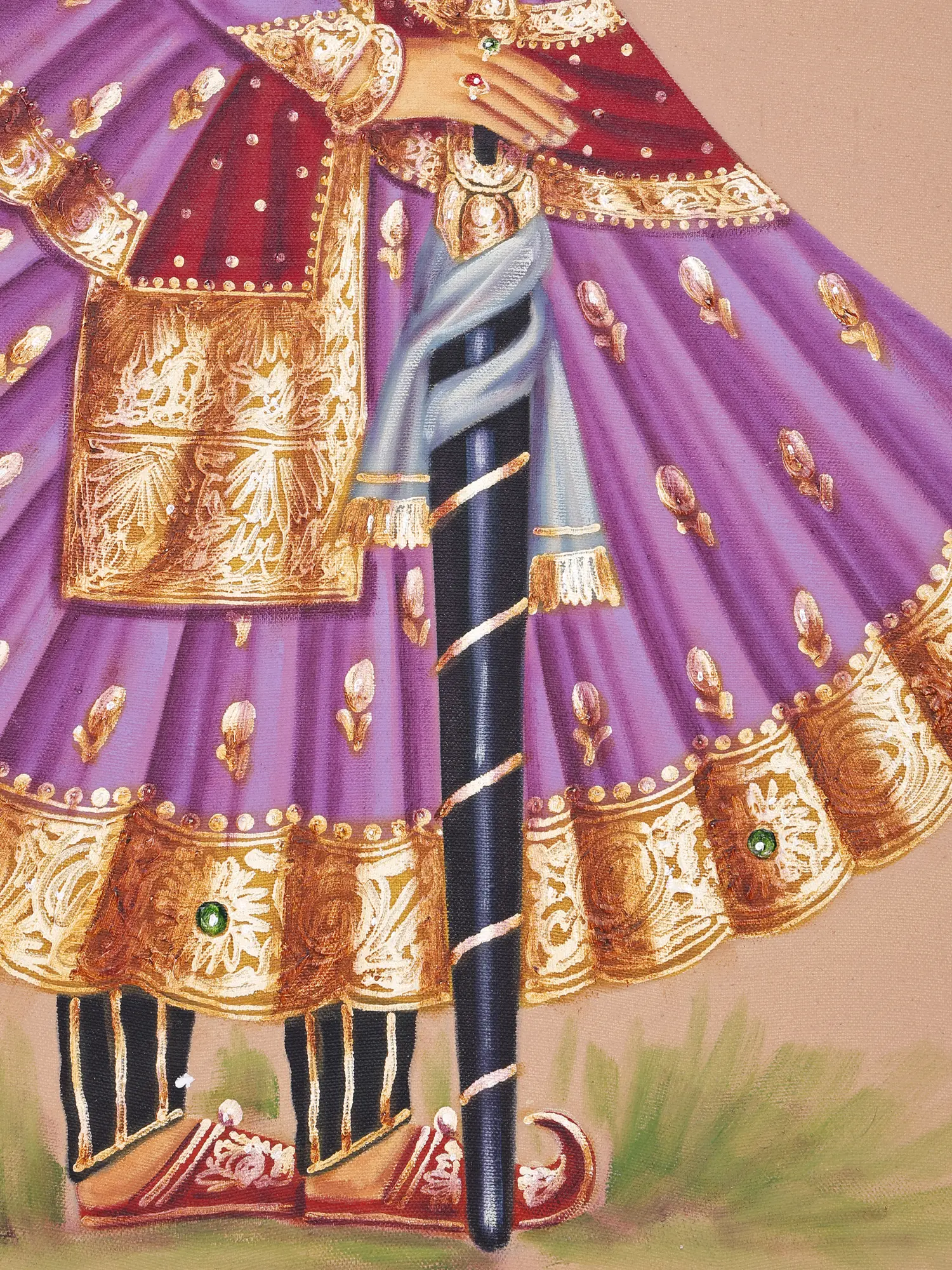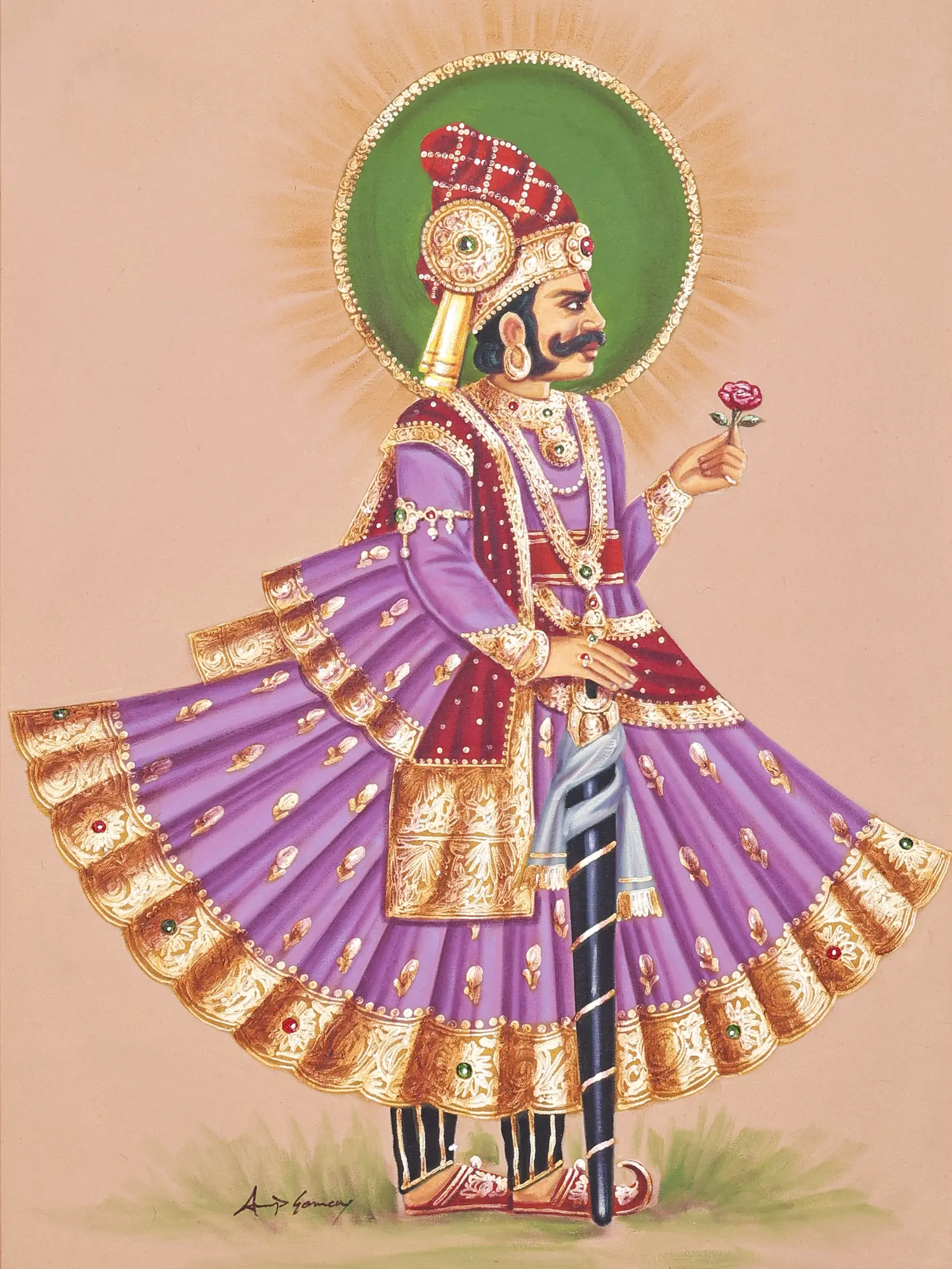Curve of her waist highlights her kamarband in a sensuous manner to the king, with the other rich ornaments framing their personality. King holds his royal black stick as a gesture of his authority and superiority with the green aureole formed at the back of their heads glorifying their character and kind nature.