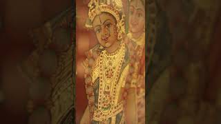 In the Bhakti tradition of Southern India, the union of Sri Krishna with Devi Rukmini, his Shakti, is a festive occasion for the devotees, who rejoice in the coming together of the universal father and mother, Vishnu and Lakshmi, in the mortal realm for the benefit of their children. The theme of Rukmini-Kalyanam, Devi Rukmini’s marriage with Krishna is thus one of the most popular themes of Tanjore paintings, which are adored by devotees on the walls of their homes. In this magnificent Tanjore painting, a stunning golden pillared hall serves as the Mandapam, where the families of Krishna and Rukmini have gathered.