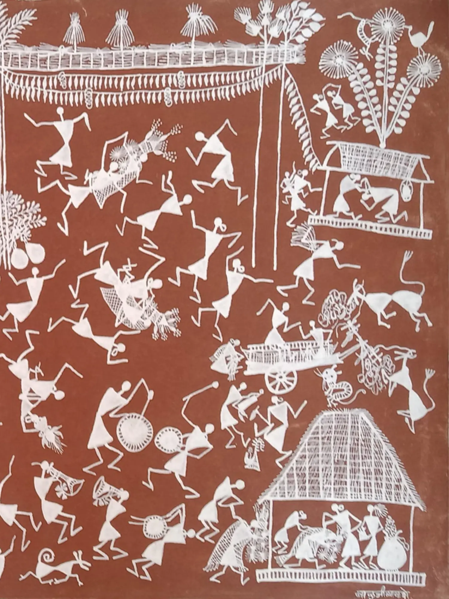 Crafted with meticulous care, this piece is an authentic testament to the enduring Warli art form. The artist skillfully employs traditional materials, blending terracotta and cow dung with pure white acrylic. This unique medium creates a rich, earthy texture that grounds the vibrant energy of the composition. Each stroke is deliberate, reflecting generations of artistic practice and a deep understanding of form and narrative.
