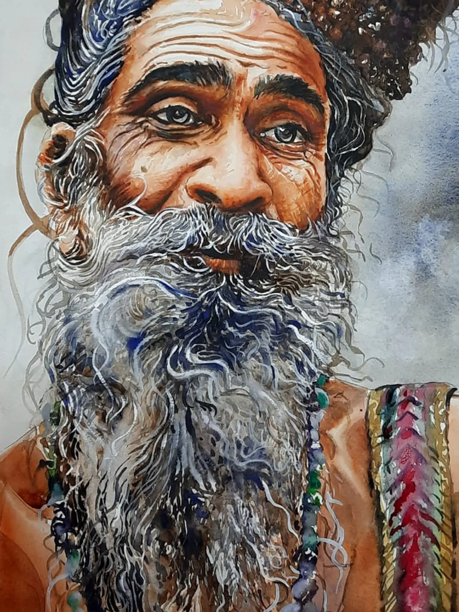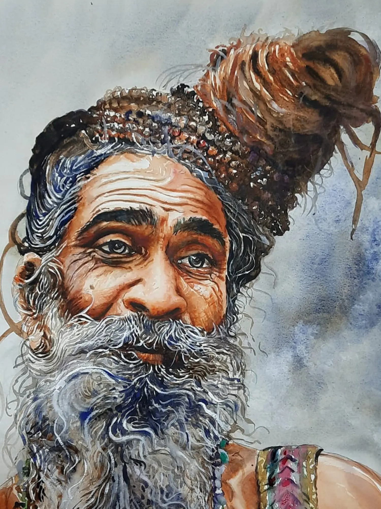 Created using the delicate medium of watercolour on paper, this piece showcases the artist's profound understanding of the medium. You'll observe how translucent layers of colour have been expertly applied to build form and convey texture, from the weathered lines on the face to the intricate details of the hair and beard. The fluidity of the paint allows for an organic vibrancy, revealing the meticulous technique employed to bring this evocative subject to life. Each brushstroke is a testament to hours of dedication and artistic finesse.