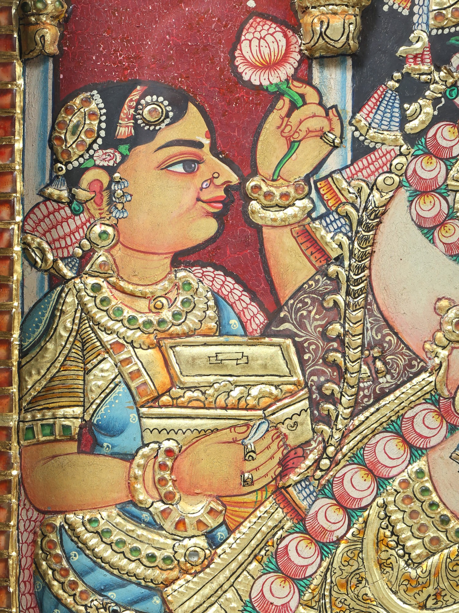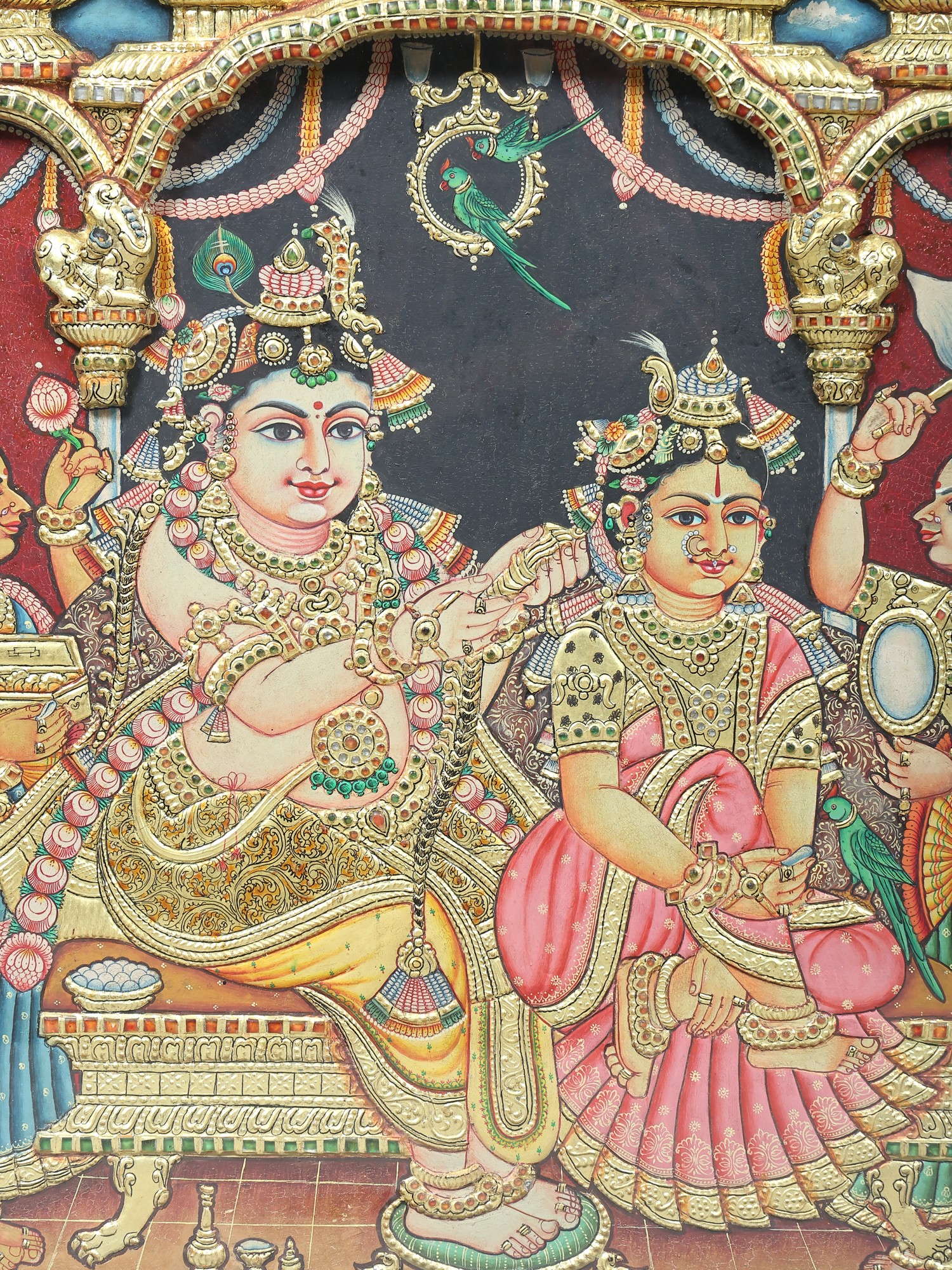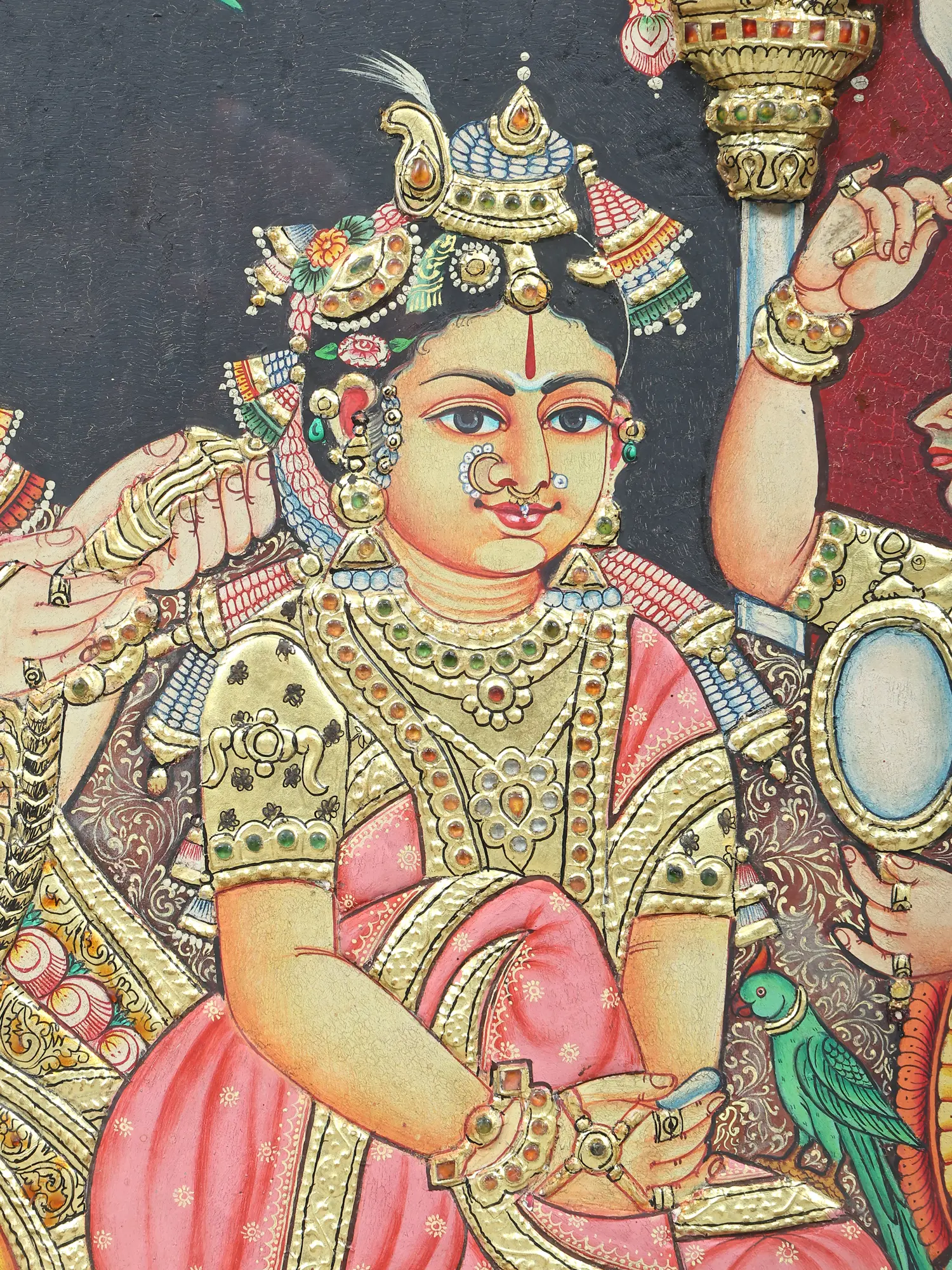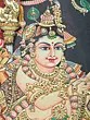Lord Krishna Holding Govardhan Parvat on his Little Finger | 24 Karat Gold Work | Vintage Framed Tanjore Painting