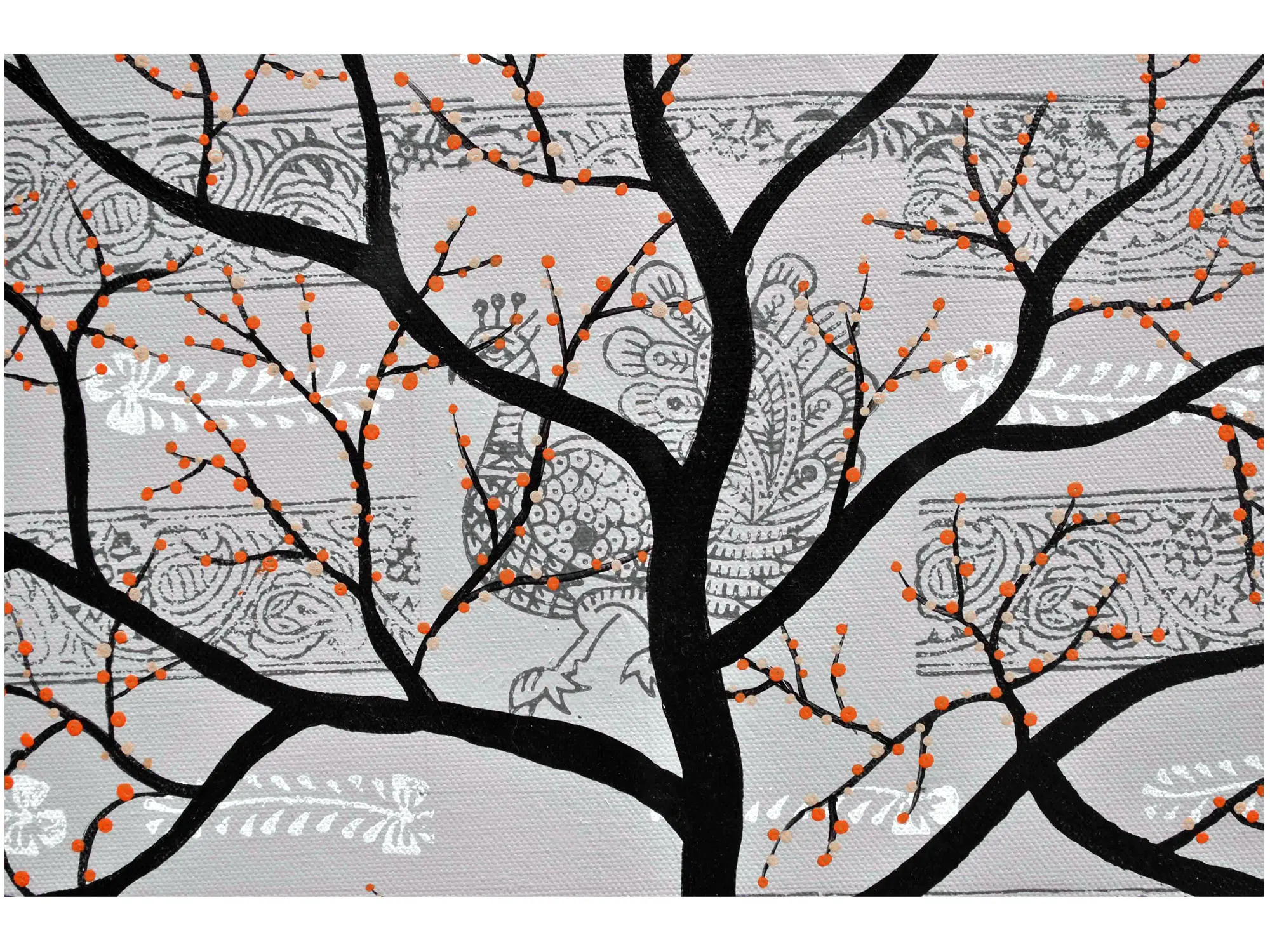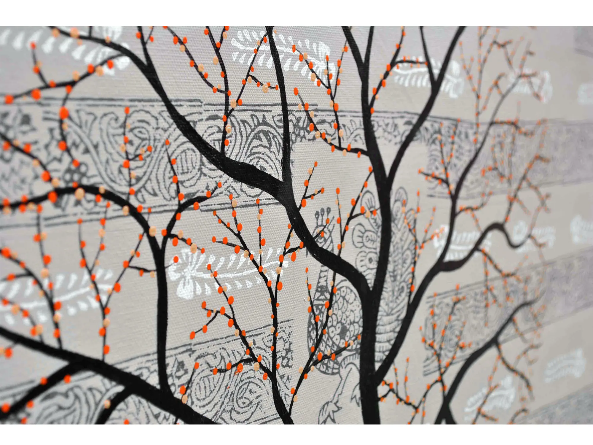 Observe the dramatic contrast between the stark, branching silhouette of the tree and the intricately detailed background patterns. The subtle pops of orange on the branches provide a delicate counterpoint to the monochromatic elegance of the overall composition, suggesting nascent life and renewed energy. This artwork, measuring 24 by 24 inches, offers a substantial yet balanced presence, allowing its narrative to unfold without overwhelming your environment.