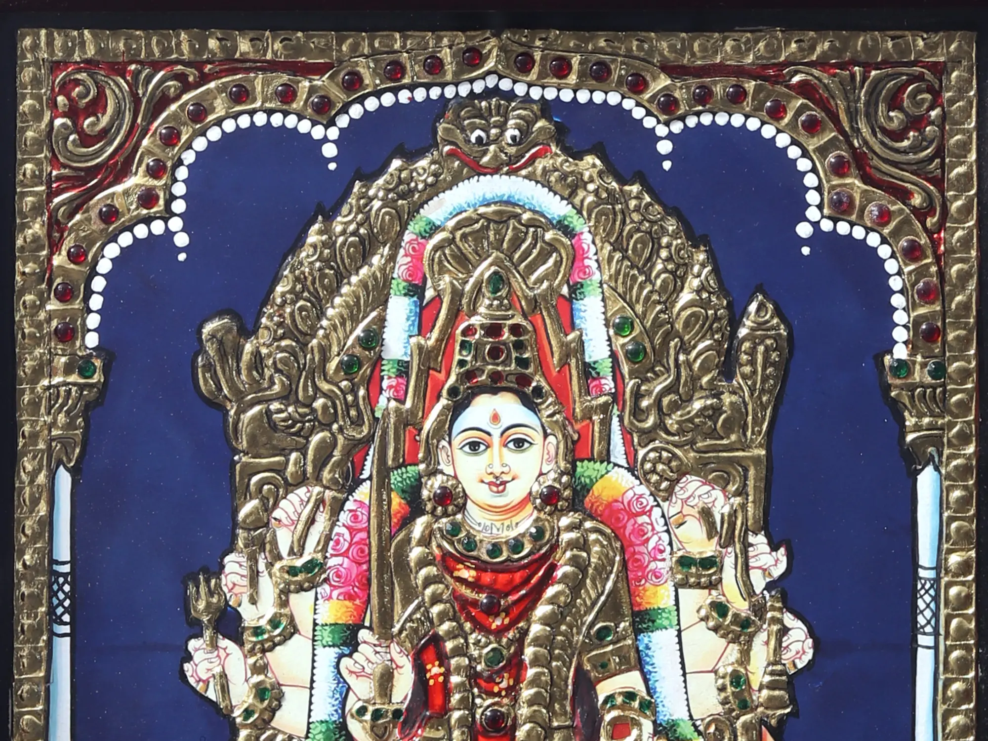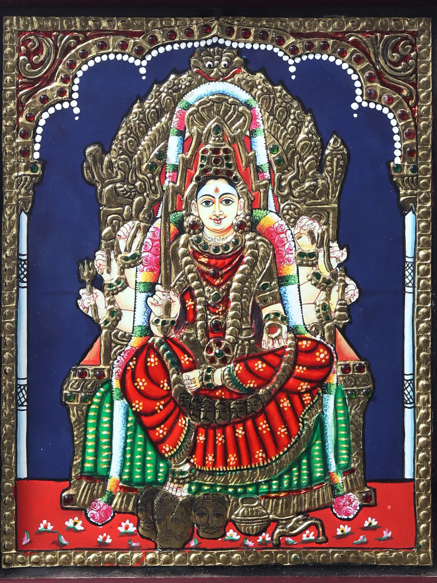 Aboriginal mother-goddess celebrated in Southern India - Mariamman is the sovereign of clouds, taking care of the rain cycles which are essential for life to thrive. The guardian of her children against all fatalities and overlooking their settled territories - Mariamman is the fierce Kuldevi of several lineages. Seated in Lalitasana, in her Ashtabhuja form she carries the weaponry of protection, draped in the auspicious red; wearing an open garland. Seated on a throne, kapalas are offered at her divine feet in complete devotion as illustrated in this marvelous Tanjore art.