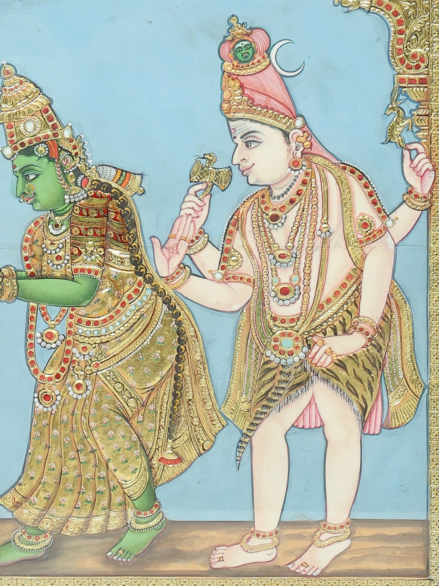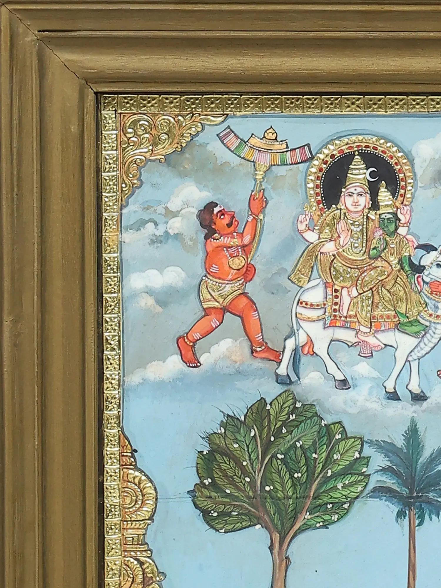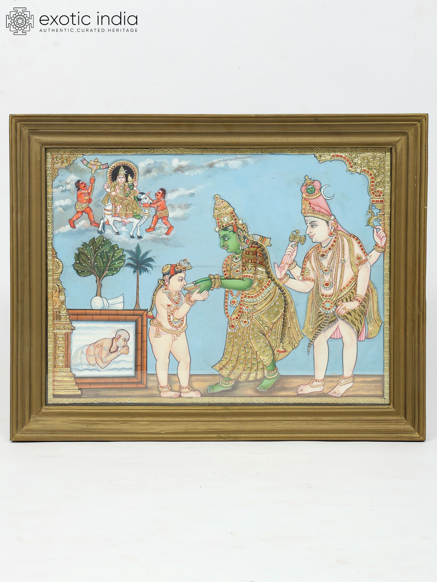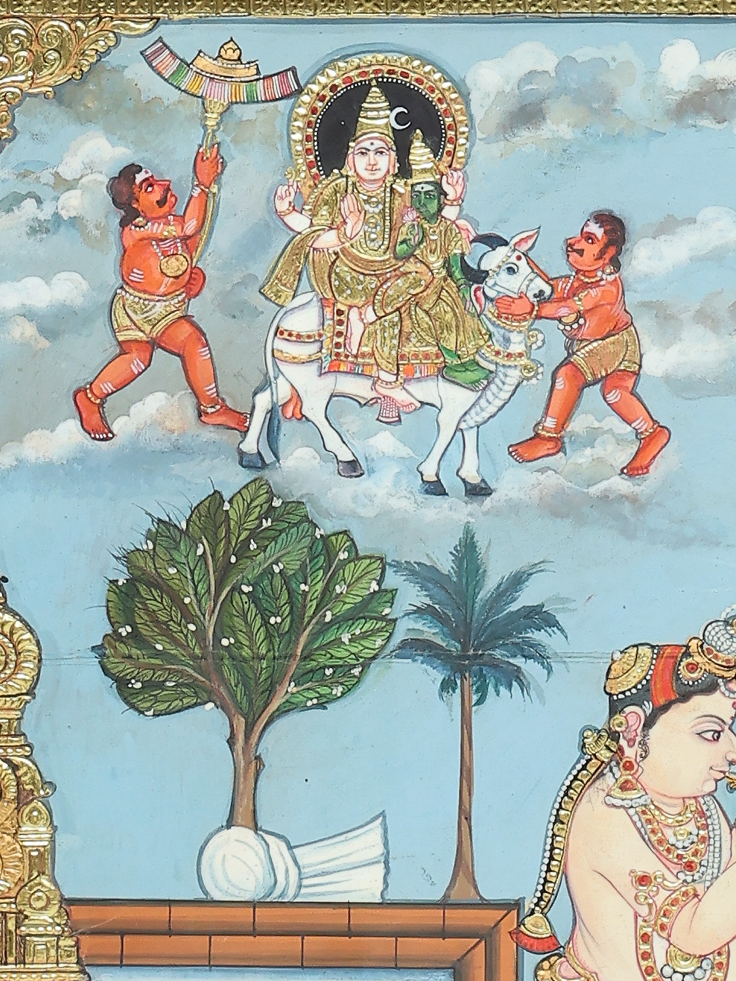 Shiva Parvati Seated on Nandi | Tanjore Painting with Teakwood Frame | Traditional Colors With 24K Gold