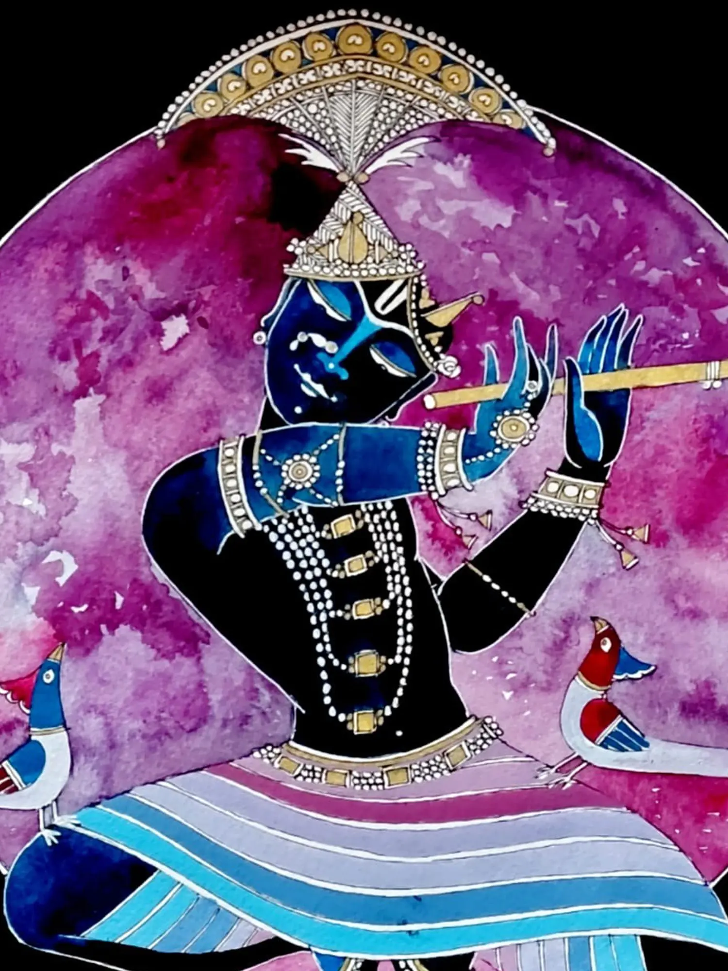Observe the vibrant blues of the divine form, adorned with delicate pearl necklaces and intricate golden embellishments that catch the light. The flowing, multi-hued skirt, accented with fine lines of blue and white, suggests graceful movement, while the regal headdress crowned with feathers and jewels speaks of celestial splendor. The subtle, expressive eyes and the gentle curve of the lips as they embrace the flute draw you into the narrative, complemented by the vibrant, textured backdrop and the charming presence of the accompanying birds.