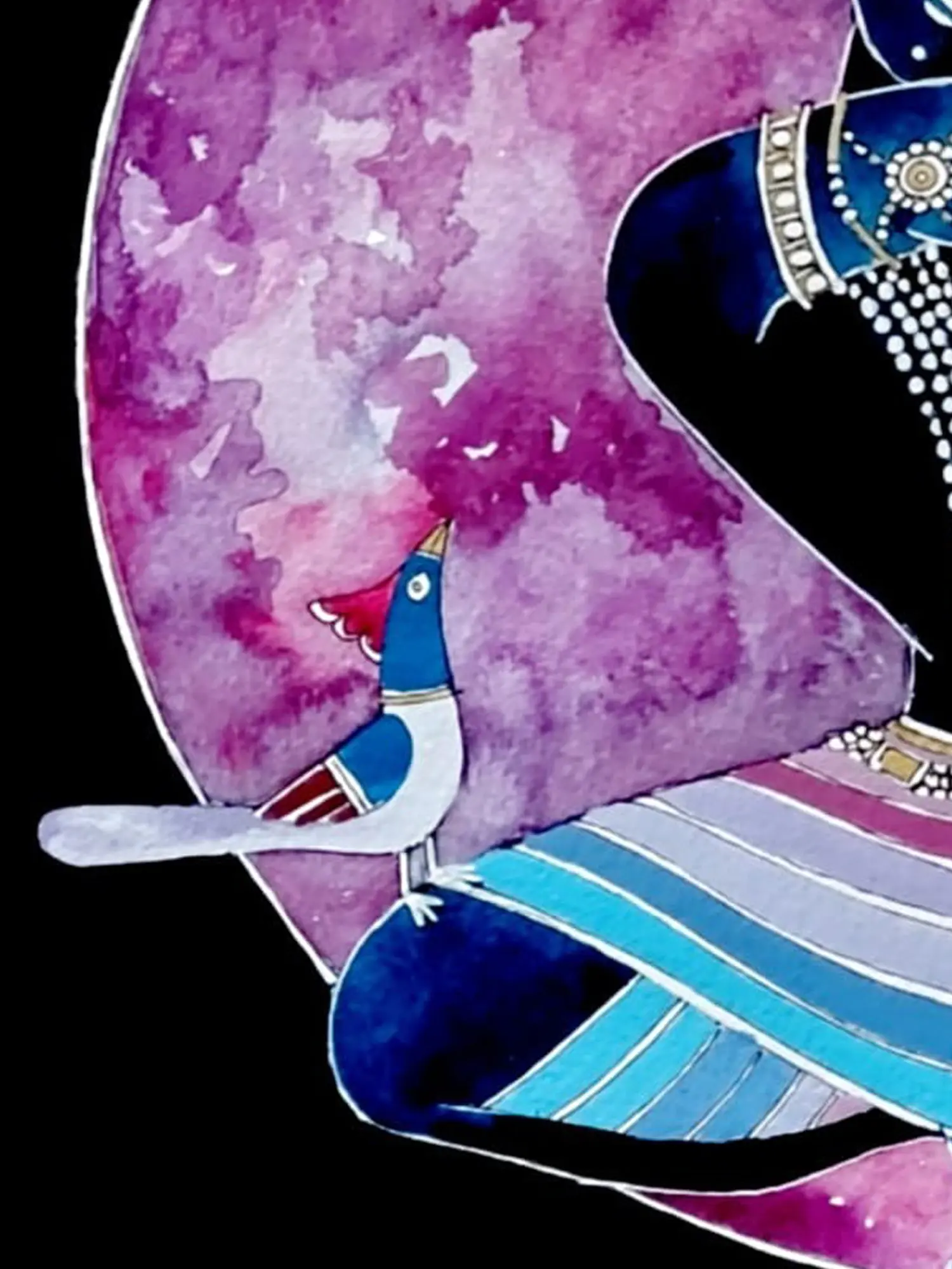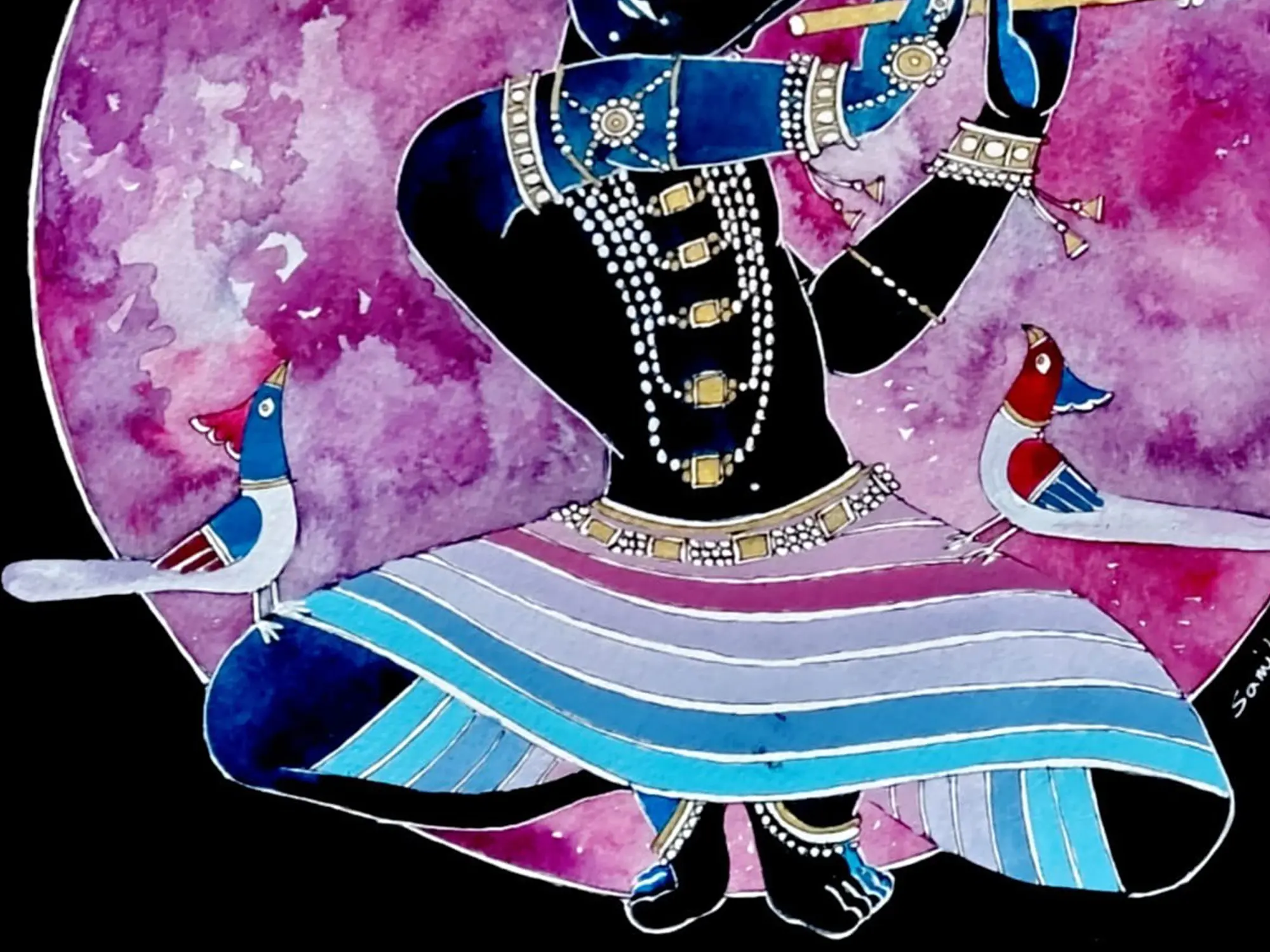 This artwork pays homage to the beloved deity, revered as a divine cowherd, flute player, and the eighth avatar of Vishnu. The visual language echoes traditional Indian miniature painting styles, yet is imbued with a contemporary sensitivity by the artist. It evokes the pastoral landscapes and the profound philosophical traditions of ancient India, offering a glimpse into a rich cultural heritage that continues to inspire devotion and artistic expression across generations.