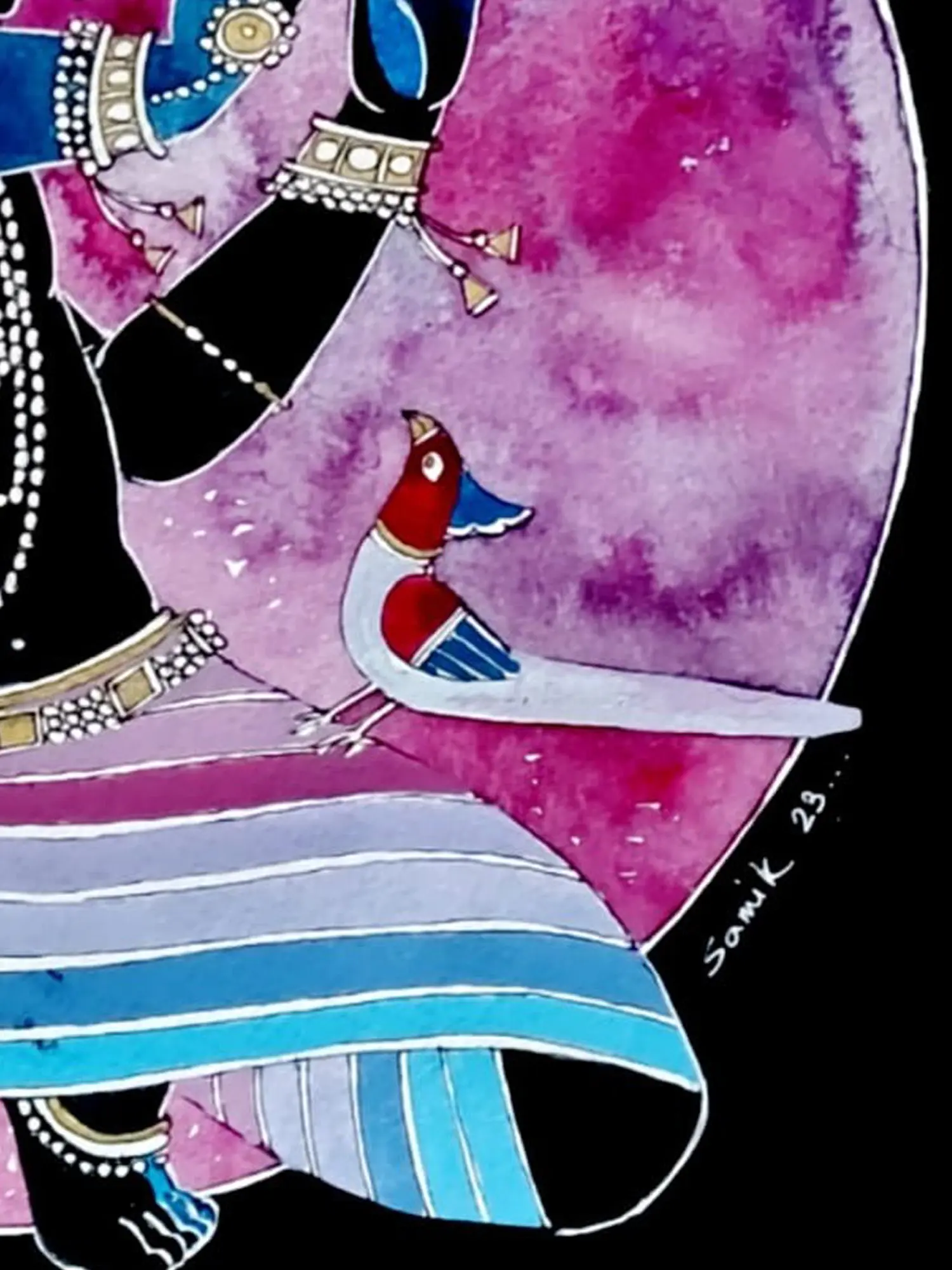 Artwork showcases vibrant blues, delicate pearl necklaces, and intricate golden embellishments.