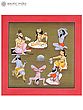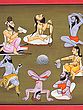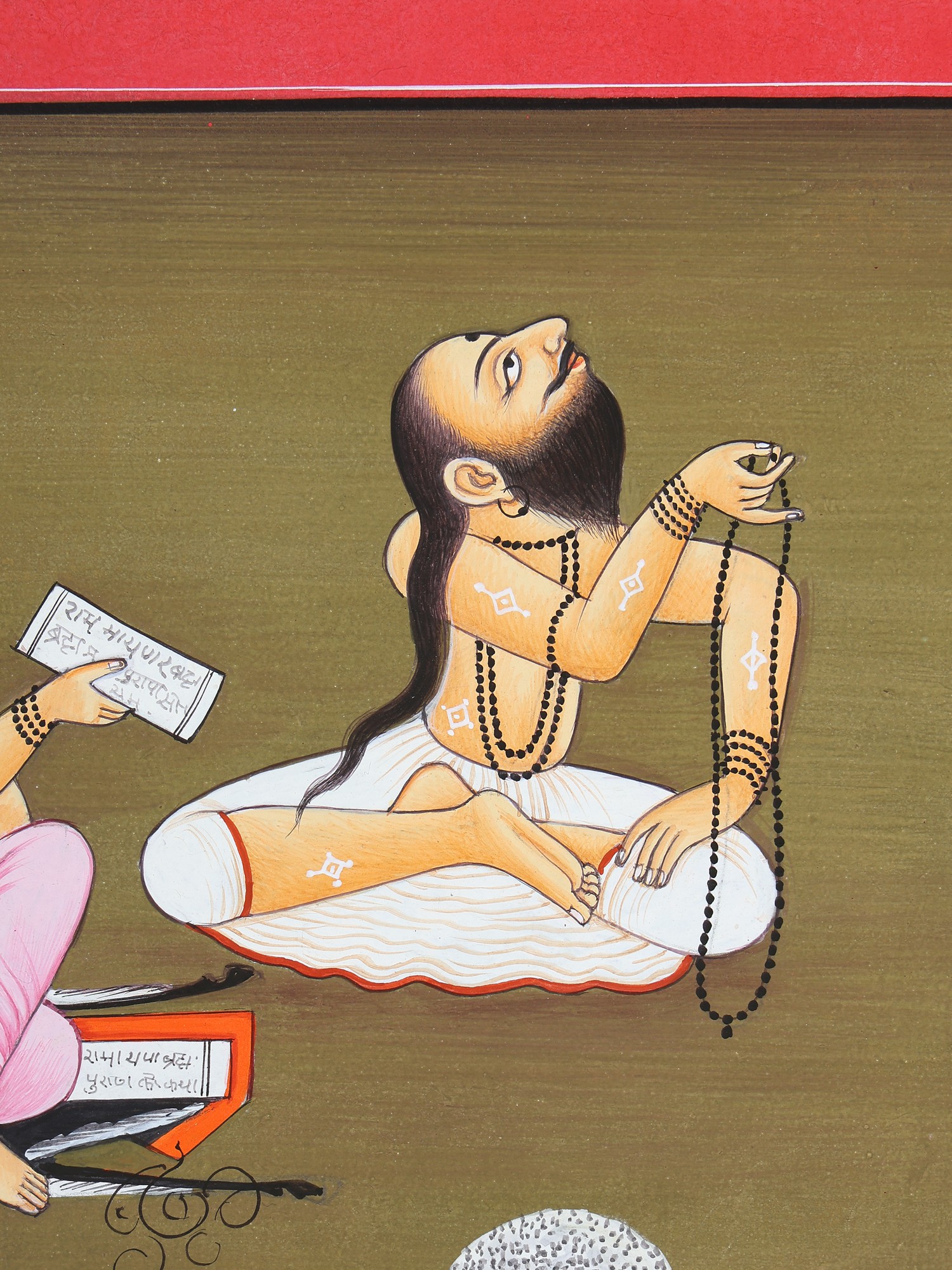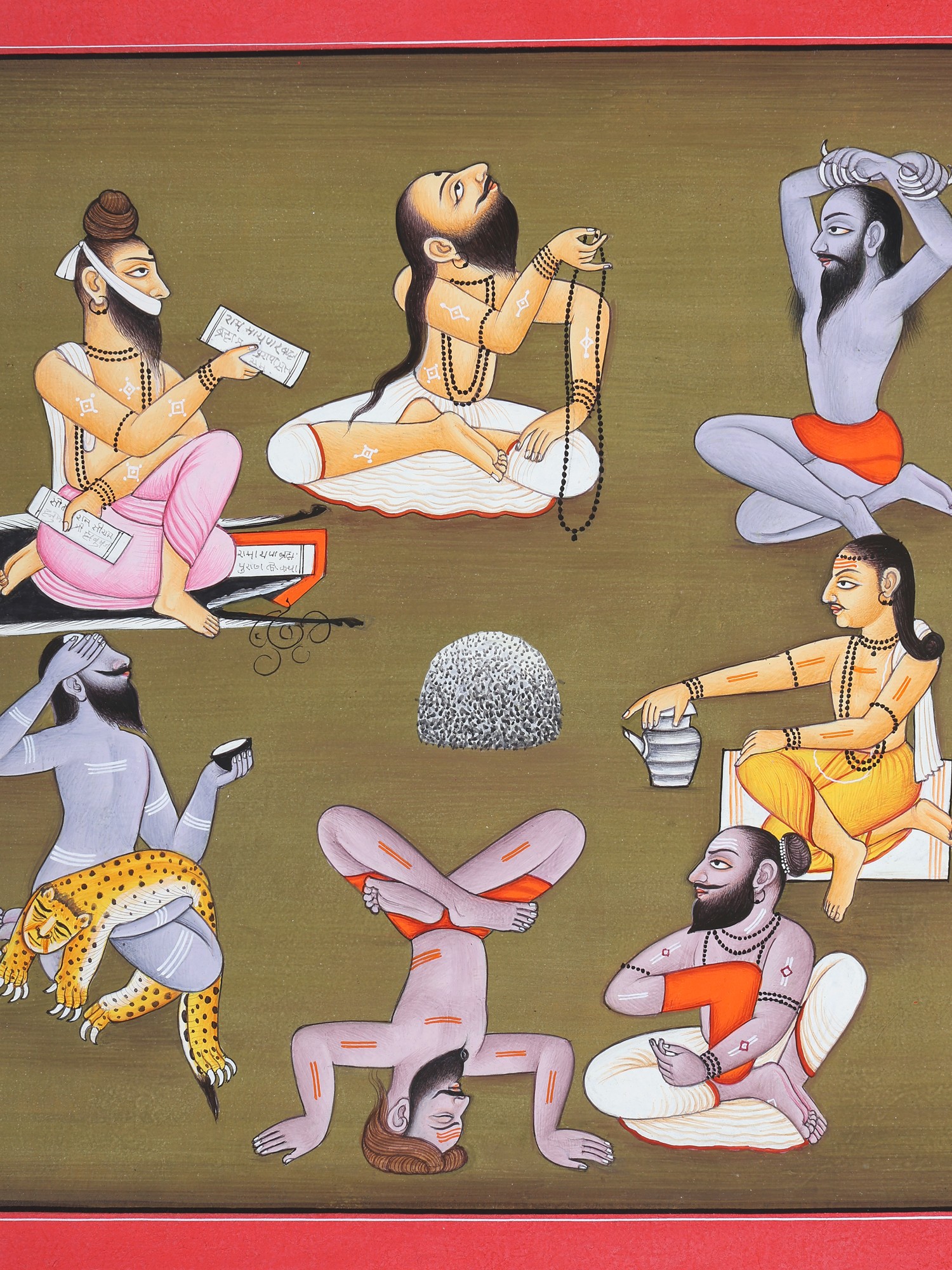 At the center in the top row sits Jamadagni, with his head thrown back, and his hair reaching his thighs. With the right hand he holds a long rosary.