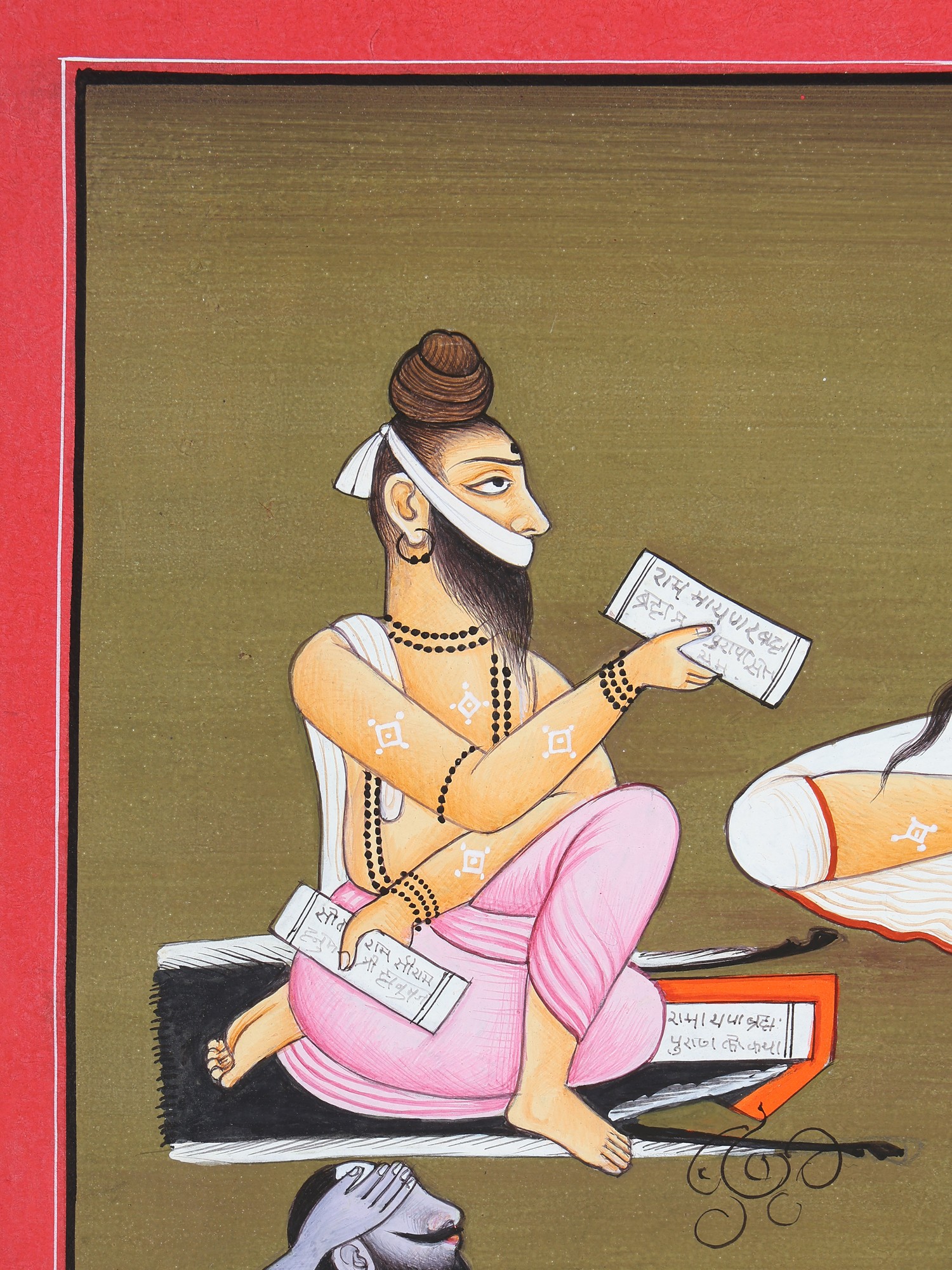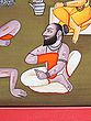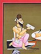 Last is Vishvamitra, rendered the most elaborate of all. Seated on an antelope skin, he holds in his hands various sacred texts, which also lie by his side. His mouth is bound with a cloth. This probably refers to a long vow of silence this seer is believed to have undertaken.