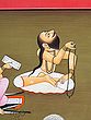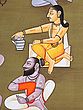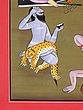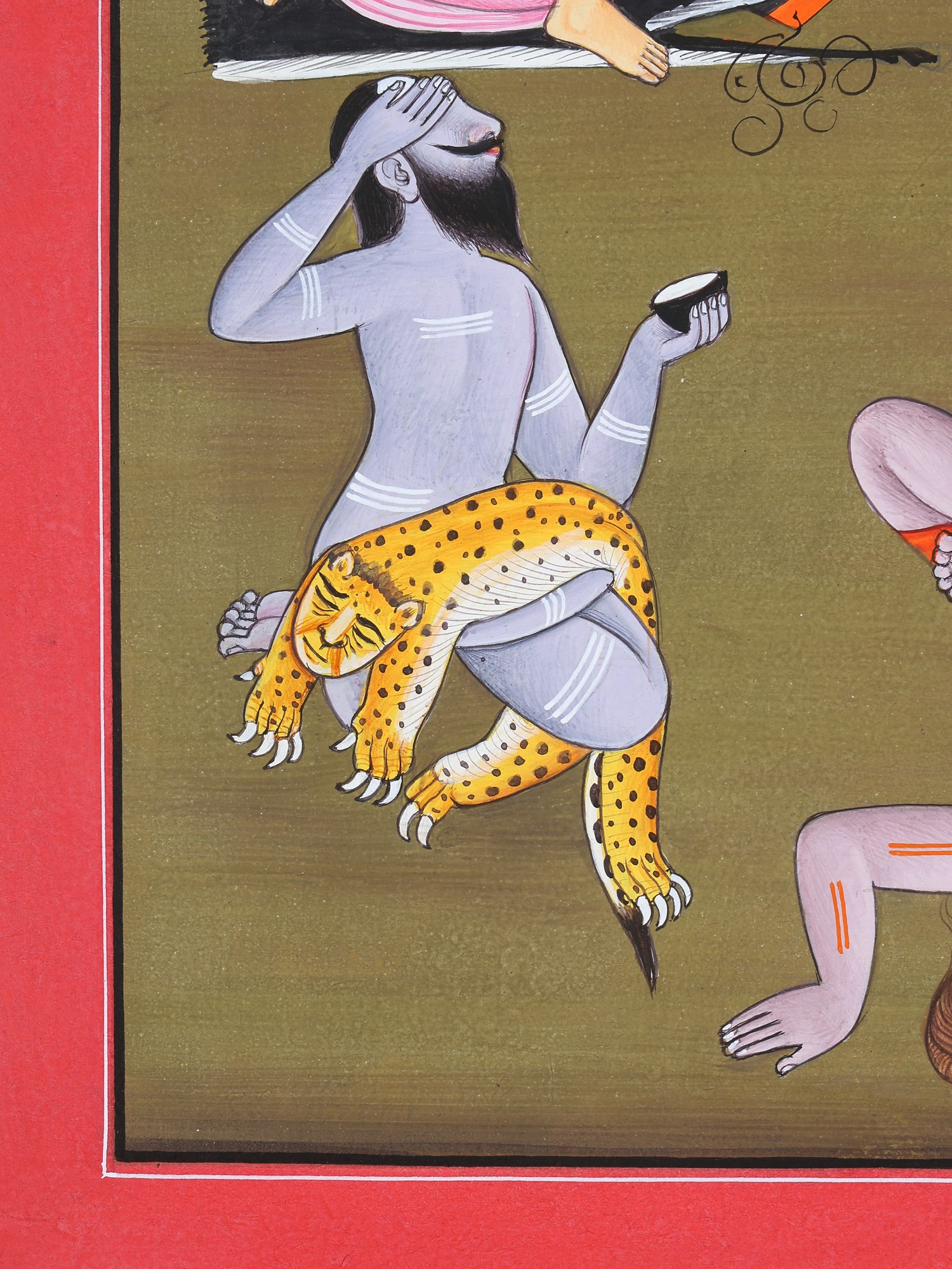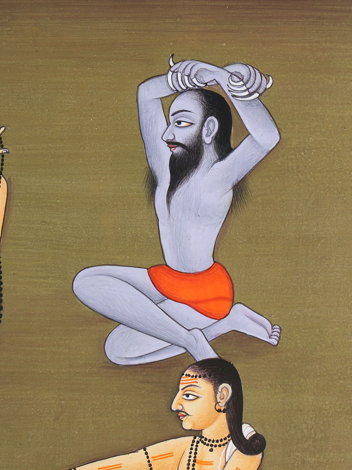 Kashyapa hods a coconut shell in his left hand, which holds ritual ashes which he has applied all over his body, and continues to do so on his forehead. He is bare except for a leopard skin.