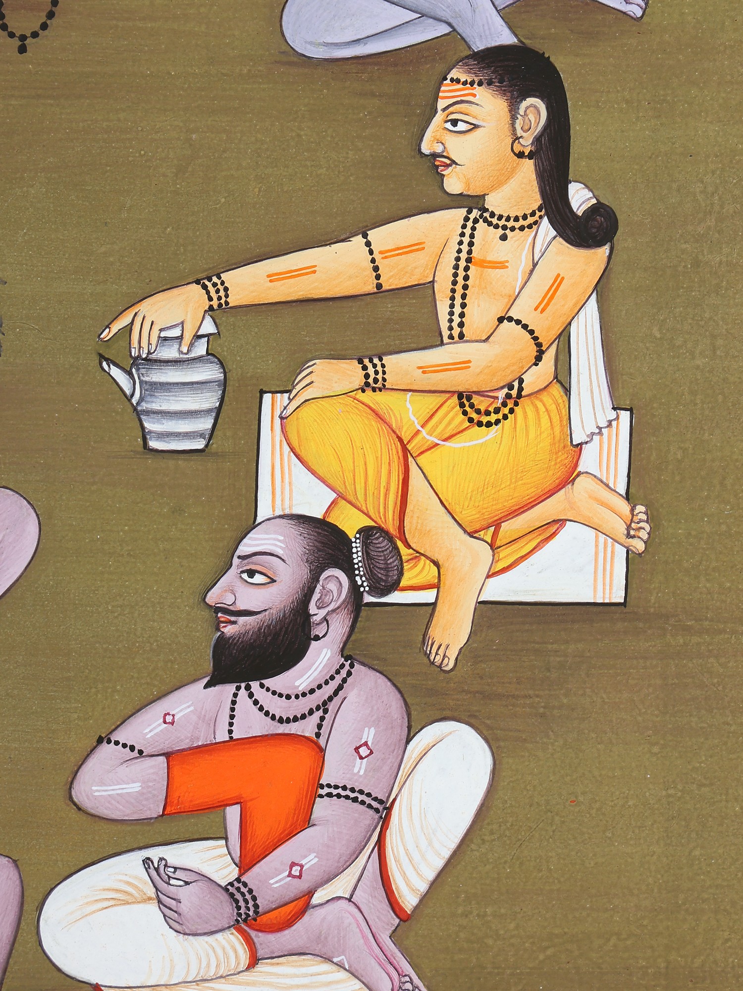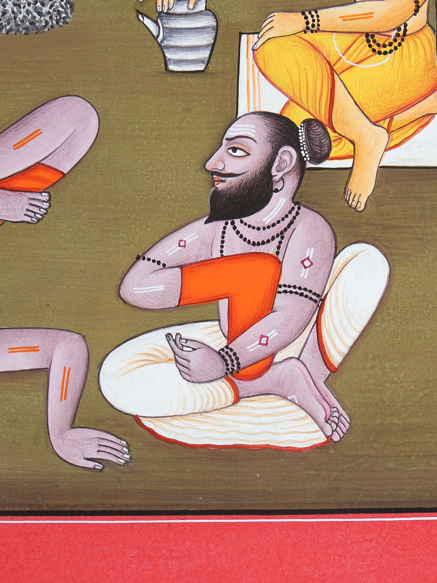 Vashishtha is next, holding in his extended right hand a ceremonial water vessel, his left hand resting on his right knee. He is adorned all over with tulsi beads, including his chest, wrists, upper-arms, and the crown on his head. He sits on a small white prayer mat.