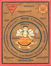 It seems, the artist when rendering this Sarva-siddhi-datri Devi form, had in his mind 'om ah priyadarshanaye namah' , that is, I salute the Devi who has a pleasant appearance, or 'Om aum vasankaraye namah', that is, I salute the Devi who pleases the eye. The lovely Devi thus combines in her cute figure, gold like complexion, large eyes and glowing face the essence of Shri or Lakshmi and Parvati, the examples of the supreme female beauty. As Martandeshvari the Devi in the painting carries Shiva's trident and as Vaishnavi the tortoise, a form of Vishnu's incarnation, and wings symbolising the Garun, his vehicle. Like Lakshmi she is clad in golden costume and is sitting like Parvati in padmashana and meditative posture. She has been painted in tattva-mudra, or the yogic posture characterising a seeker of cosmic essence.