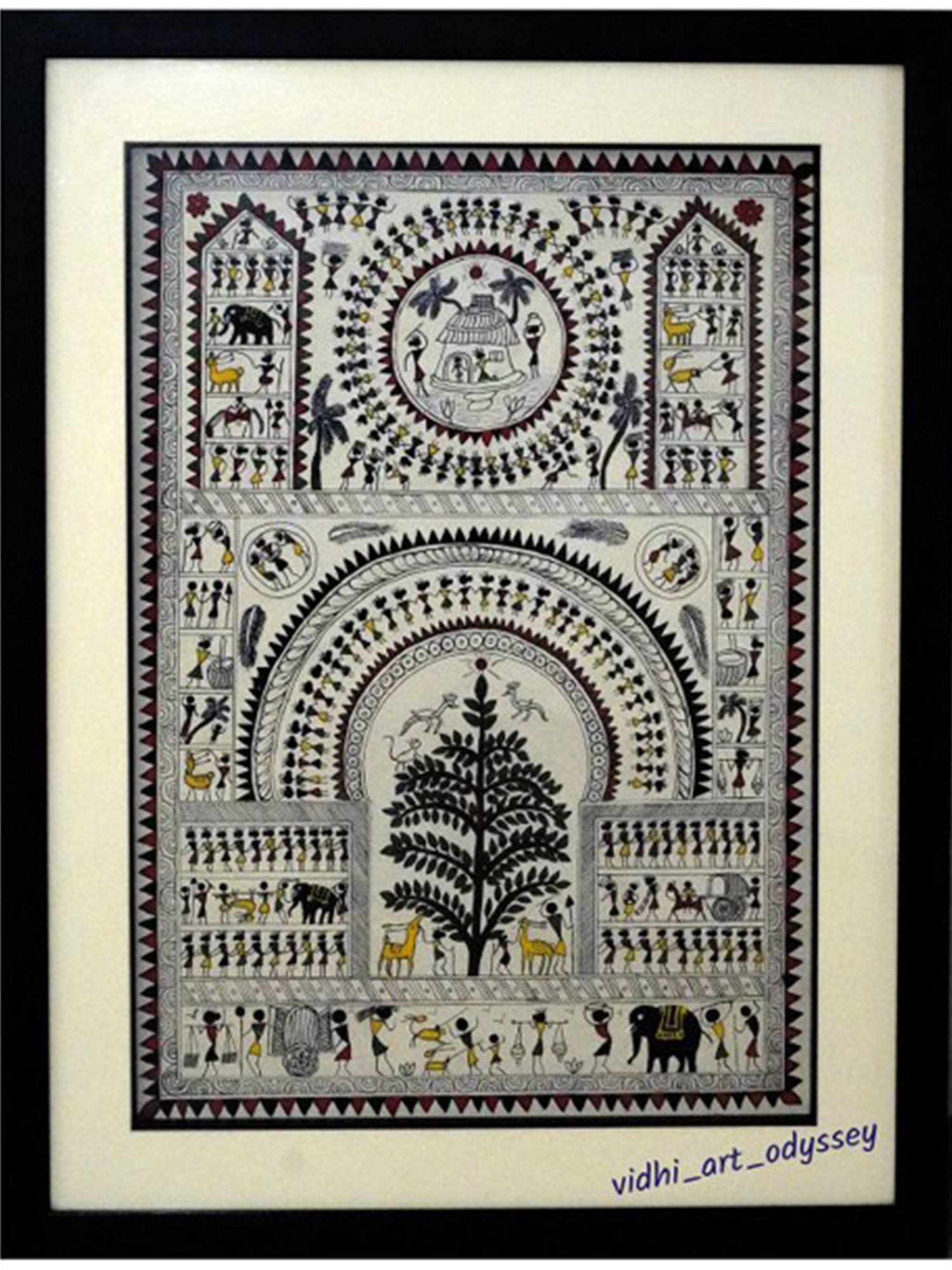 This exquisite acrylic painting on canvas transports the viewer to the heart of Mithila, a region steeped in history and vibrant artistic traditions. Rendered in the distinctive style of Mithila art, also known as Madhubani painting, this piece by Vidhi Joshi is a testament to a cultural heritage that has been passed down through generations. The artwork is characterized by its intricate geometric patterns, bold outlines, and a symbolic language that tells stories of daily life, mythology, and nature. The Saura art style, which draws inspiration from the indigenous Saura people of Odisha, is woven into the narrative. The Saura, known for their deep connection to nature and their animistic beliefs, often depict their world through simple yet powerful imagery. This painting masterfully blends these influences, creating a visual tapestry that is both ancient and contemporary. In Saura mythology, the depiction of trees often symbolizes life, growth, and the connection between the earthly and spiritual realms. The central tree in this artwork, with its sprawling branches, can be seen as a representation of the Tree of Life, a concept present in many cultures, symbolizing abundance, fertility, and the cyclical nature of existence.