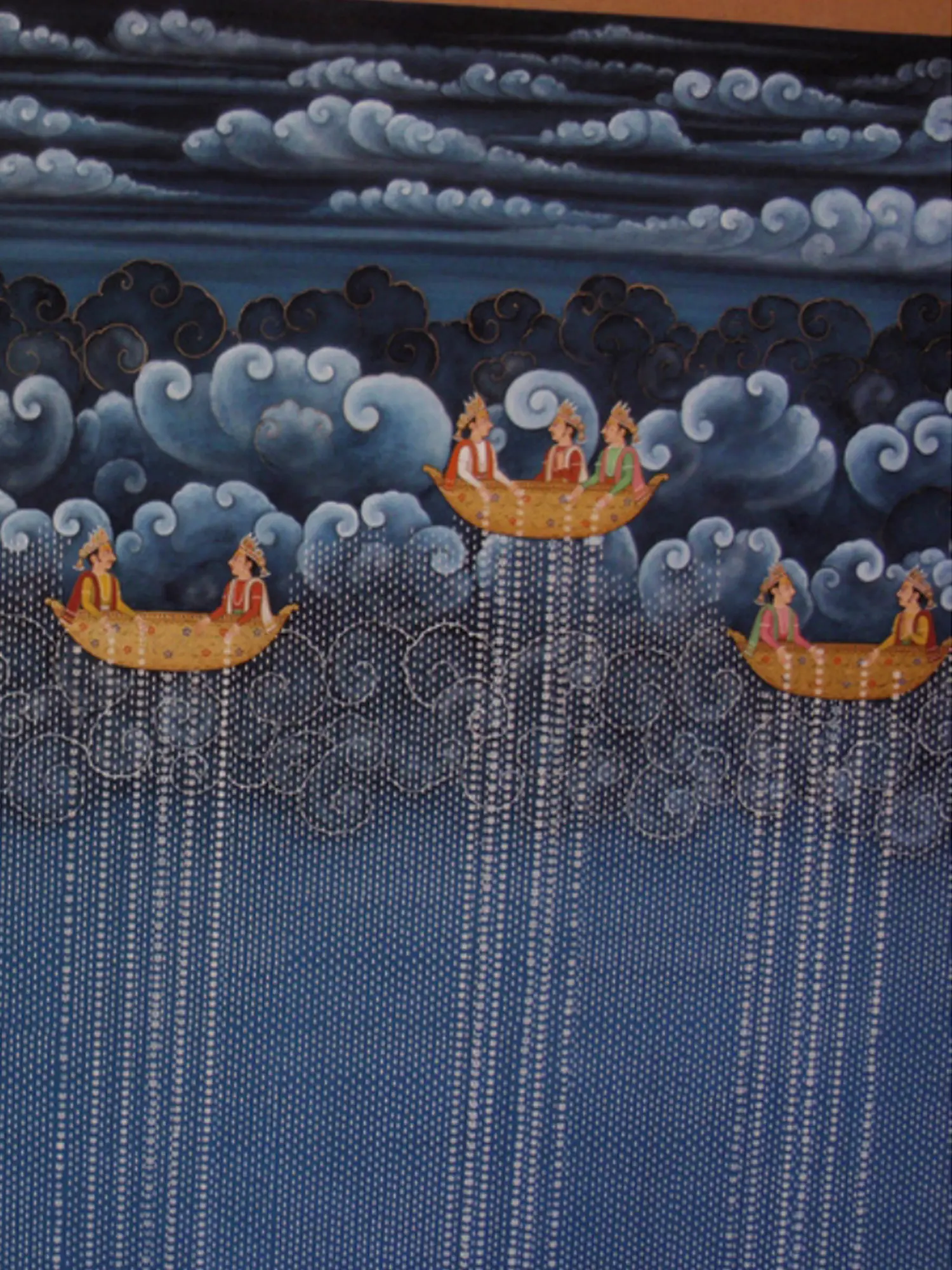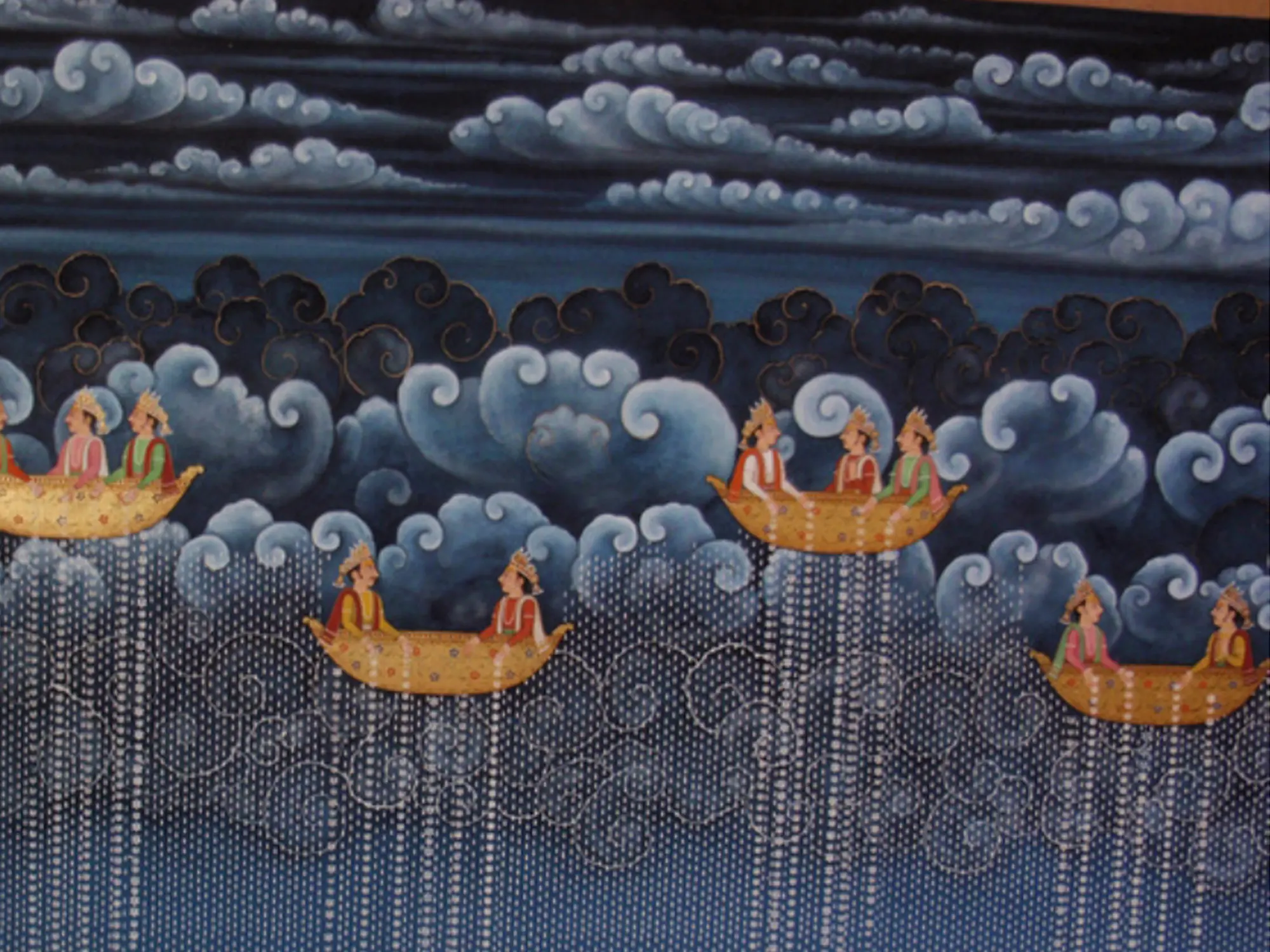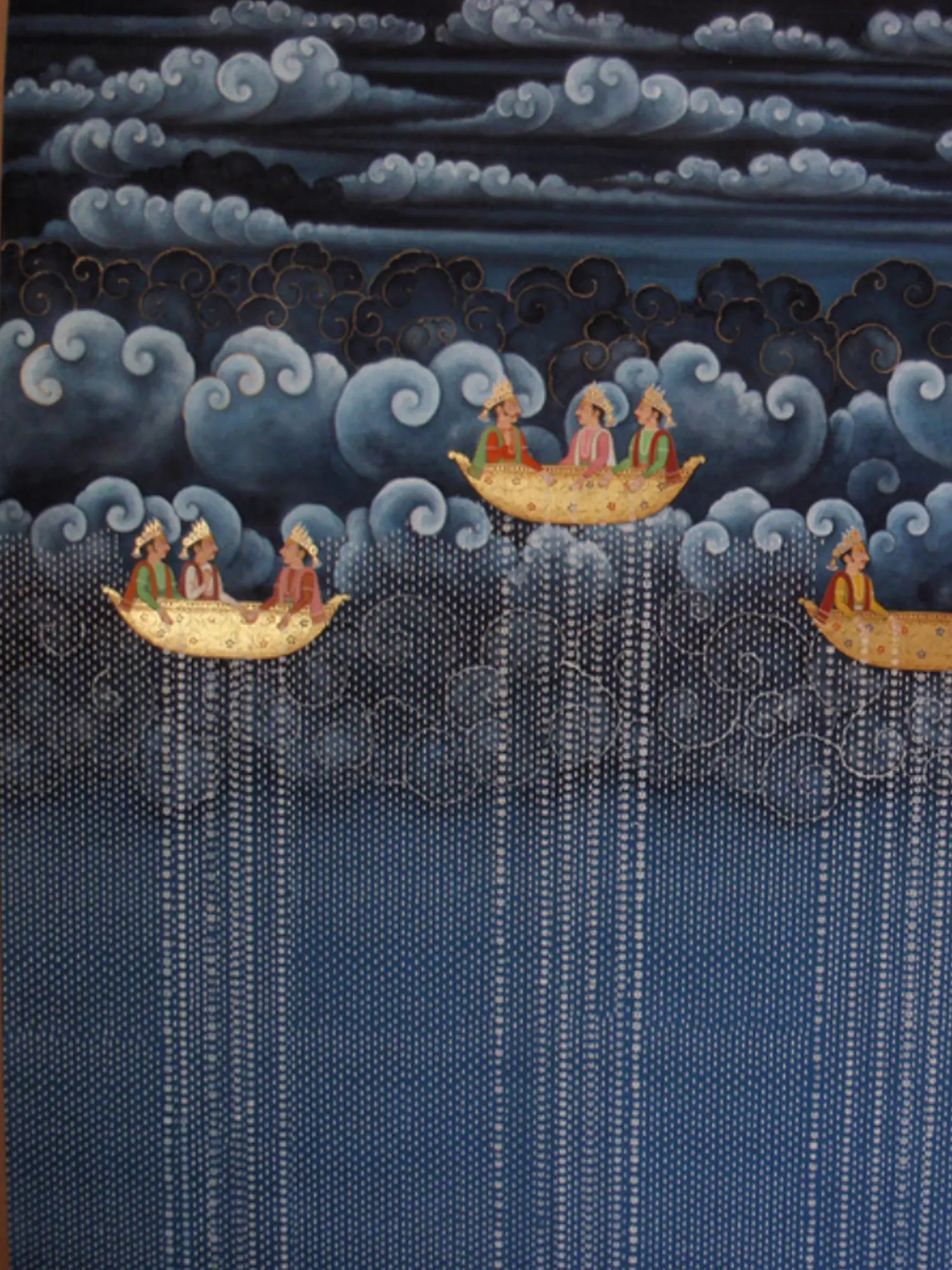This artwork draws inspiration from the rich visual narratives and mythological tales found in Indian art. The depiction of figures in boats navigating the skies evokes ancient stories of gods and celestial beings traversing the heavens. You will discover a profound connection to a heritage that celebrates imagination and the spiritual journey.