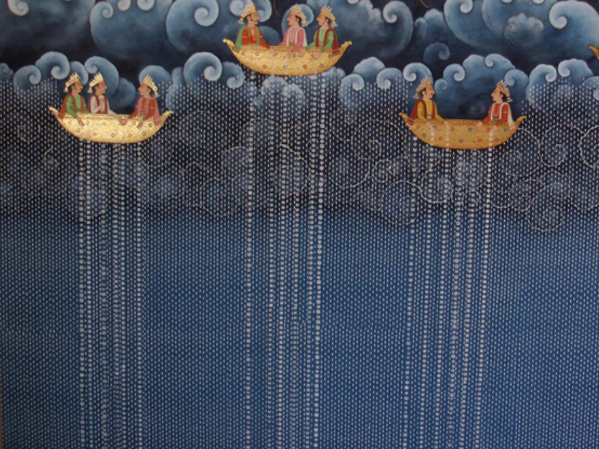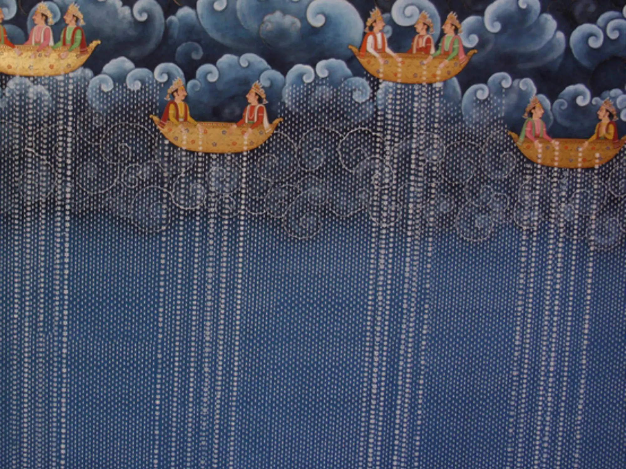 The composition unfolds across a dramatic sky, where swirling, moonlit clouds are rendered with exquisite detail. Suspended within this celestial expanse are golden vessels, each carrying elegantly depicted figures adorned with traditional crowns and vibrant attire. From these airborne ships, a cascade of shimmering droplets descends, creating a mesmerizing visual of either rain or stardust.