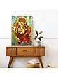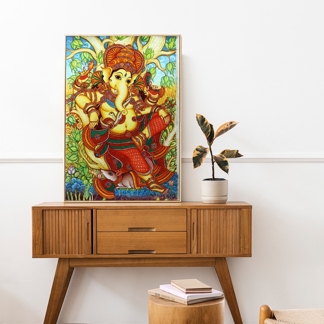 A lively, vividly coloured Ganesha painting to brighten up your home or office space. A Kerala mural executed on a mobile canvas, this painting is a fine, authentic example of this traditional art form. It depicts a bright-eyed Lord Ganesha seated in lalitasana at the base of a tree trunk. The foreleg of the pendant leg rests on the back of His vahana, the mouse.