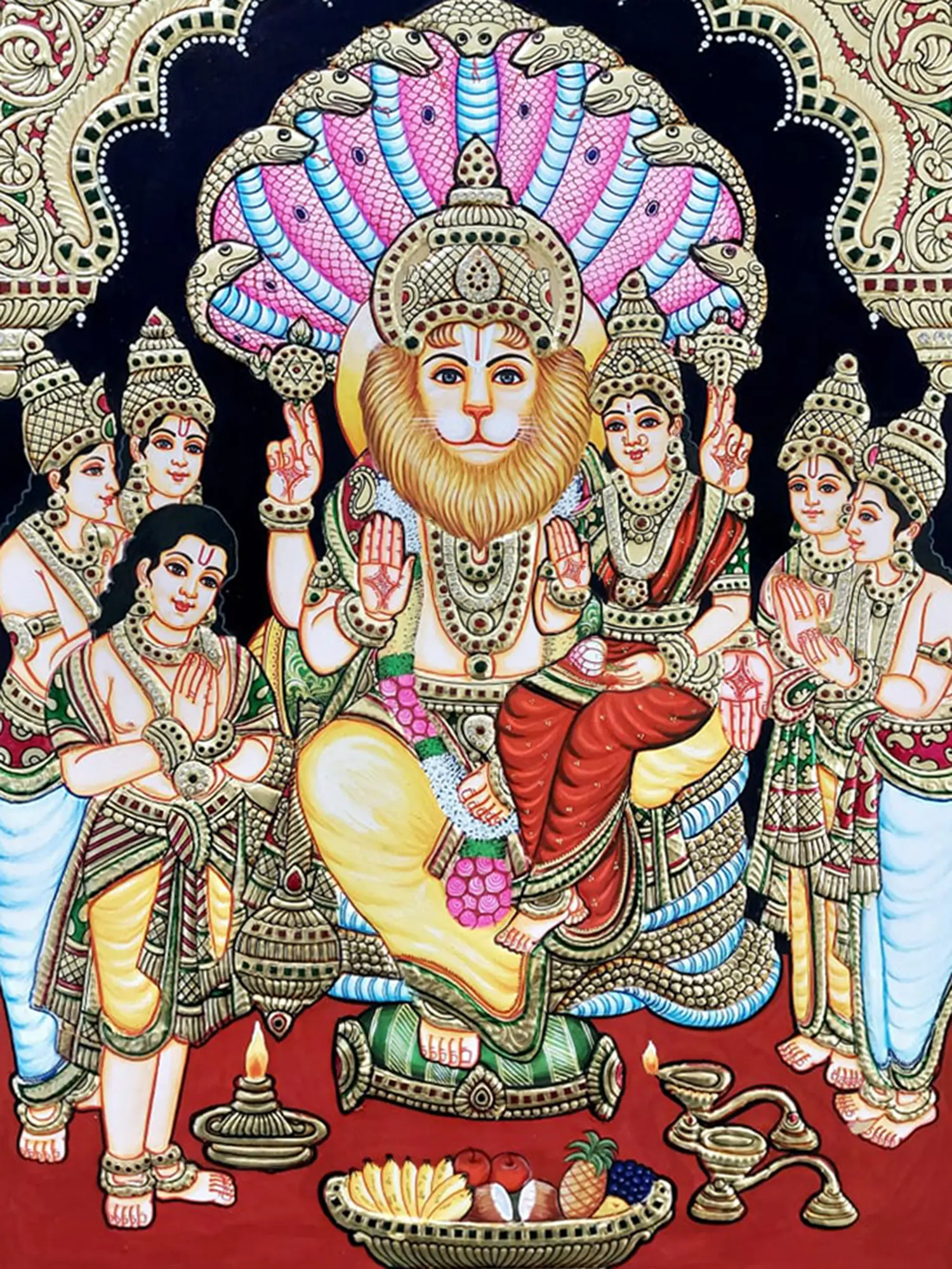With lamps and fruits laid out in the foreground, this Tanjore is a divine temple for the devotees of Sri-Narasimha.
