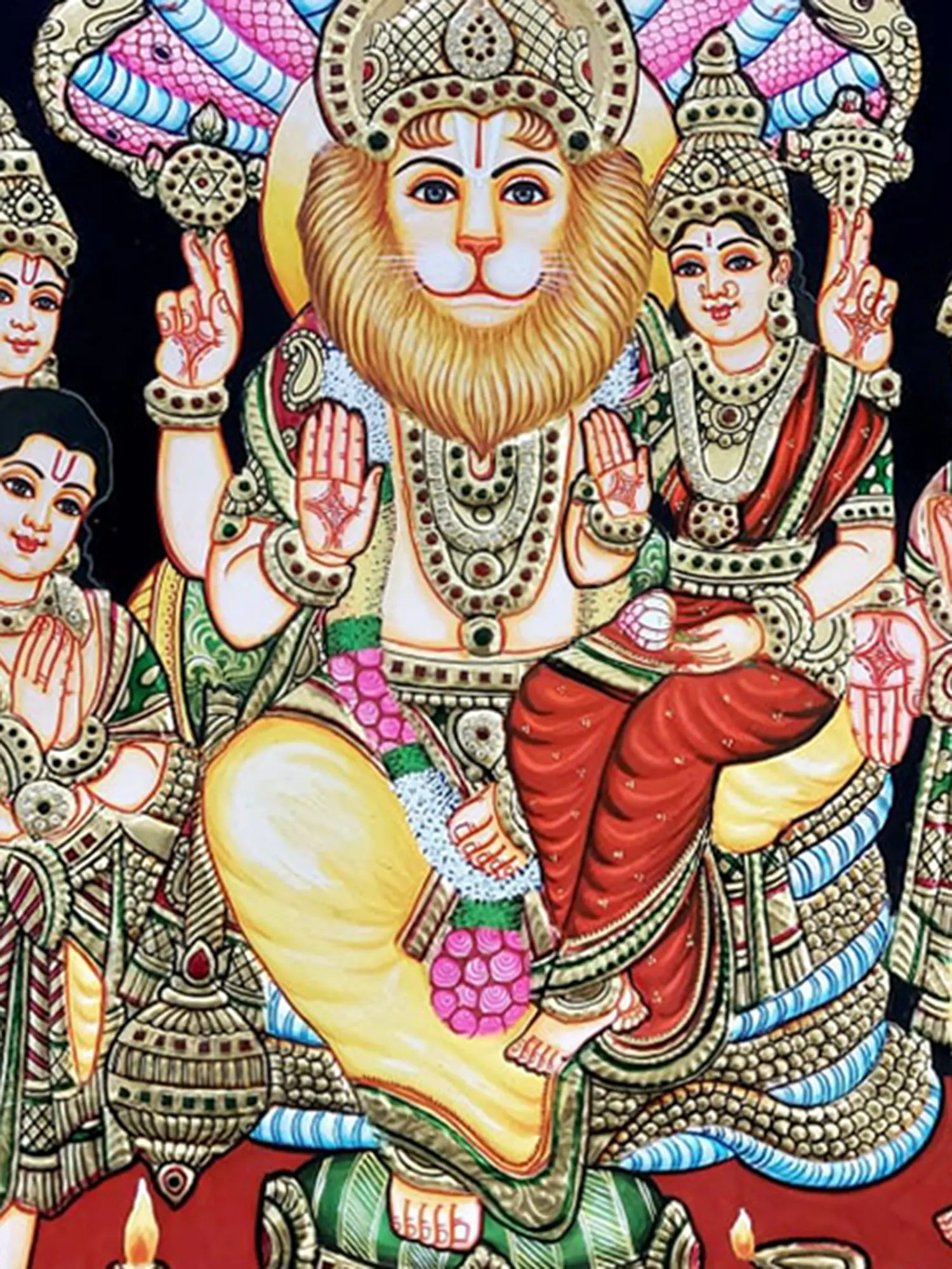 The powerful man-lion form of Vishnu, Lord Narasimha, is shown in this Tanjore artwork with a celestial air of protection and sovereignty.