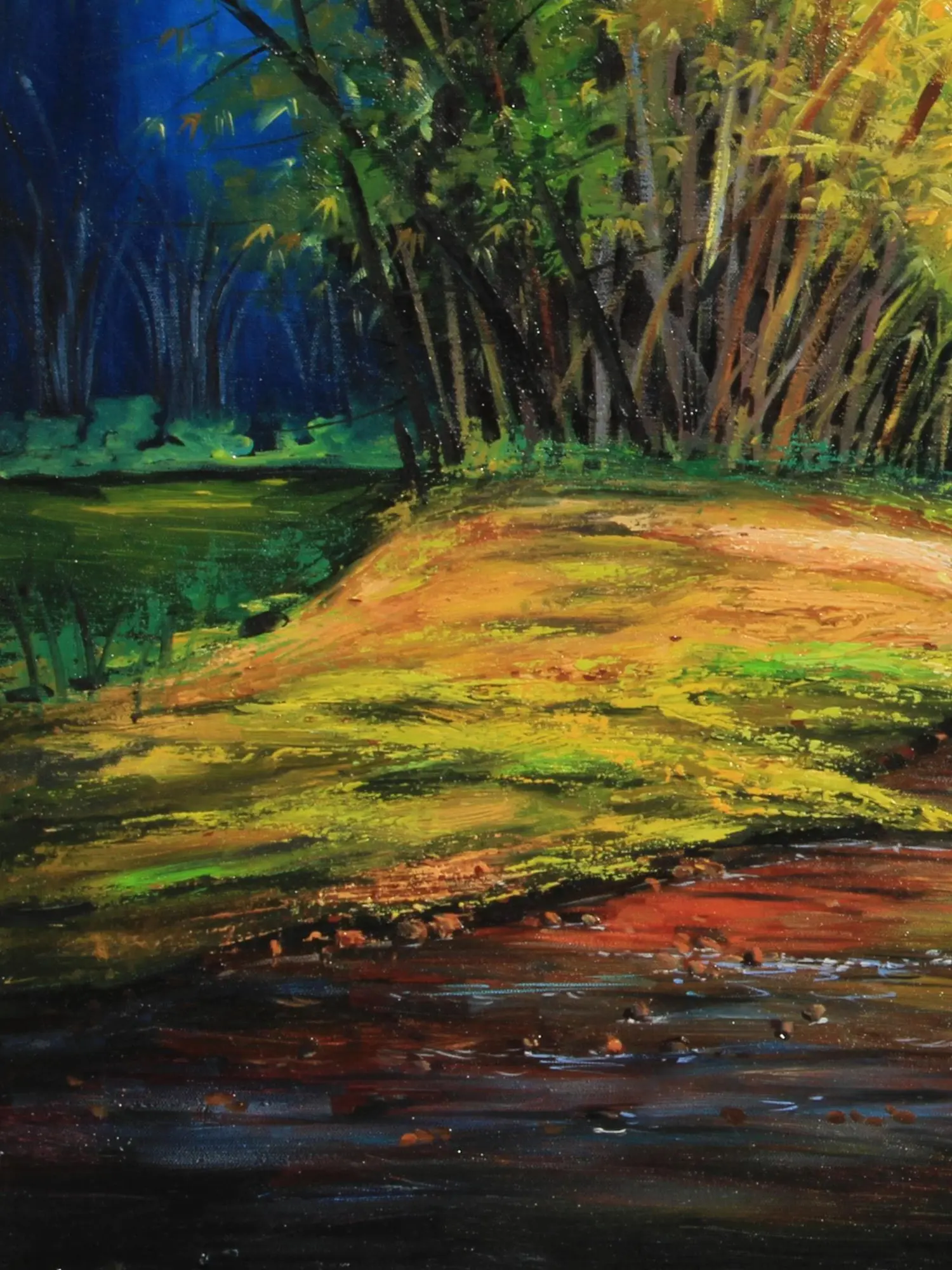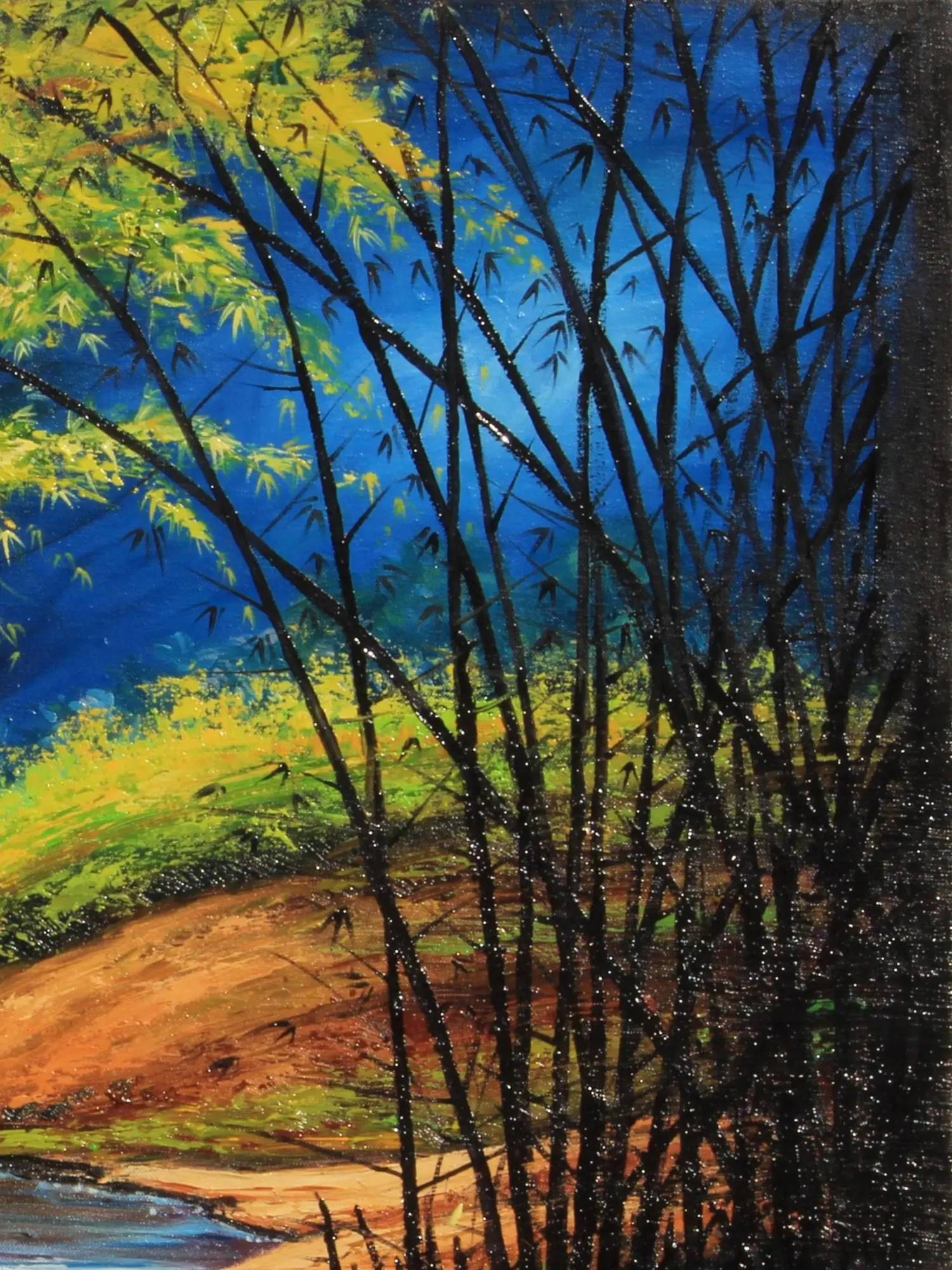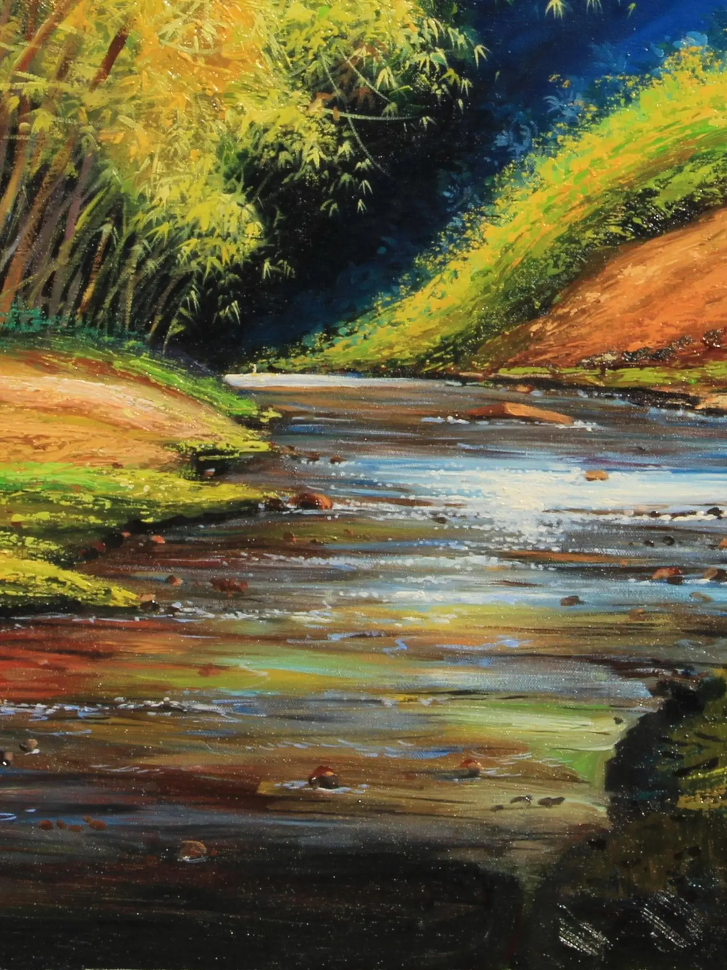 Observe the dynamic interplay between the verdant bamboo grove and the winding stream, rendered in a generous 30 inches in height and 40 inches in width. The cool blues of the background contrast beautifully with the warm, sun-kissed earth and the shimmering reflections in the water. You will appreciate the delicate rendering of the bamboo stalks, some standing stark against the vibrant foliage, while others are softened by the atmospheric perspective. The artist's masterful use of color and light guides your eye through the composition, revealing hidden details and inviting contemplation.