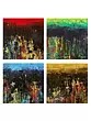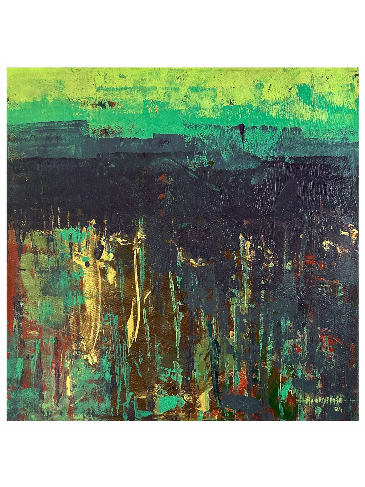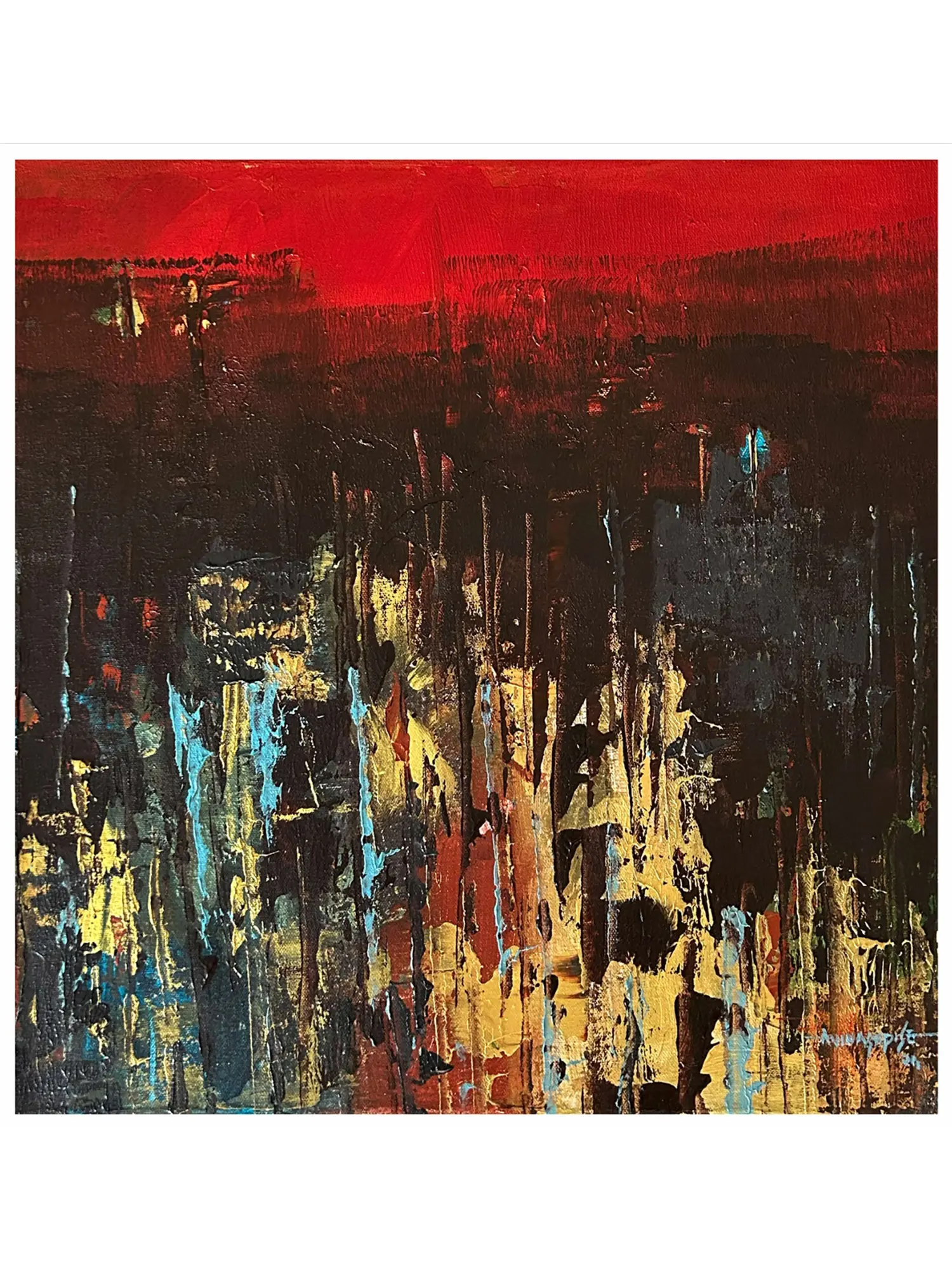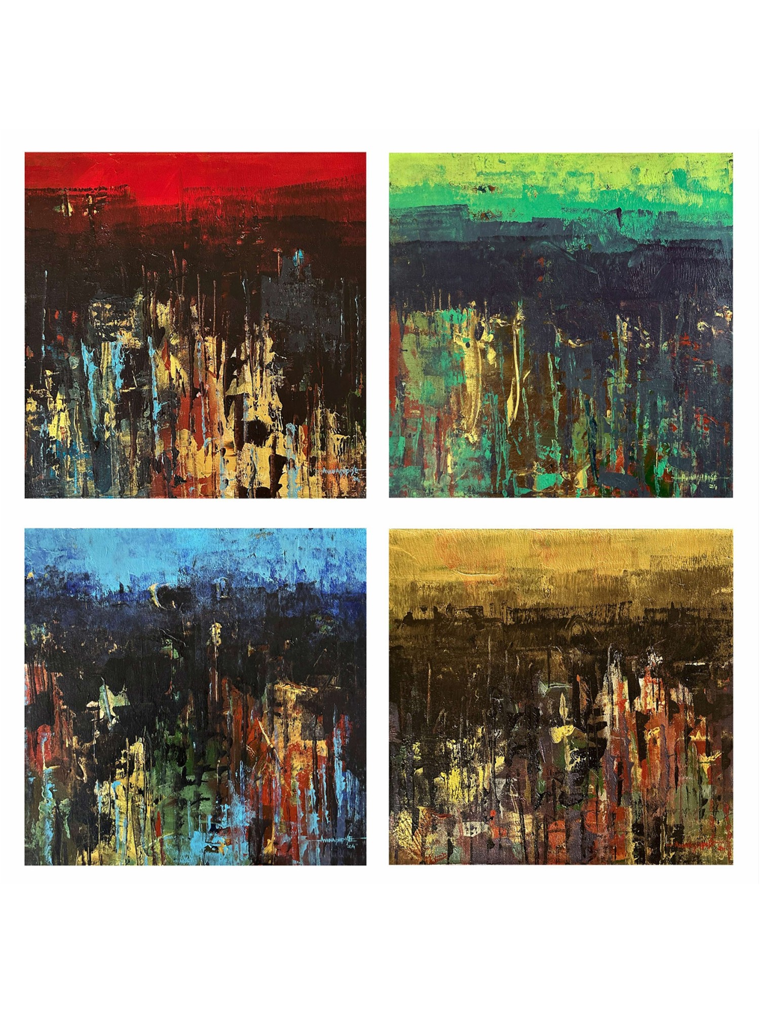 Each of the four 15-inch square canvases pulsates with its own distinct chromatic energy, unified by a shared abstract landscape. You'll find bold horizons of fiery red, tranquil greens, serene blues, and warm golden hues that cradle darker, textured terrains below. These lower registers burst with vertical streaks of complementary colors—ochre, crimson, cyan, and moss—suggesting a vibrant energy breaking through the earth. The interplay of light and shadow, achieved through skilled application of paint, adds an exquisite complexity.