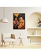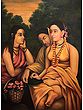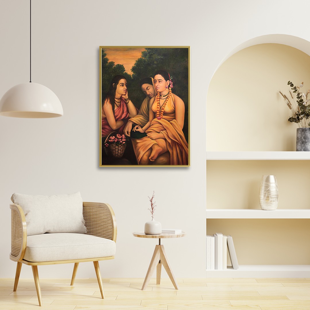 A reproduction of Ravi Varma’s “Shakuntala Patra Lekhan” (Writing of a Letter by Shakuntala), this oil on canvas depicts Shakuntala surrounded by two of her confidants, Anasuya and Priyamvada, holding a lotus leaf, lost in her search for the right verse to be etched on the surface of the leaf. The sky in the background is painted orange- the misty white of the clouds mixed with the fiery rays of the sun creating a fitting backdrop for the inner tumults of Shakuntala. She is dressed in the attire of the residents of forest, in a saffron sari and ornaments made from the wildflowers and rosary beads. A wicker basket full of blossoms is placed near her.