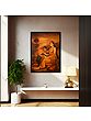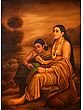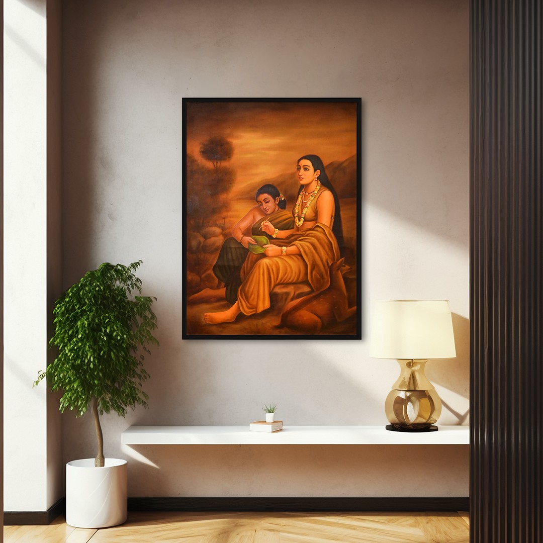 A faithful cur sits right next to her, looking across the river. The twin presence of her canine companion and her compassionate friend, infinitesimally comforts the heartbroken Shakuntala. The river flows quietly in the background, as if not to disturb her train of thought, and the sunset skies lend a dark glow to the dense trees and hills.